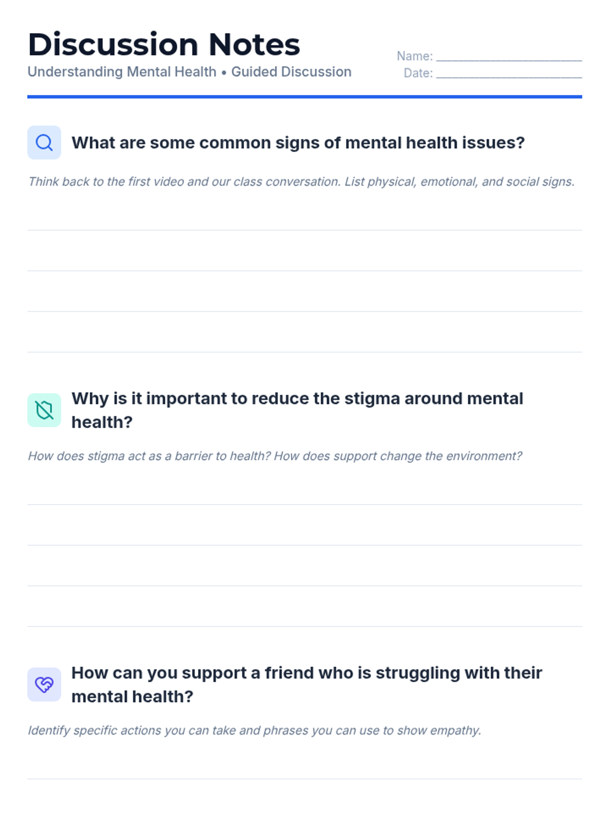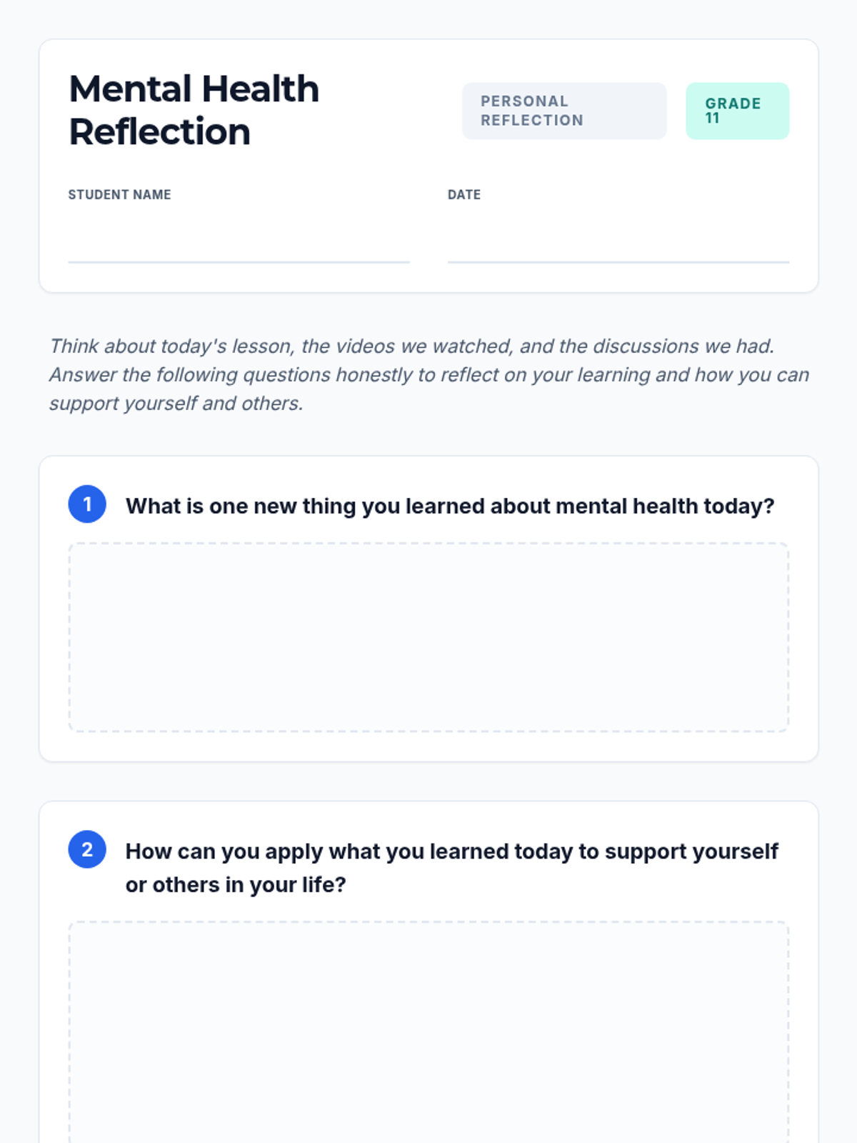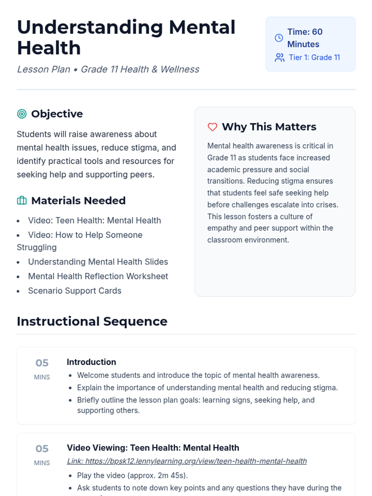 A comprehensive lesson designed for Grade 11 students to raise awareness about mental health, reduce stigma, and provide practical tools for seeking help and supporting peers through videos and discussions.