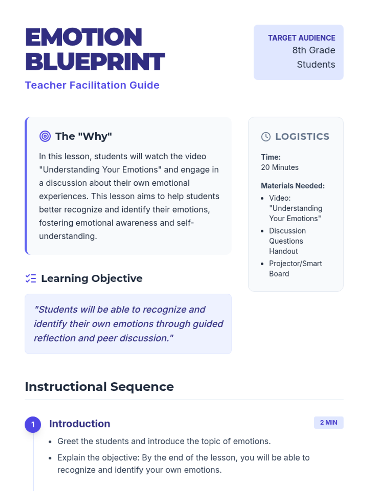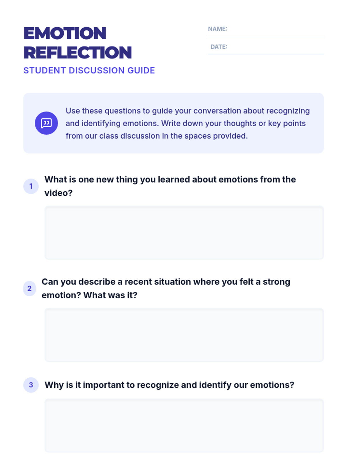 An introductory lesson for 8th graders to help them recognize and identify their emotions through a video and interactive discussion. Students explore the nature of emotions and brainstorm practical ways to increase emotional awareness in their daily lives.