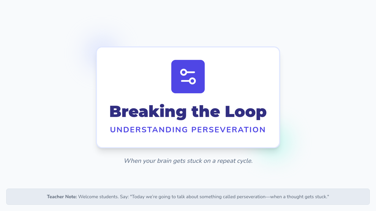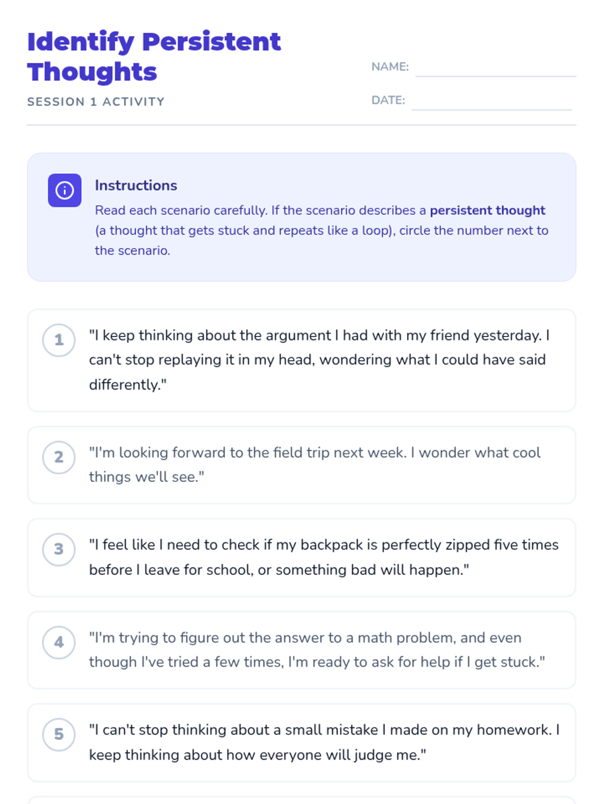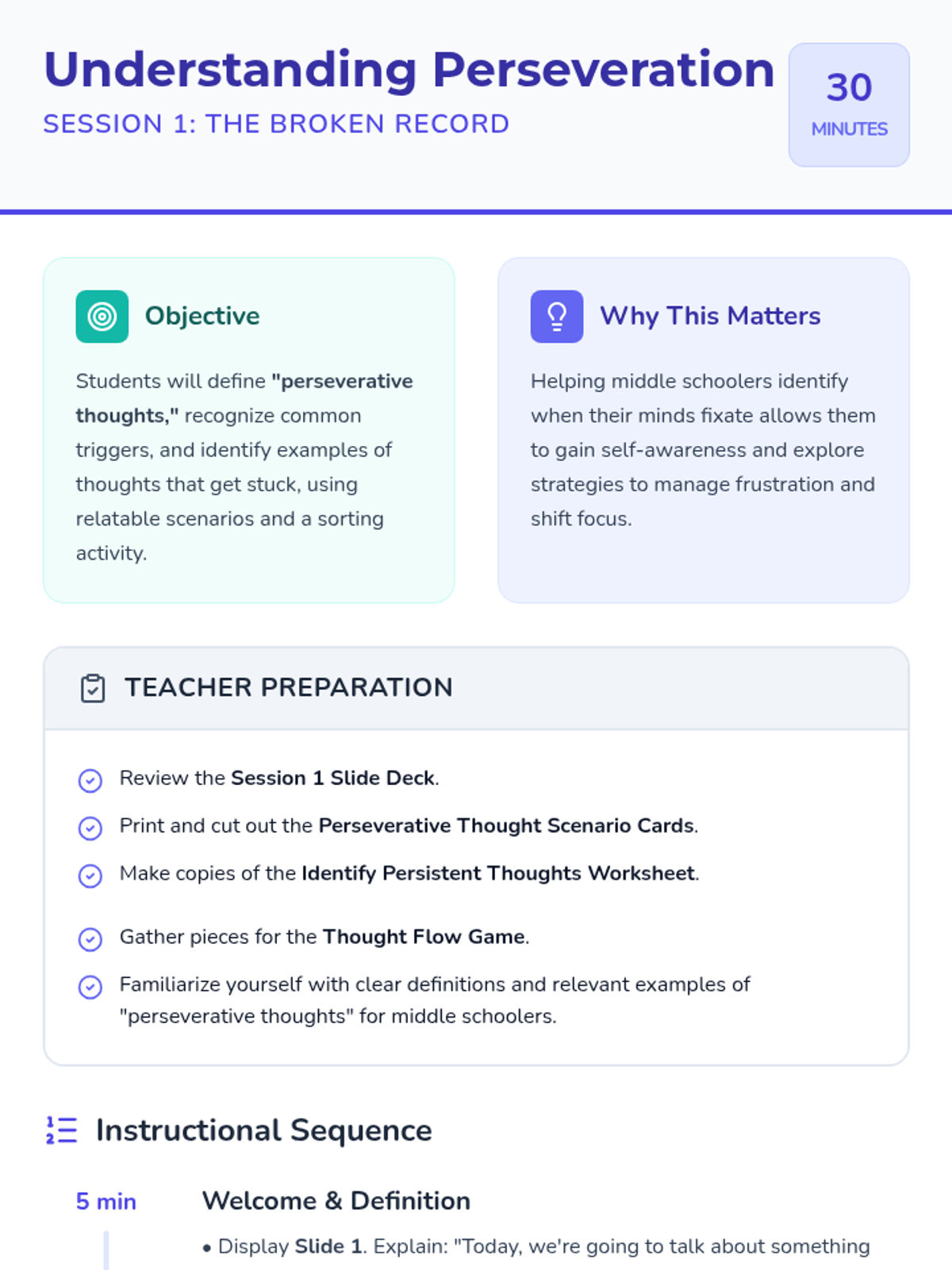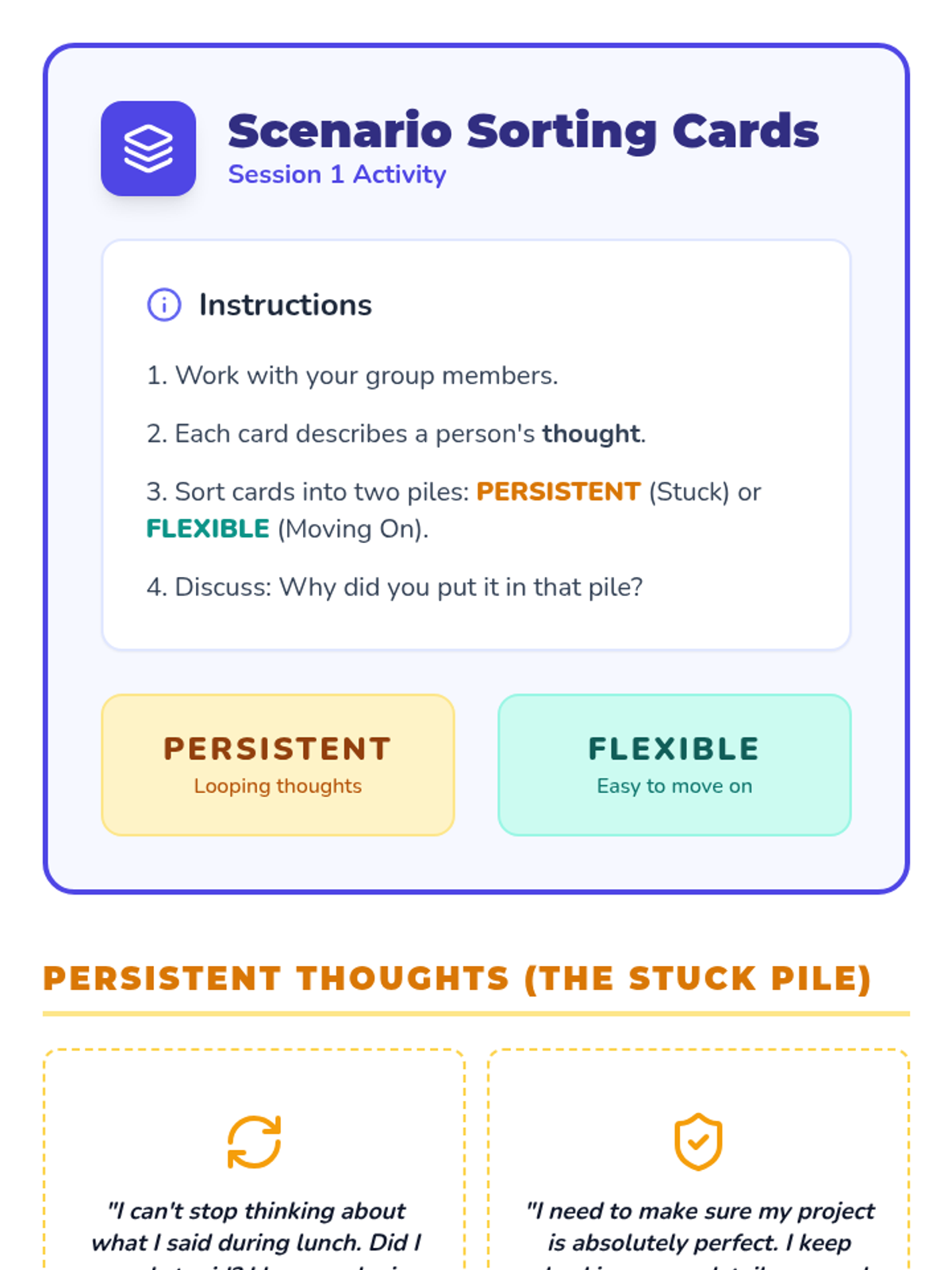Students define 'perseverative thoughts,' recognize common triggers, and identify examples of thoughts that get stuck versus flexible thoughts.