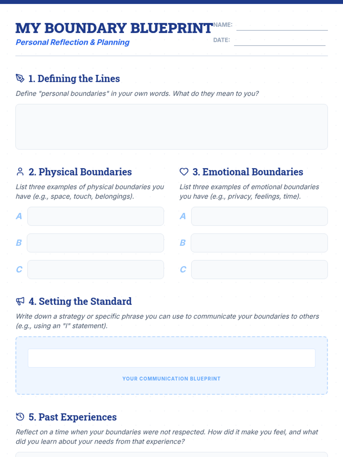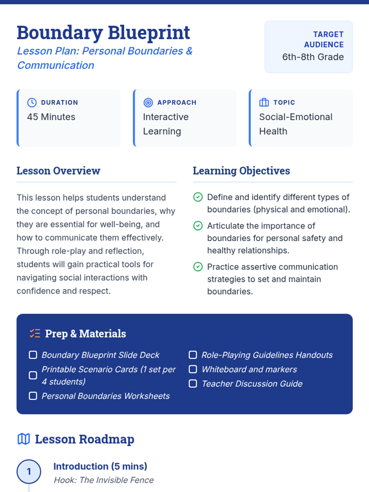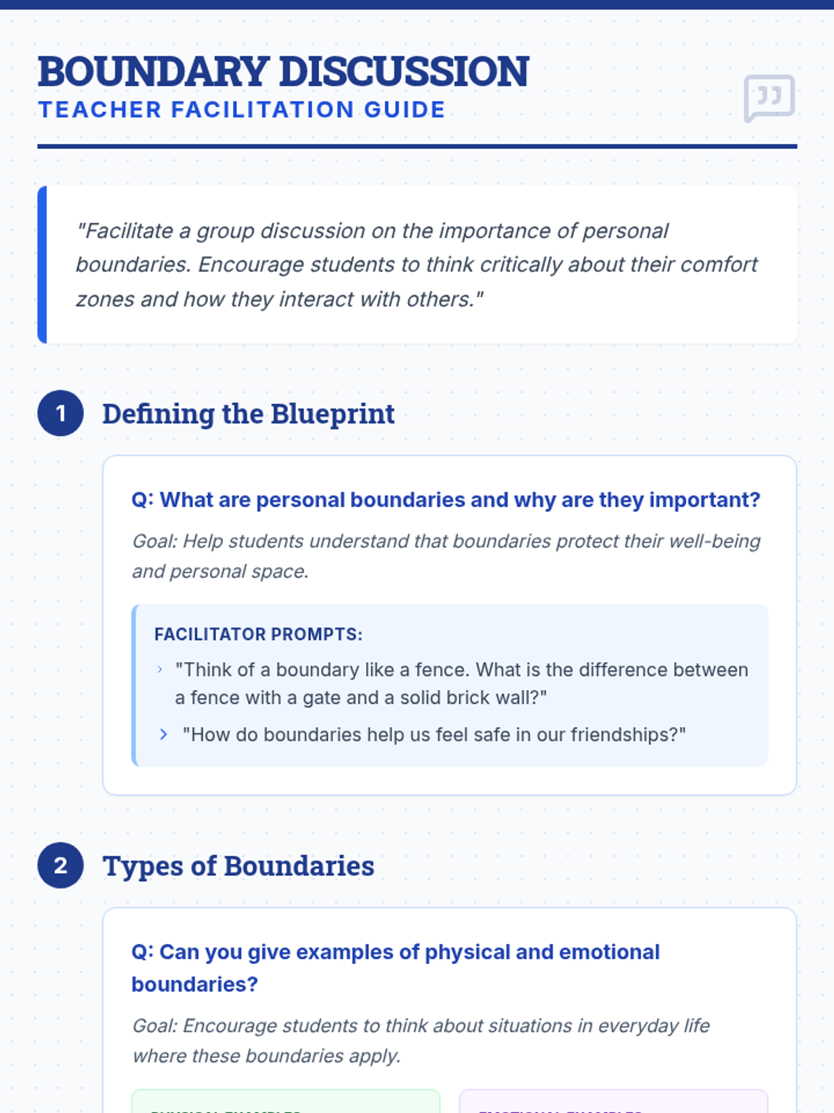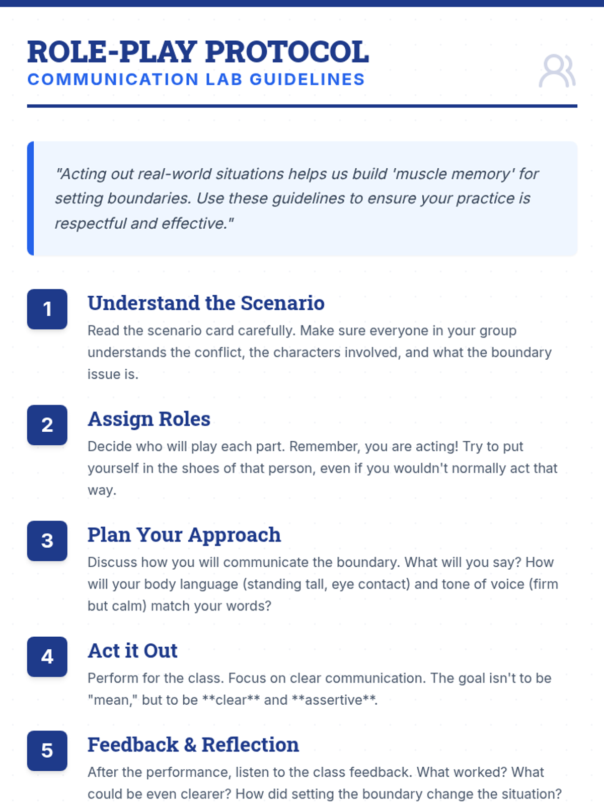 A middle school lesson focused on identifying, communicating, and respecting physical and emotional boundaries through role-play and reflection.