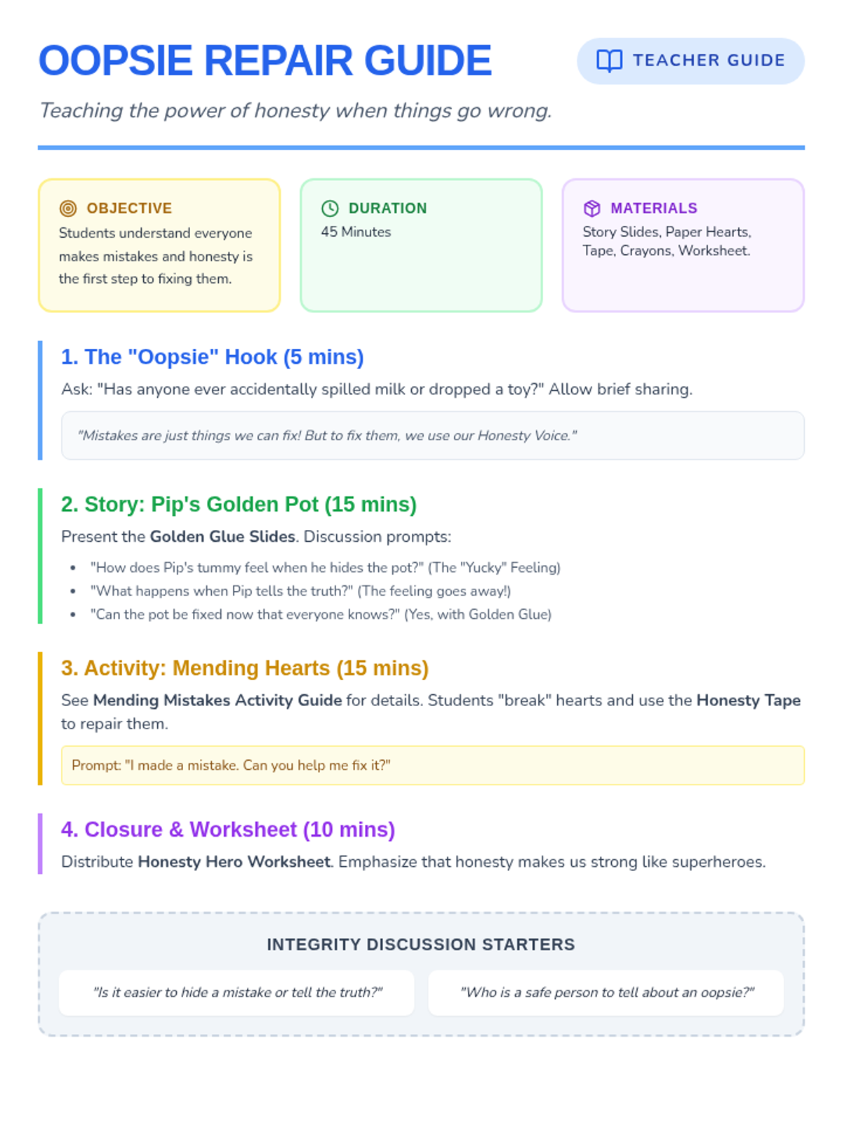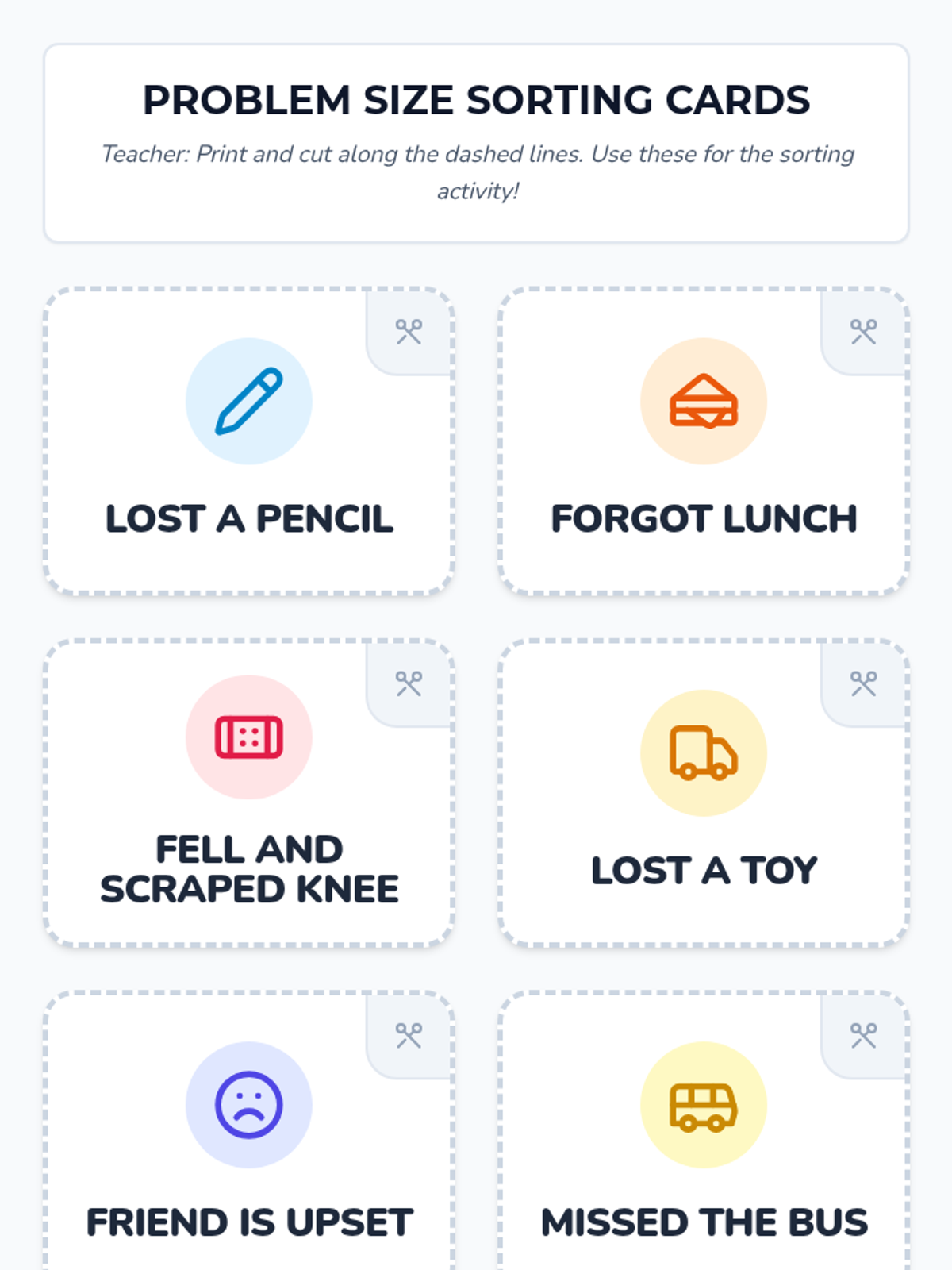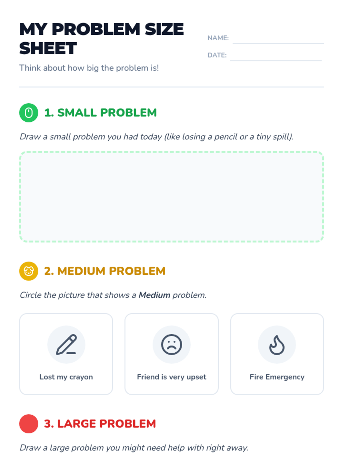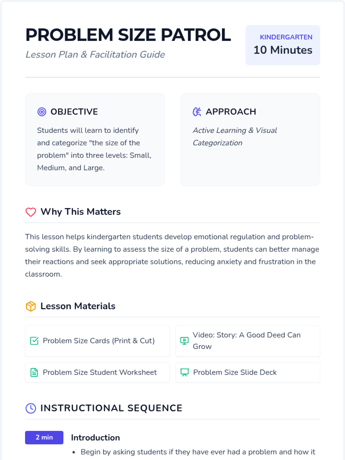 This lesson helps kindergarten students understand the concept of the 'size of the problem' by categorizing problems as small, medium, or large. This understanding is crucial for developing problem-solving skills and emotional regulation. By learning to assess the size of a problem, students can better manage their reactions and seek appropriate solutions.