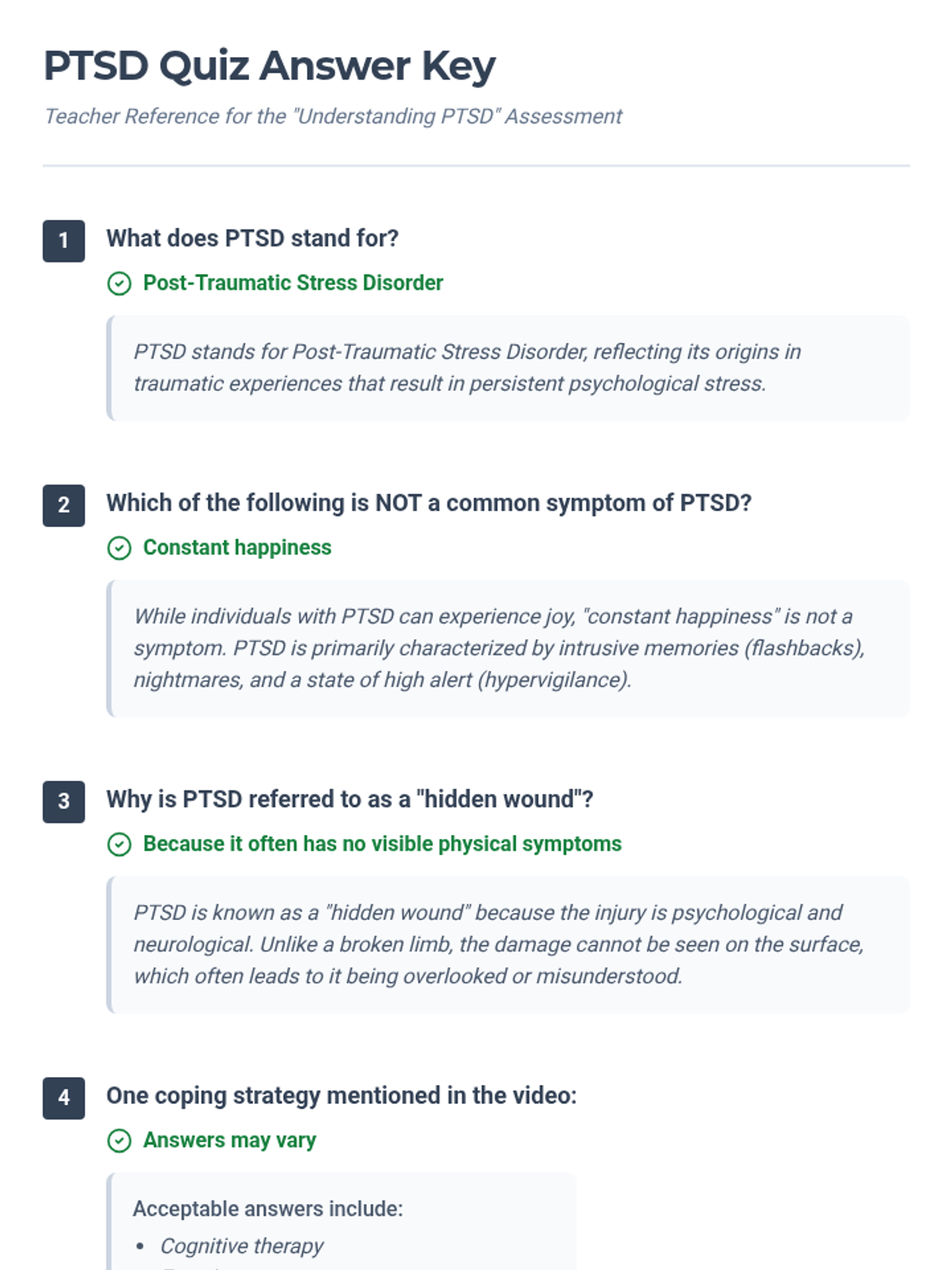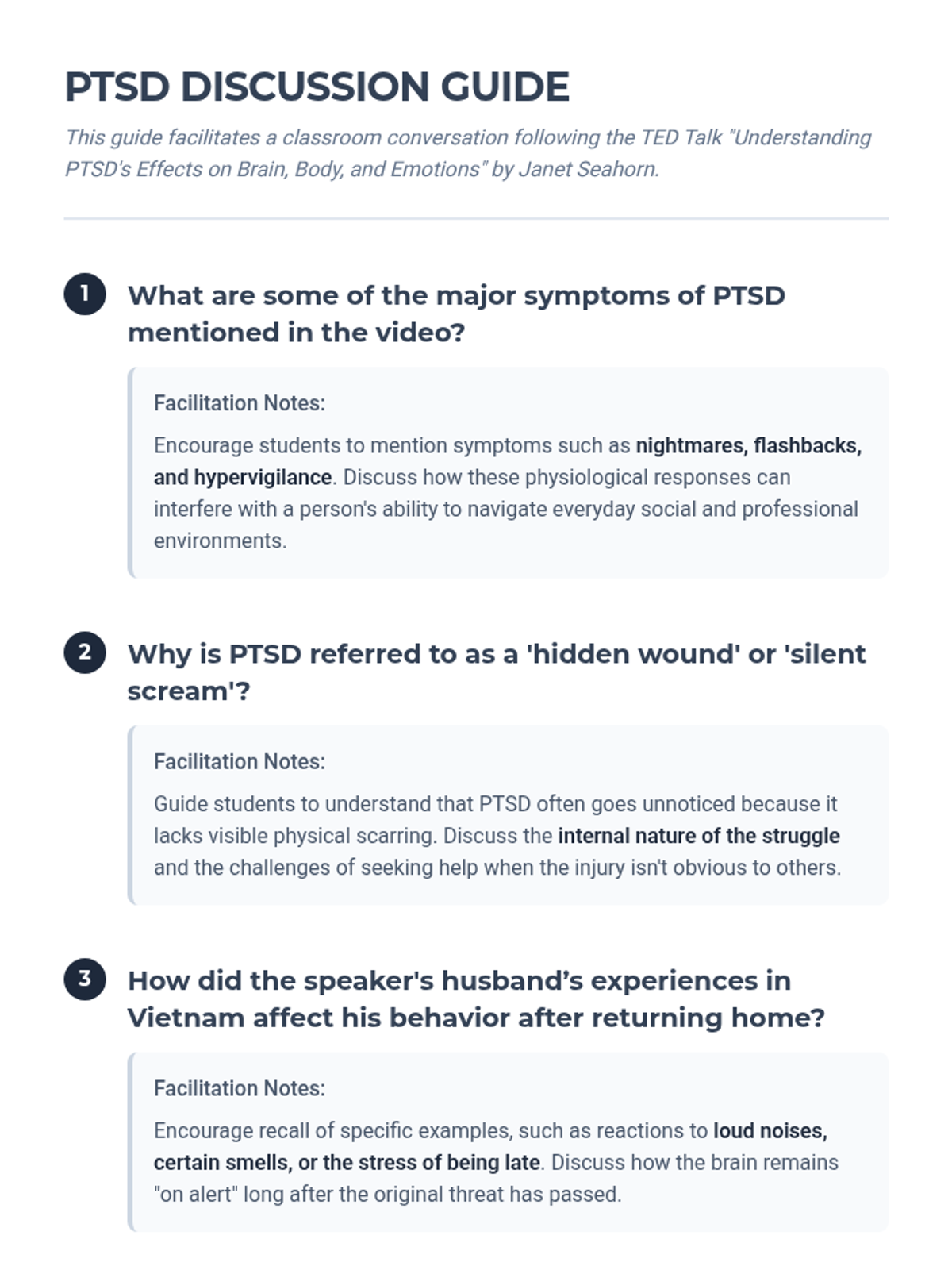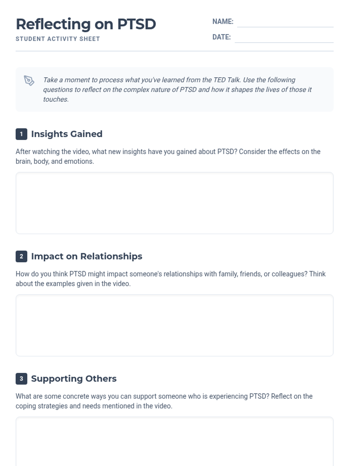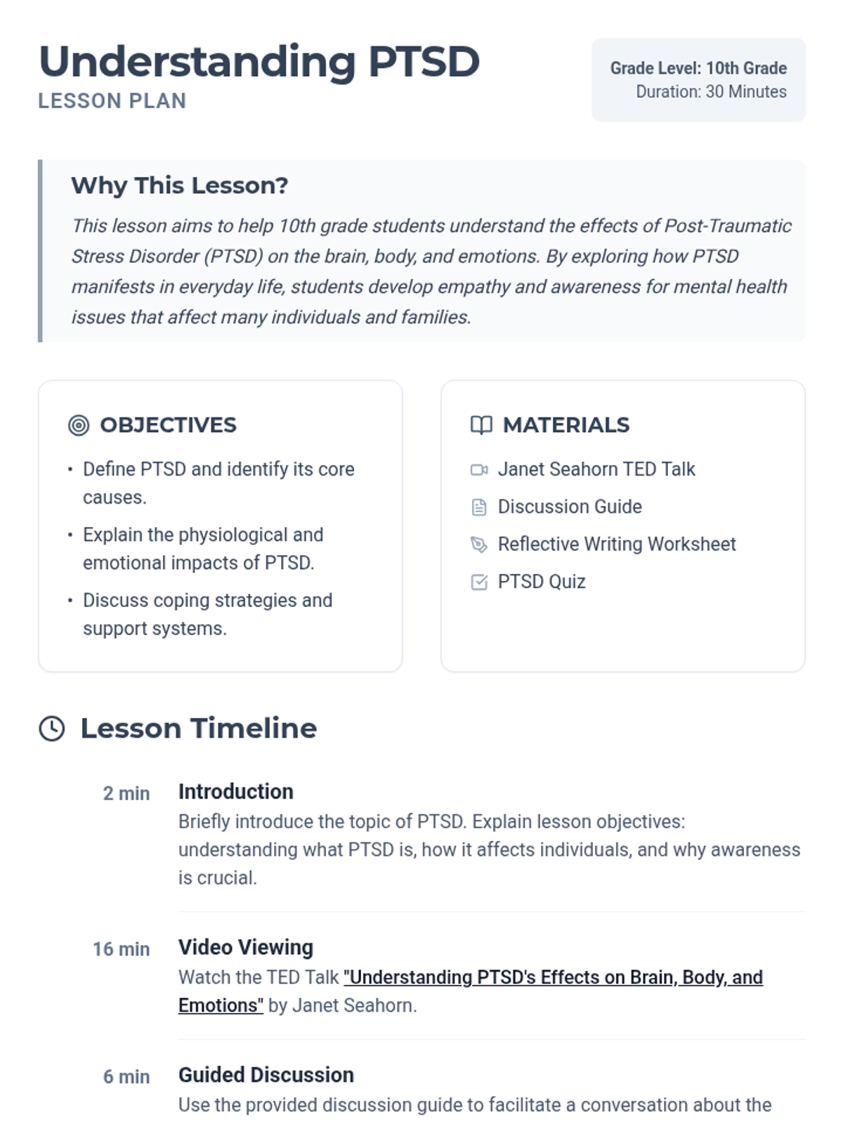 A lesson for 10th-grade students to understand the physiological and emotional impacts of PTSD through a TED Talk, guided discussion, and reflection.