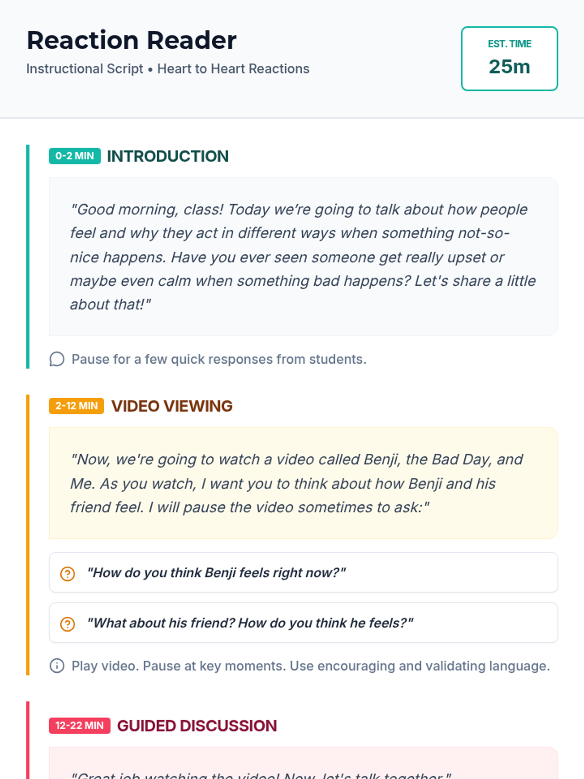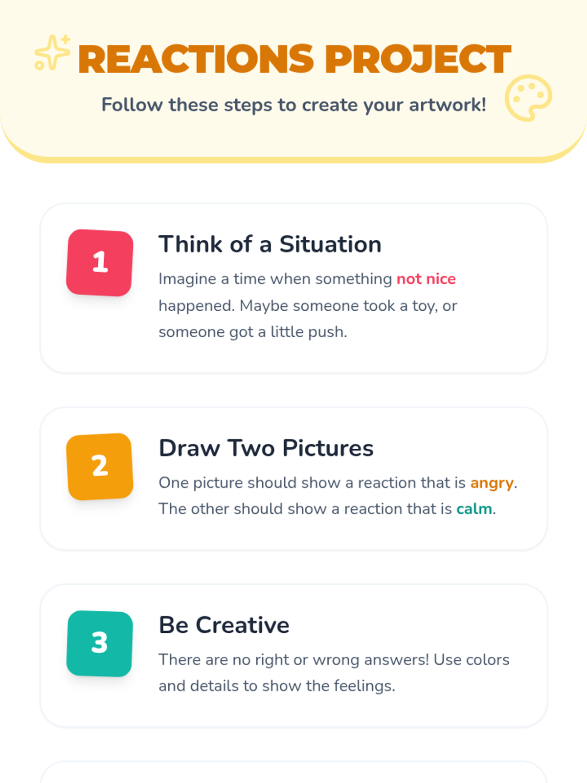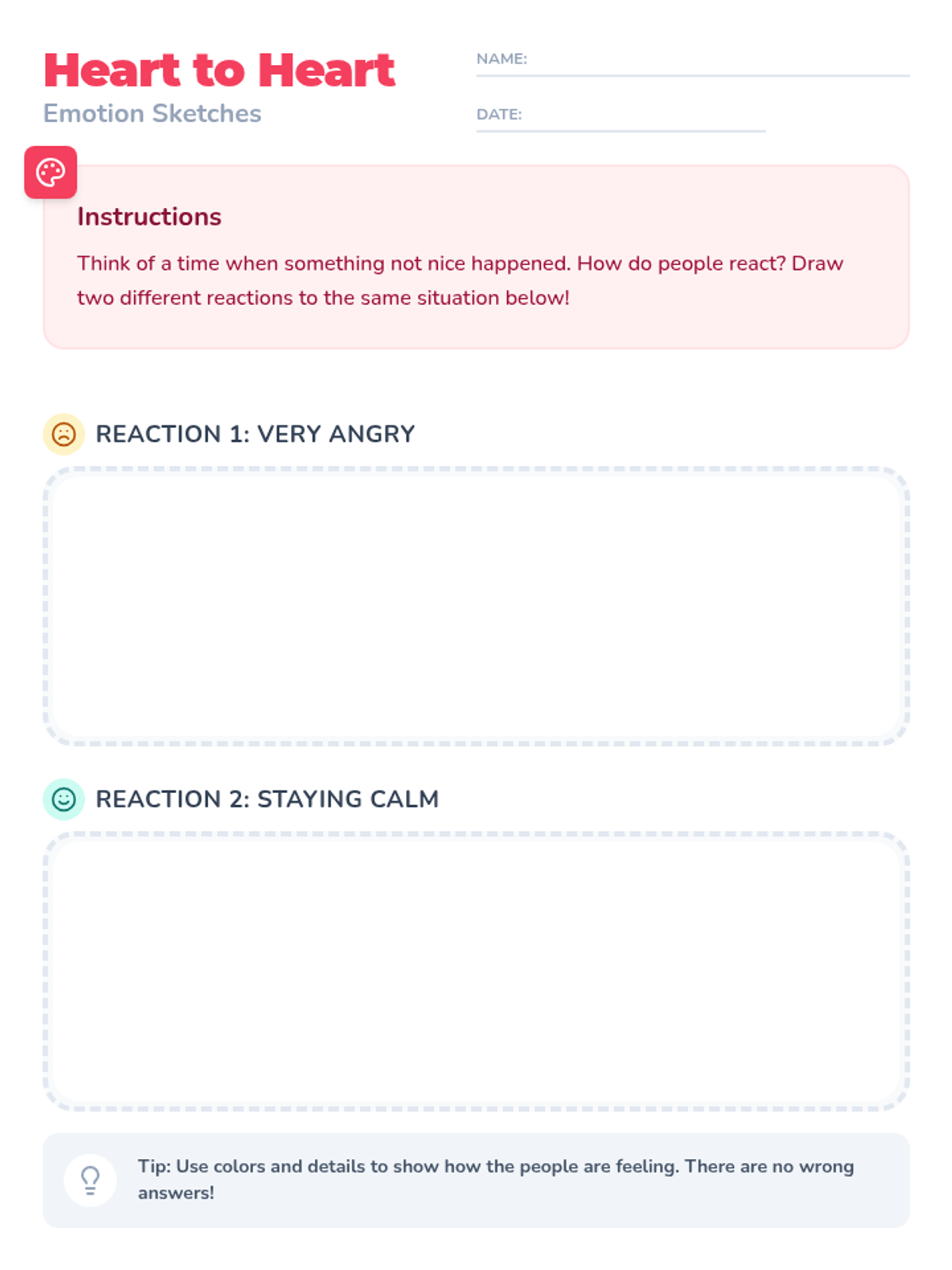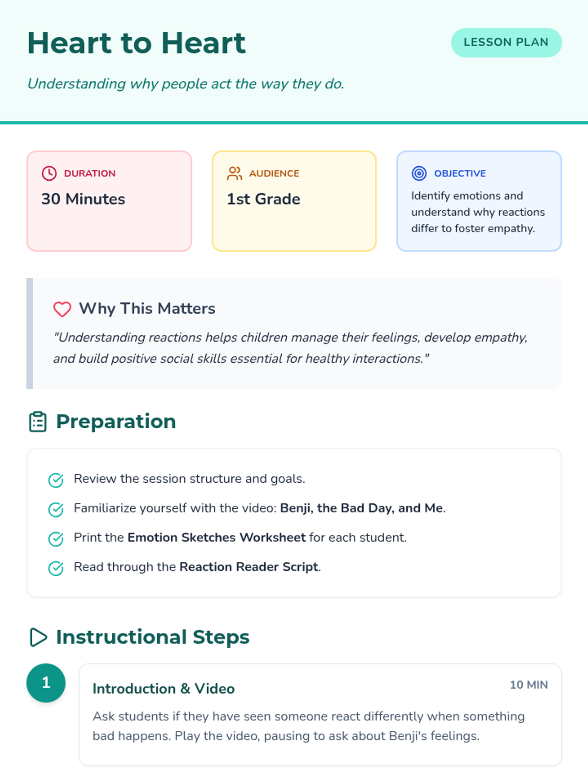 A 30-minute social-emotional learning lesson for 1st graders that explores different emotional reactions through a video, discussion, and a drawing project. Students learn to identify emotions and develop empathy by understanding that reactions vary from person to person.