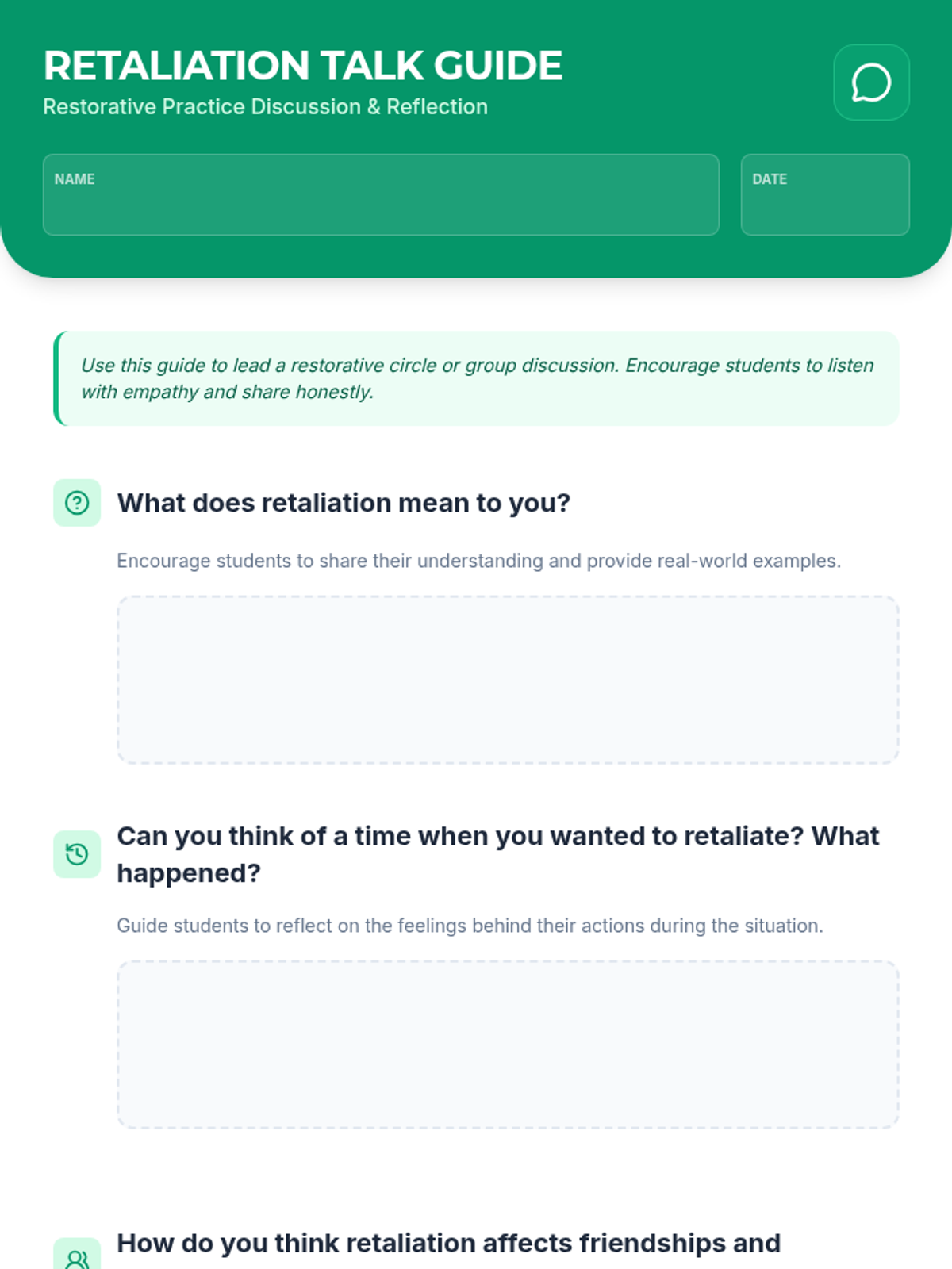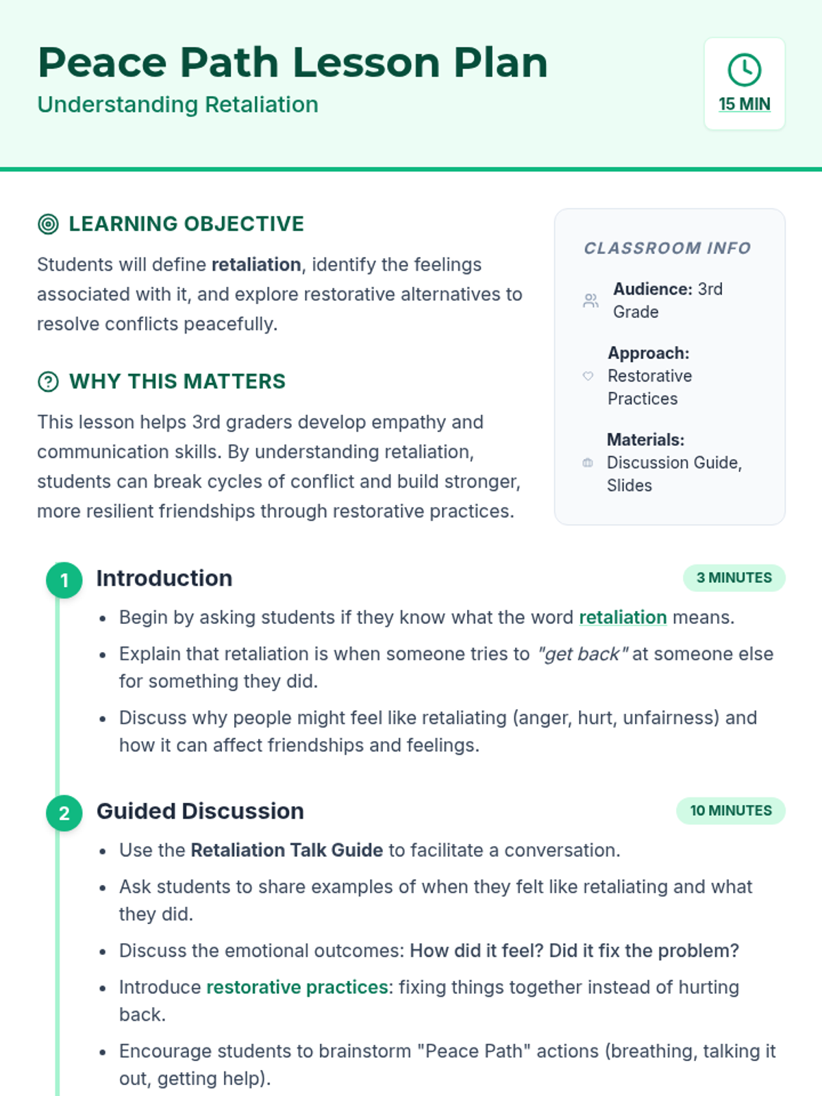 This lesson introduces 3rd grade students to the concept of retaliation and explores how restorative practices can be used to address conflicts. Students will identify feelings associated with retaliation and consider peaceful alternatives for resolution.