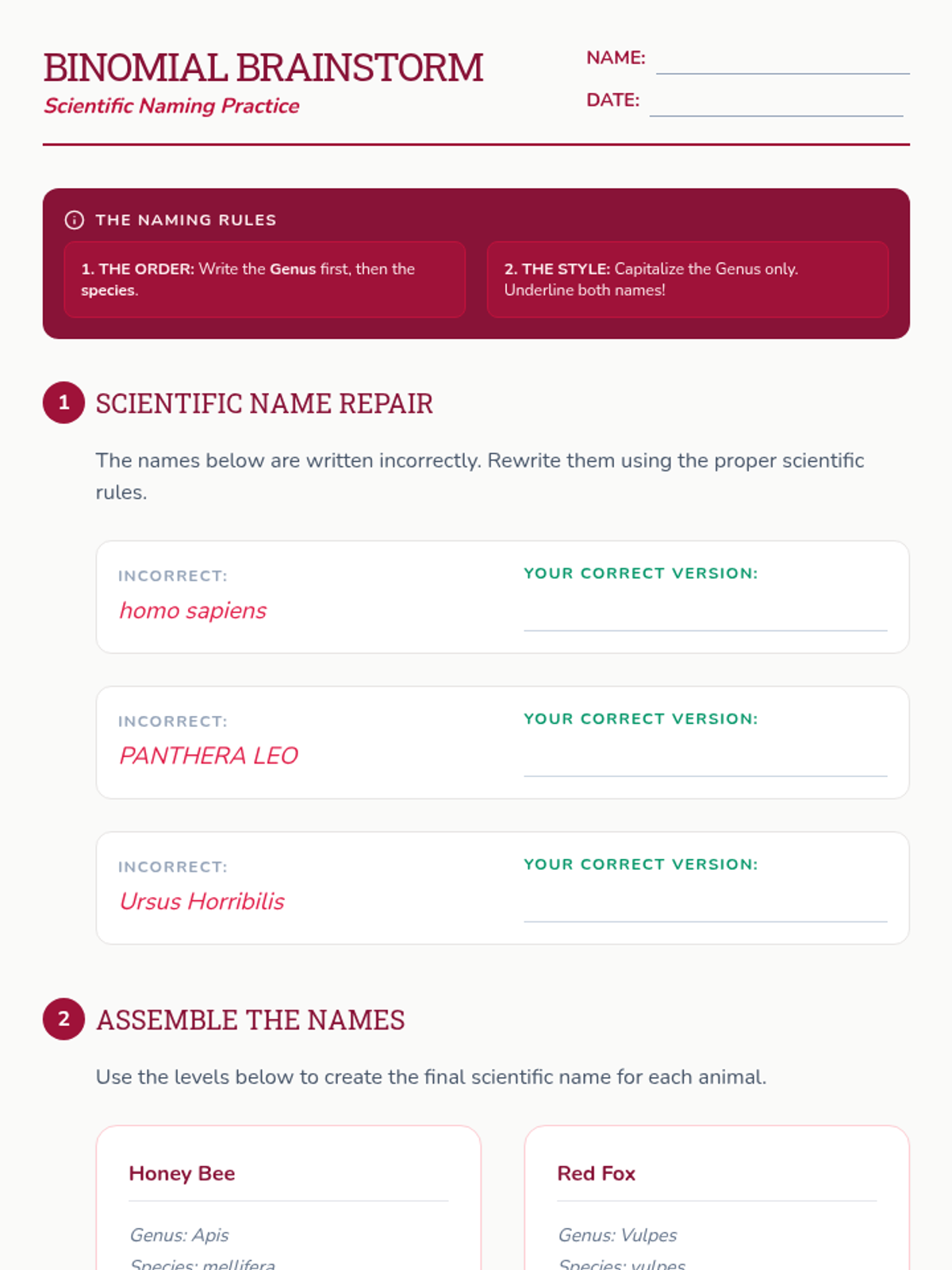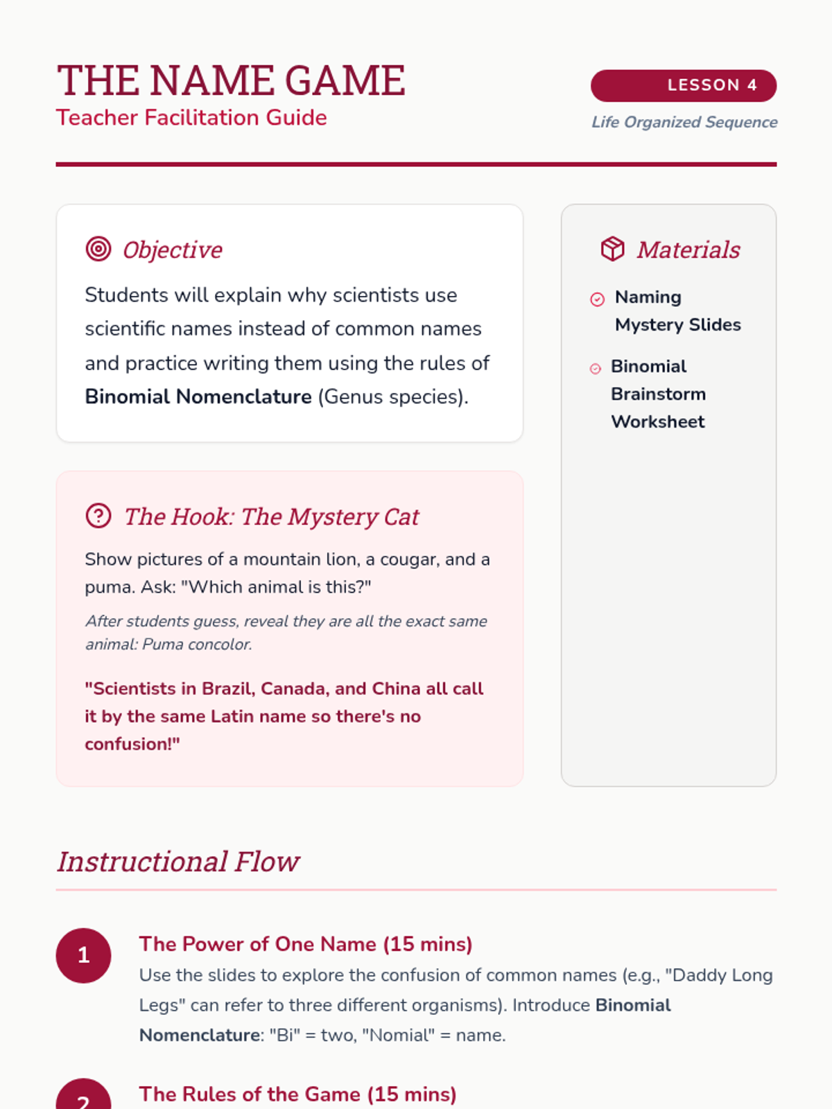 Exploring binomial nomenclature, students learn why scientific names are necessary for global communication and practice the conventions of writing Genus and species names.