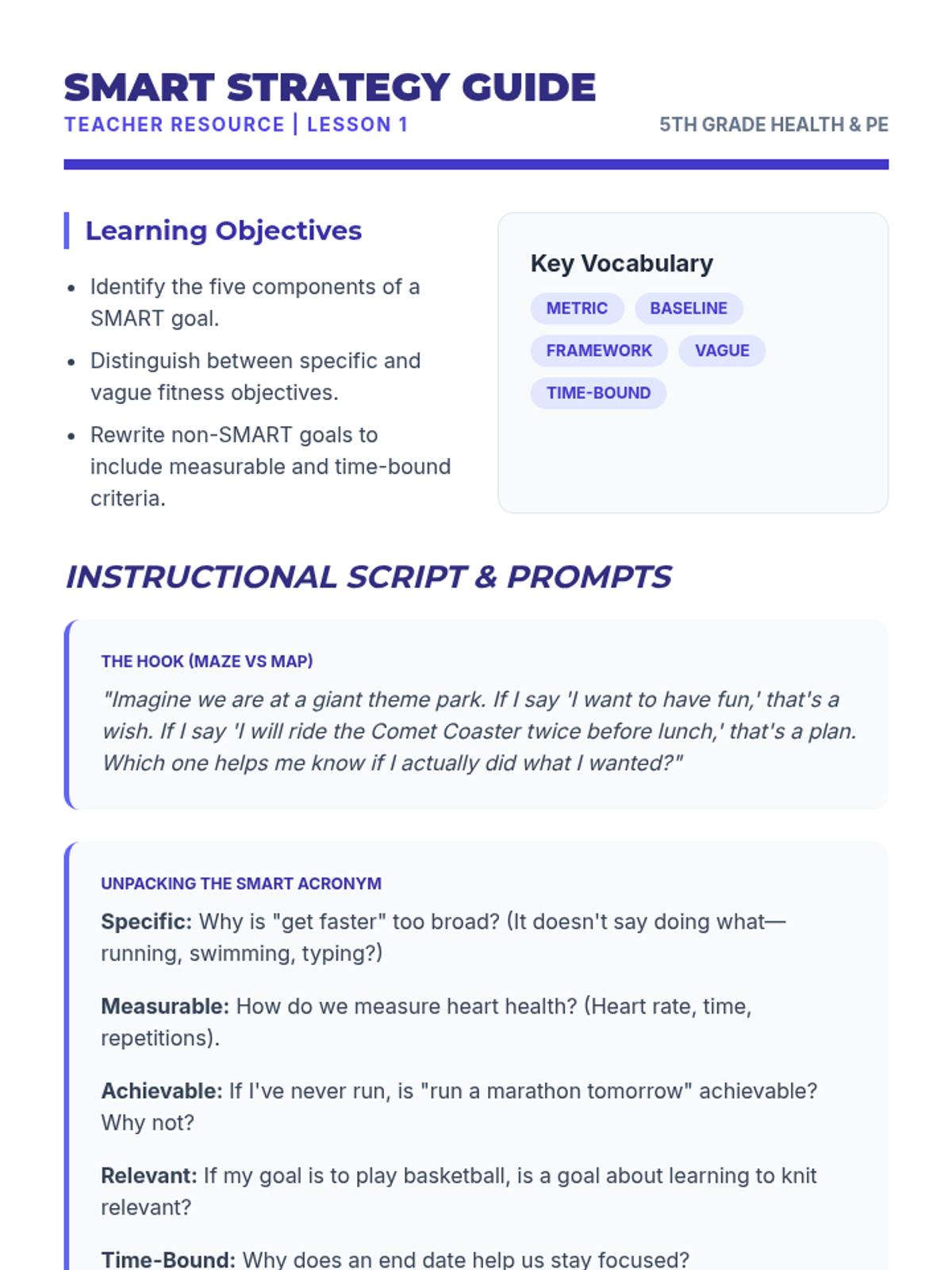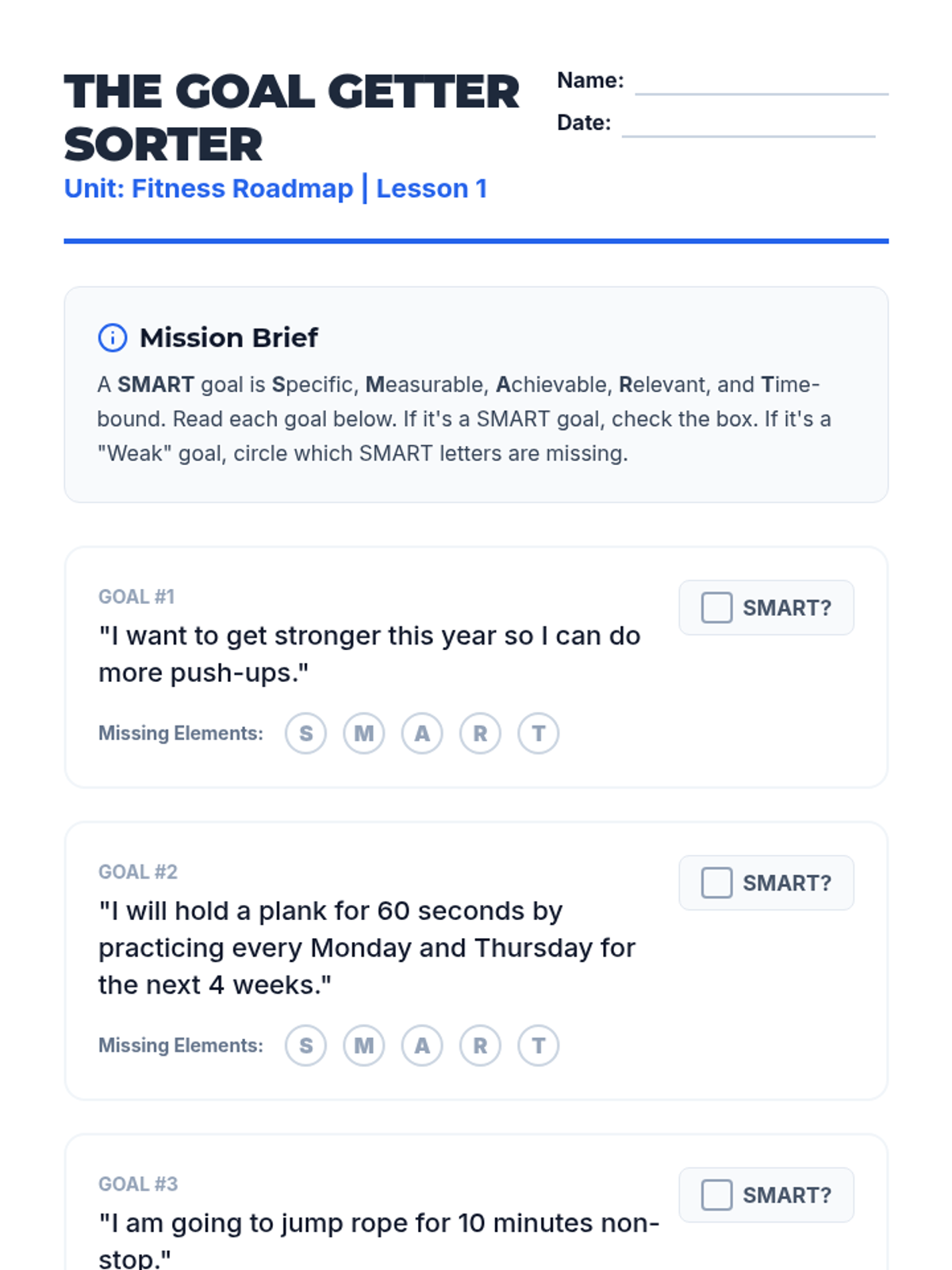 Introduces the SMART goal framework through comparative analysis and sorting activities to distinguish between vague wishes and actionable fitness objectives.