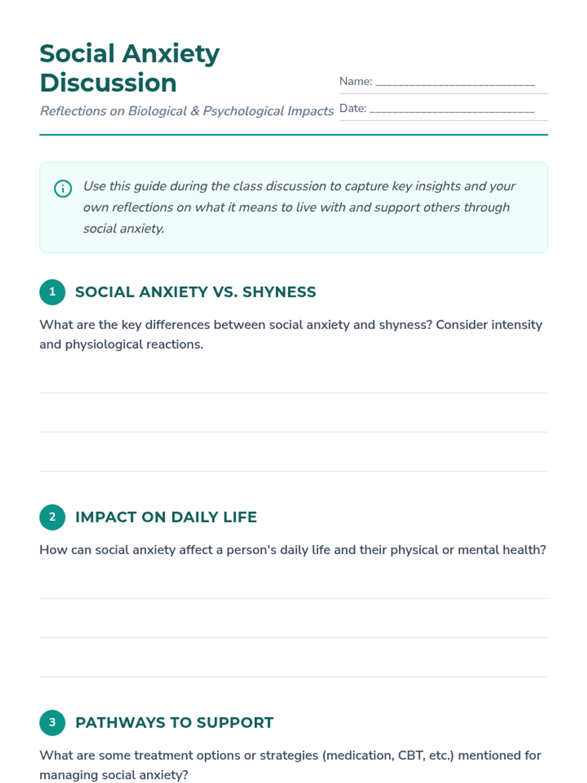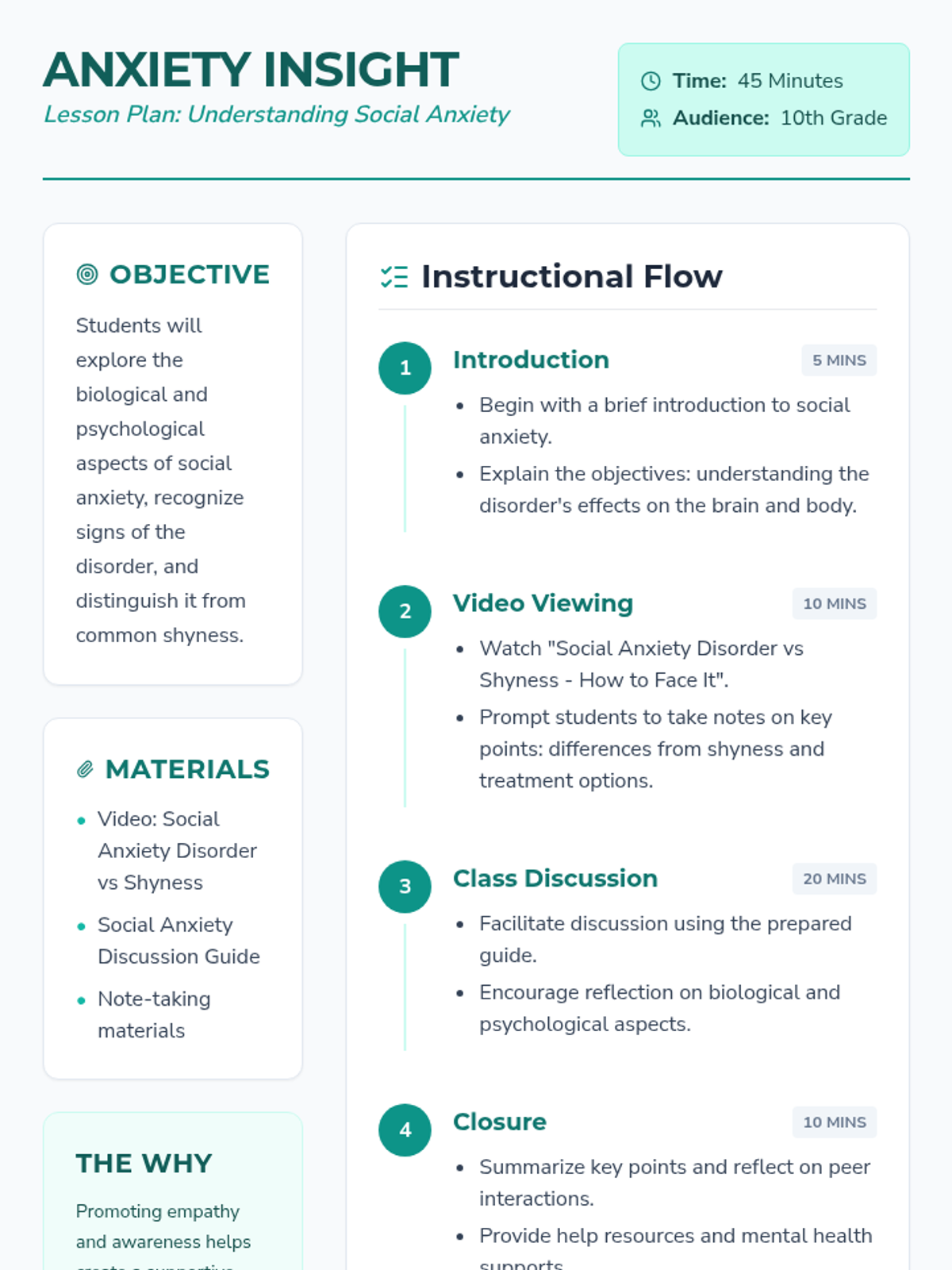 This lesson explores the biological and psychological aspects of social anxiety, helping 10th-grade students differentiate it from shyness and understand its effects on the brain and body.