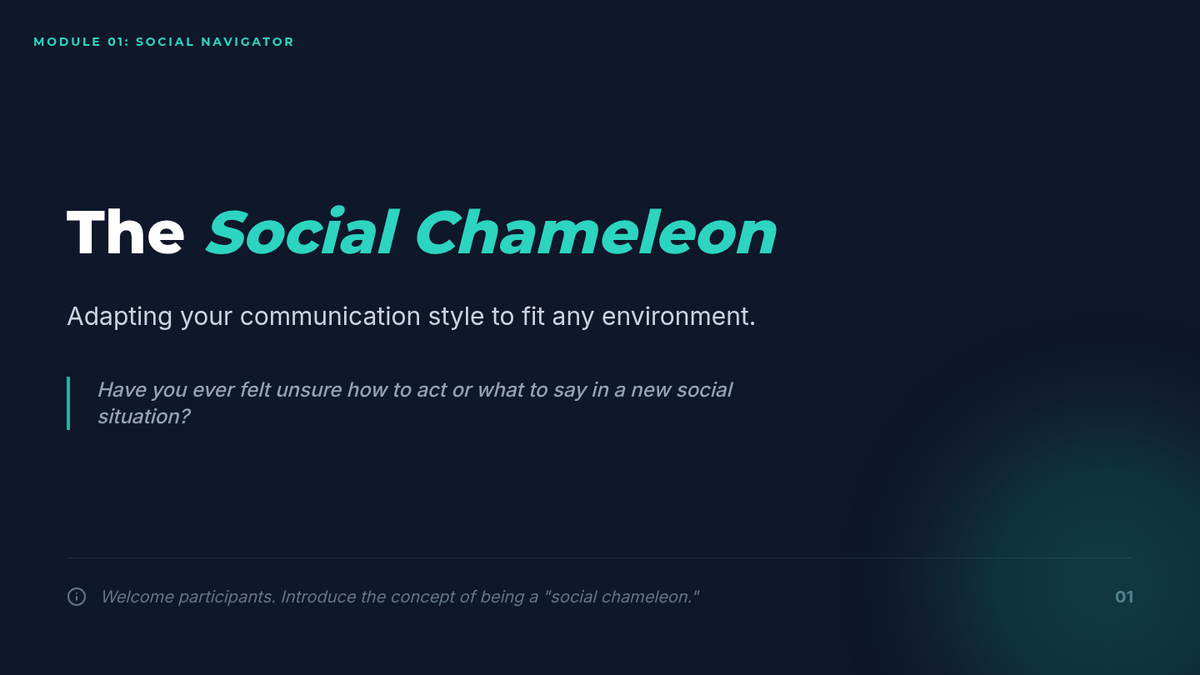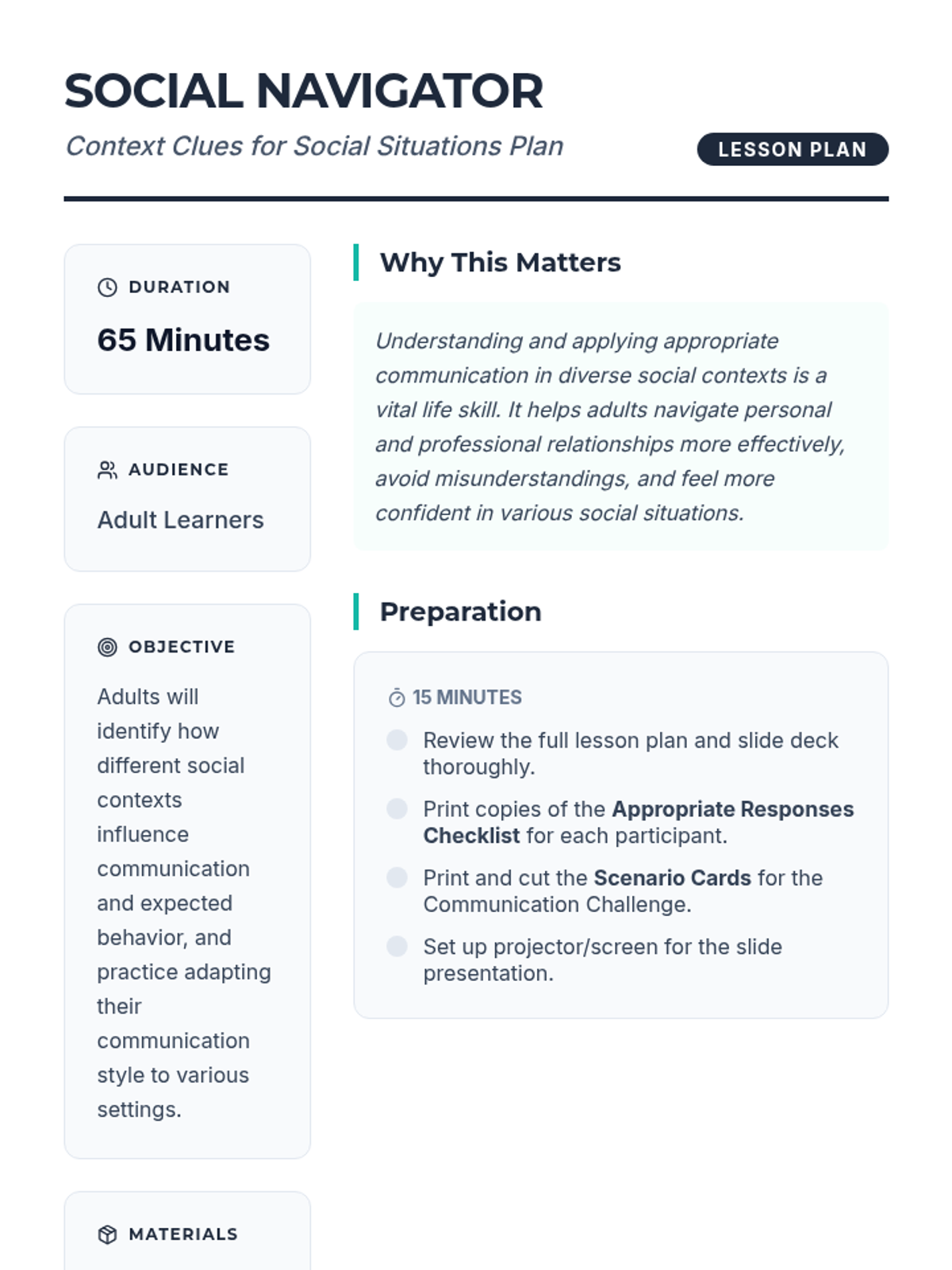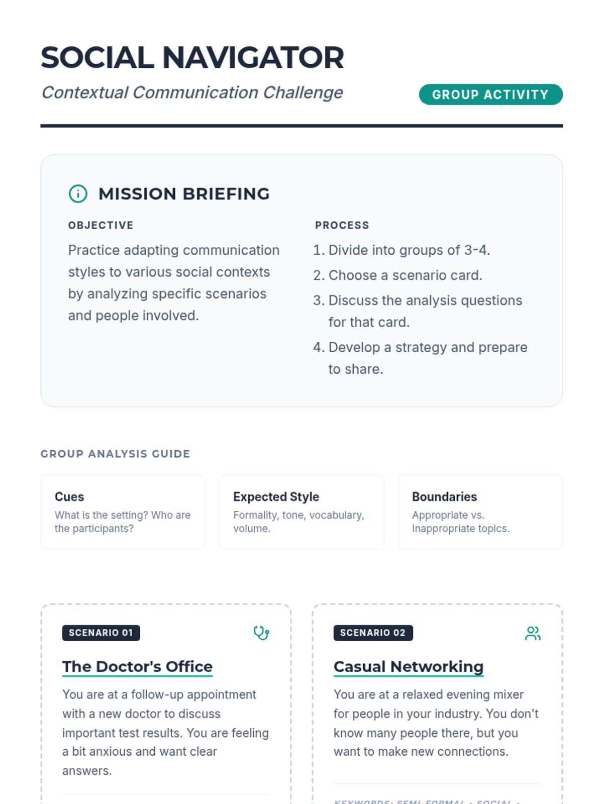 A 65-minute lesson for adults on identifying social context clues and adapting communication styles from casual to formal settings.