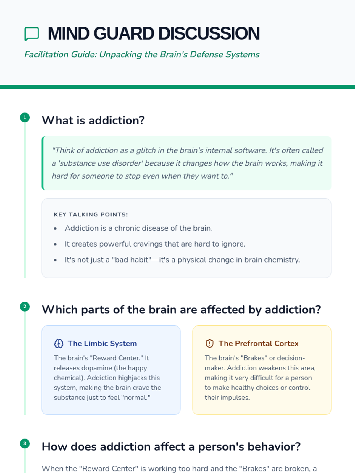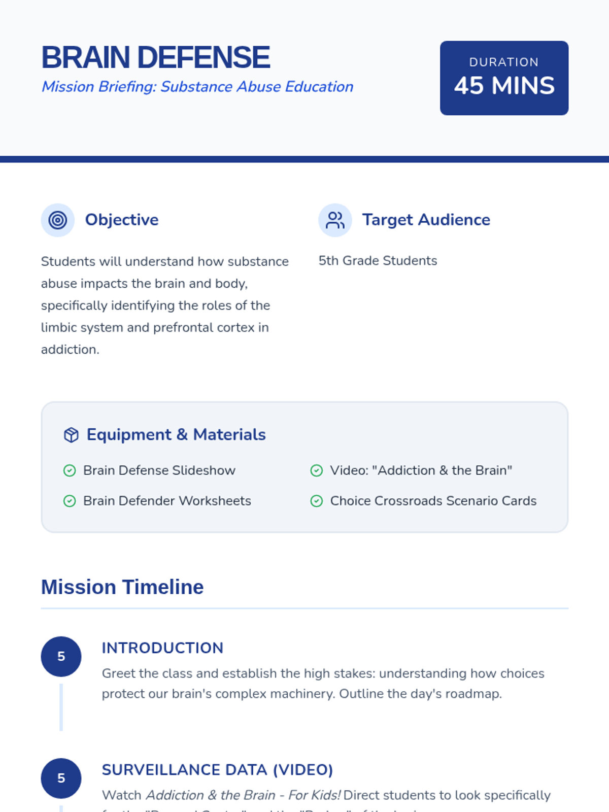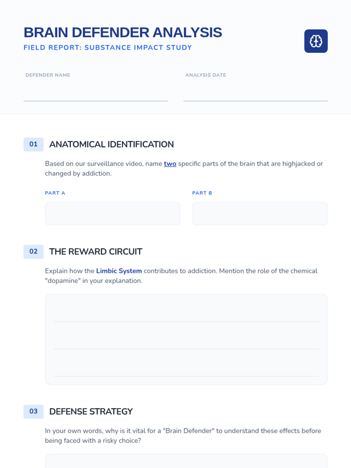 Students will learn about the effects of substance abuse on the brain and body through interactive discussions, video analysis, and real-life scenarios, promoting healthy decision-making.