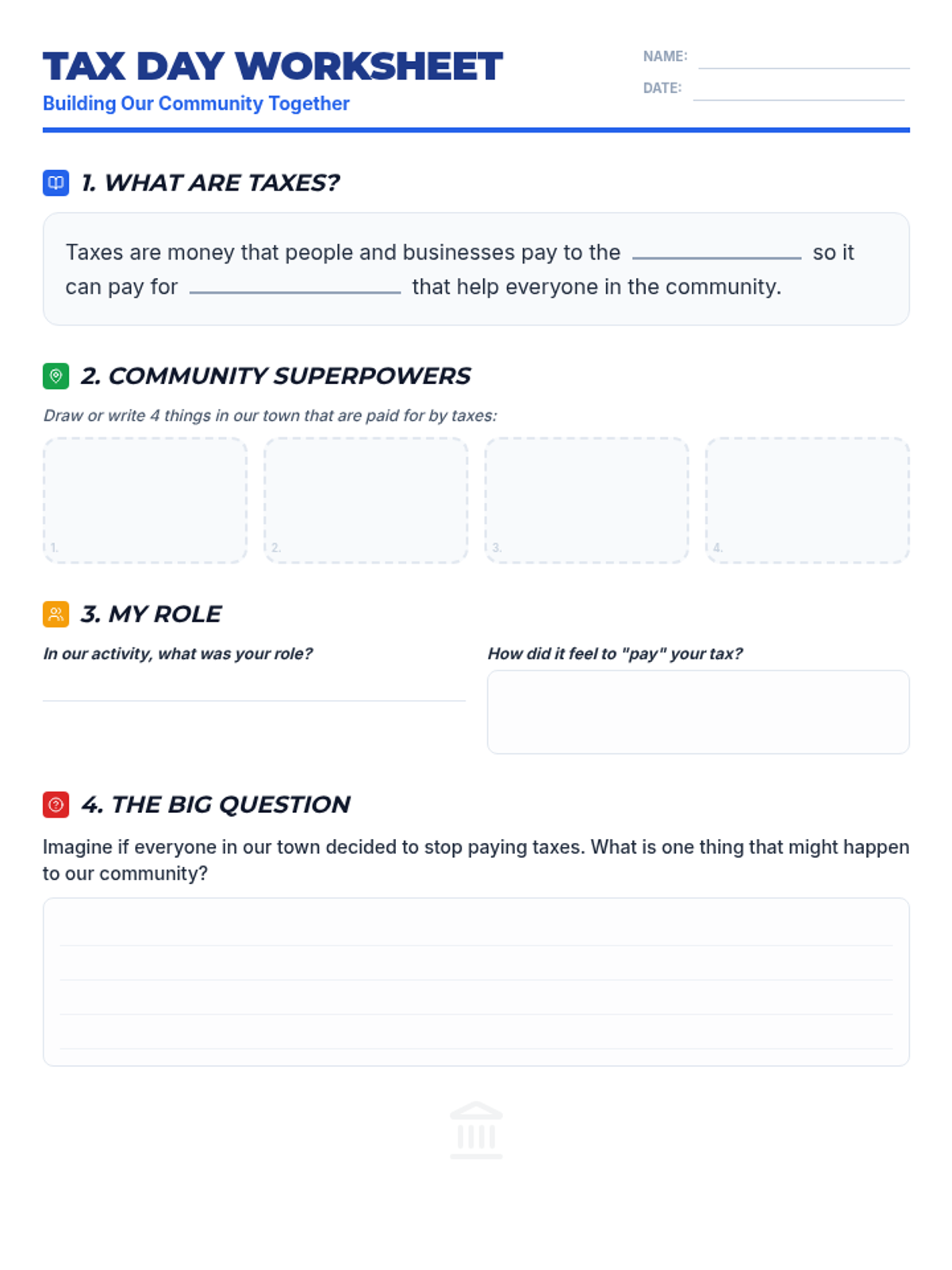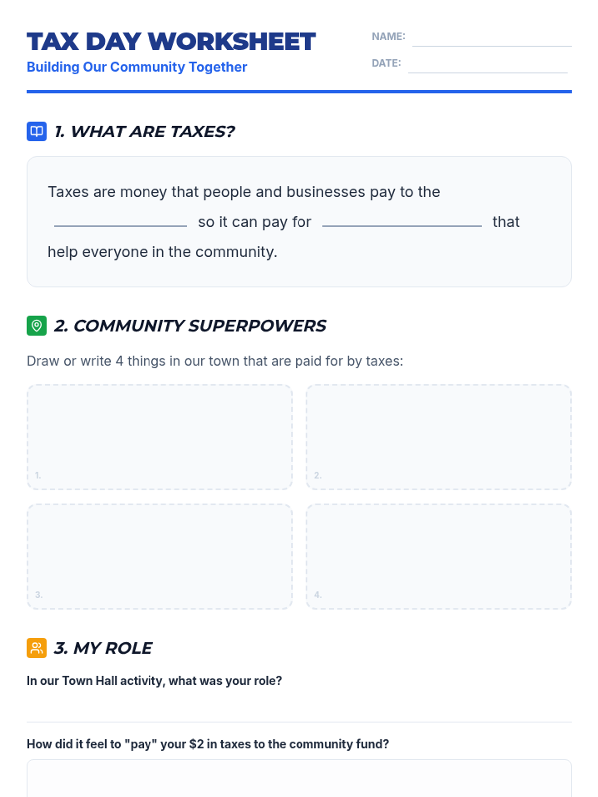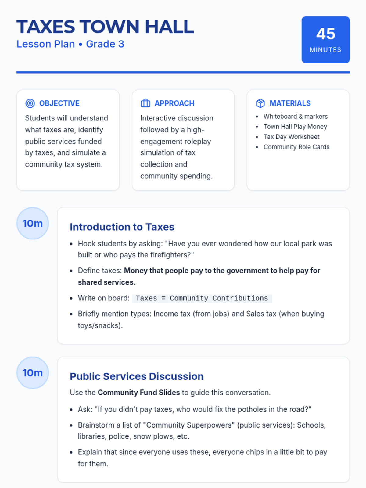 Students will learn what taxes are, why we pay them, and how they fund public services. The lesson will include an introduction to taxes, a discussion on public services, and a mock tax collection activity.