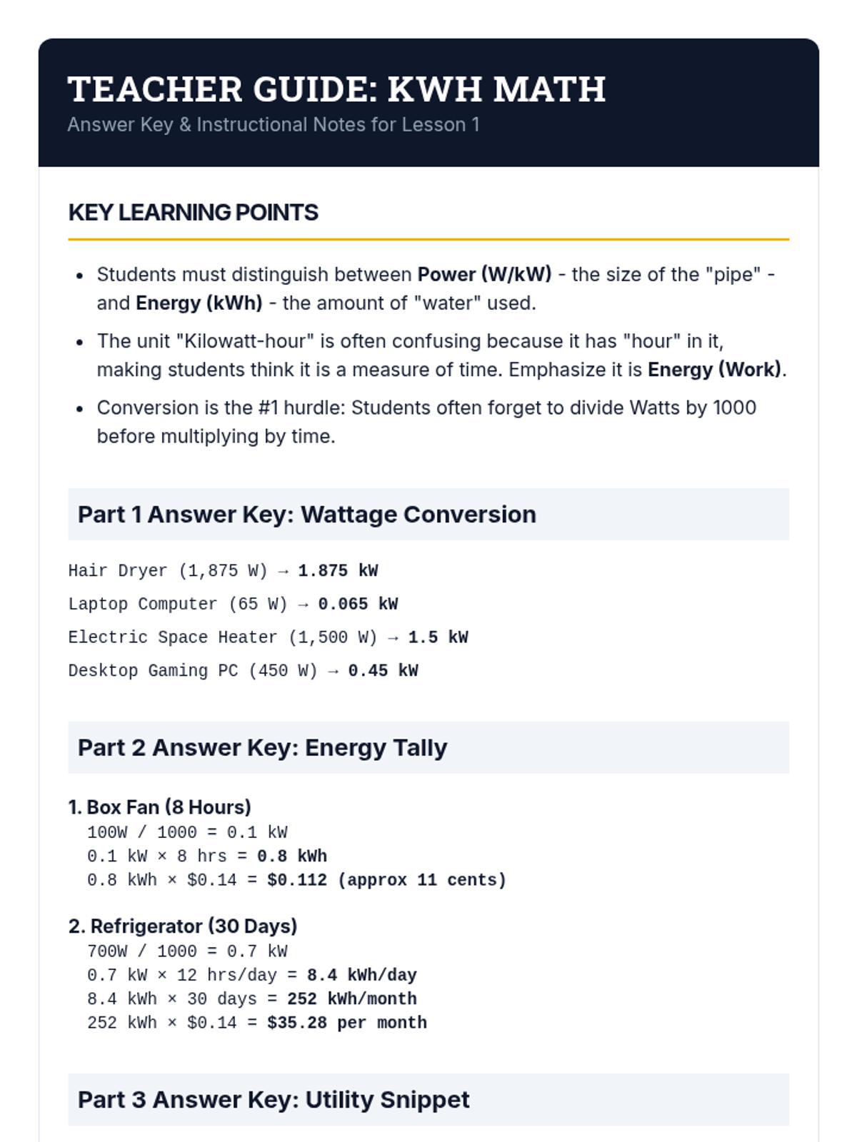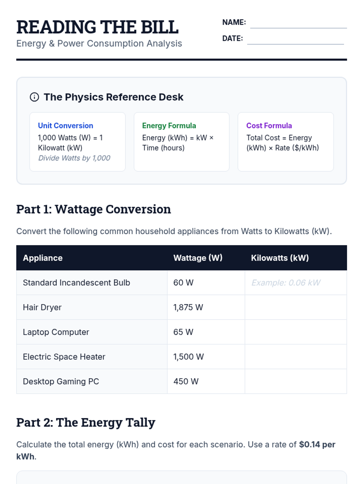Students learn how utility companies measure energy using Kilowatt-hours (kWh). They practice converting between Watts, Kilowatts, and kWh, and solve problems based on the usage time of common household appliances.