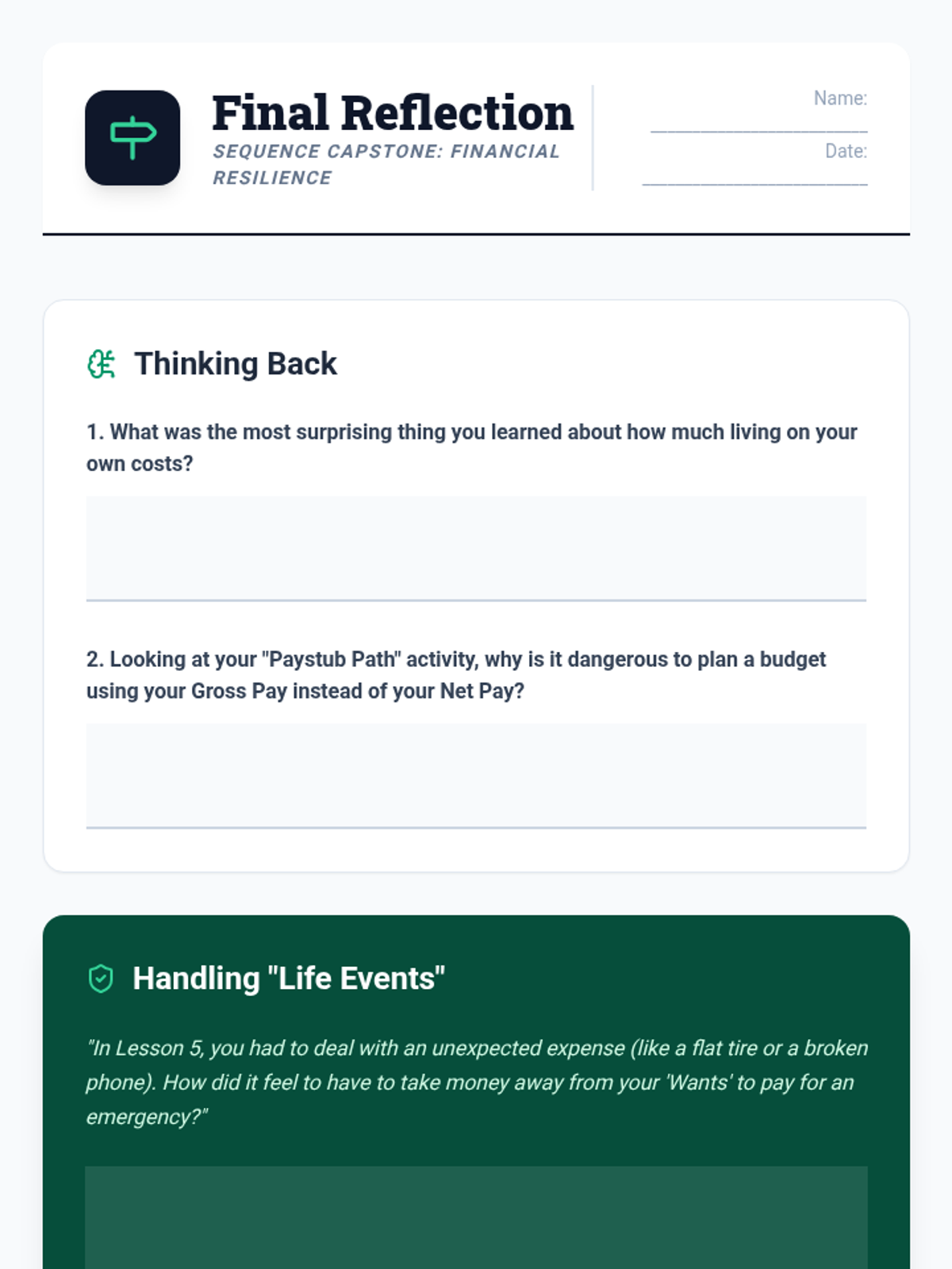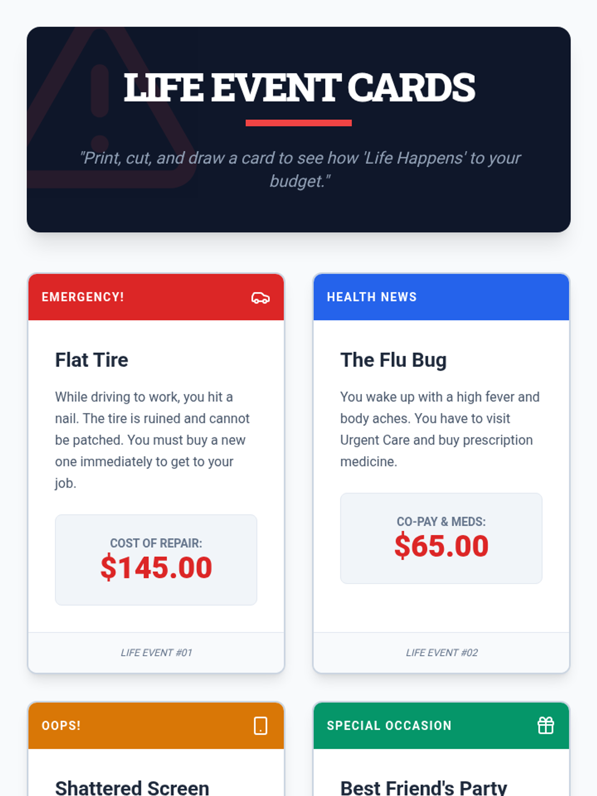 In the final simulation step, students encounter random 'Life Event' cards that introduce unexpected expenses. They must adjust their current budgets to accommodate these costs, building resilience and problem-solving skills.