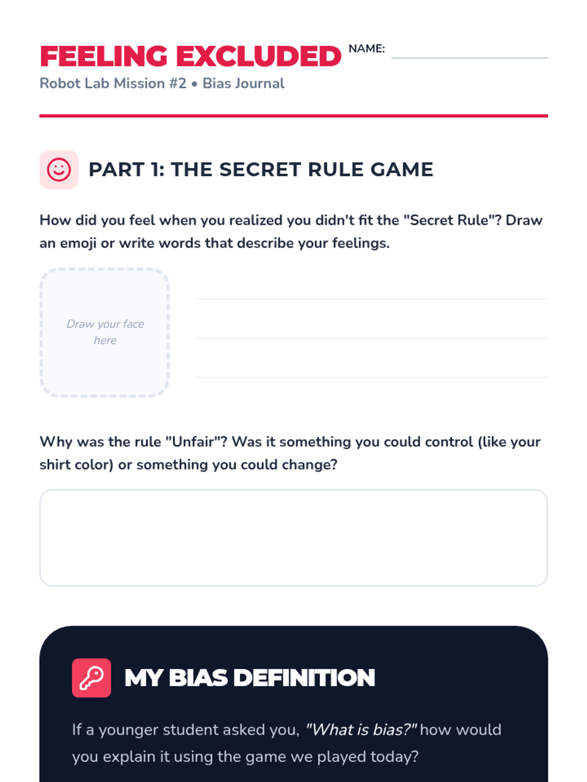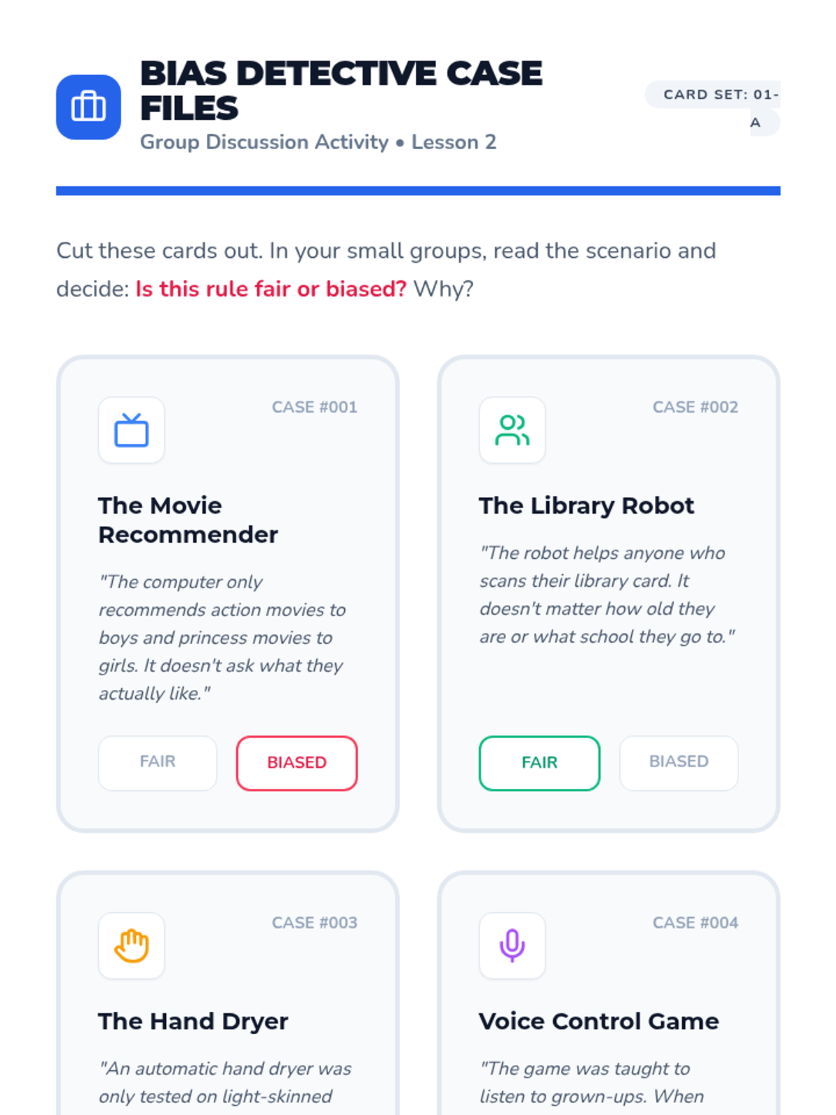Students experience an 'unfair' rule in a classroom game to define bias and understand how exclusion feels in algorithmic decision-making.