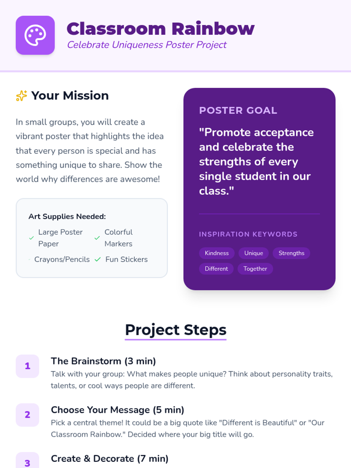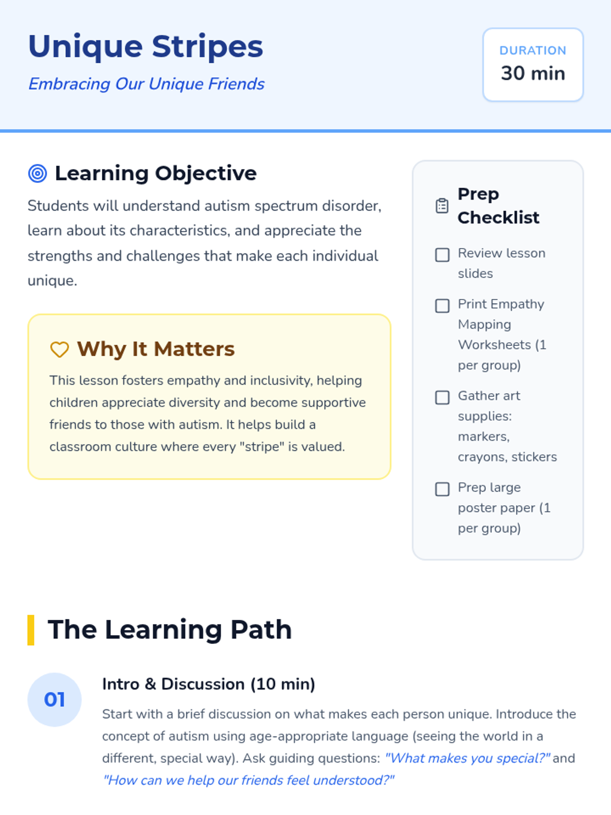 A 30-minute lesson for 3rd graders to foster empathy and understanding of autism spectrum disorder, celebrating the unique strengths and perspectives of every student.
