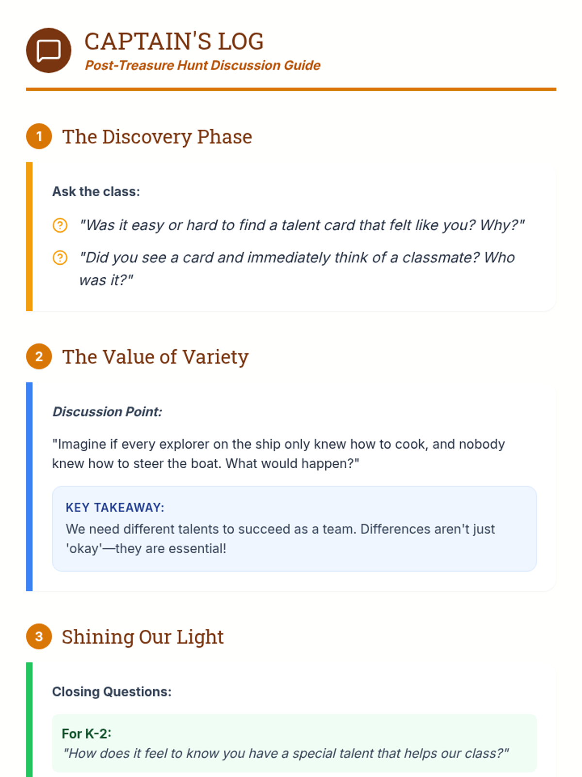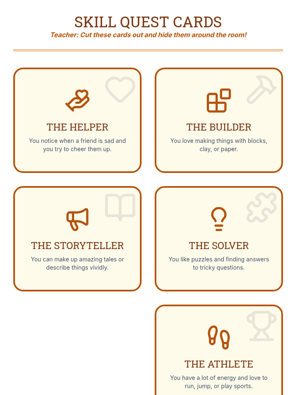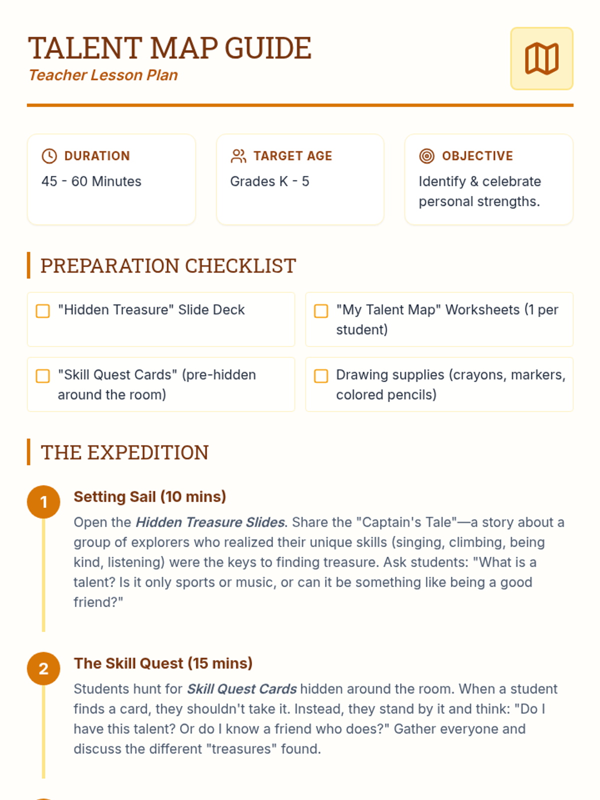 A lesson designed to help K-5 students discover and celebrate their unique strengths through a treasure-hunt themed exploration of personal talents.