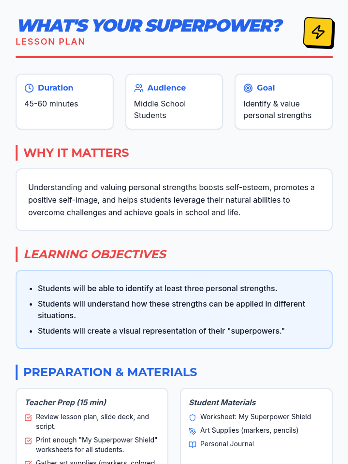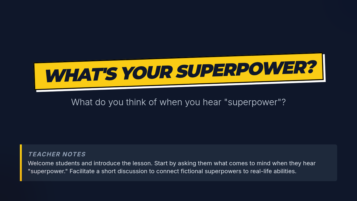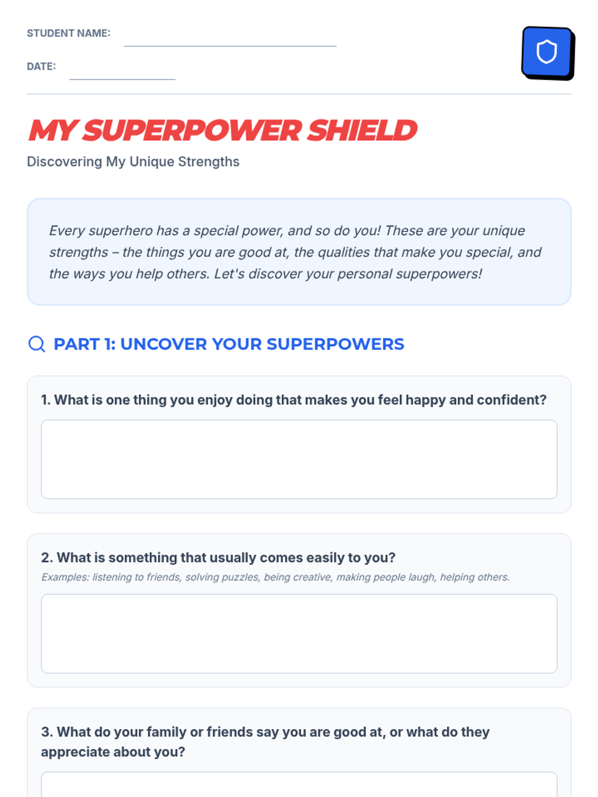 Students identify and appreciate their unique personal strengths and talents through the metaphor of superpowers, creating a visual representation of their 'superpower shield'.