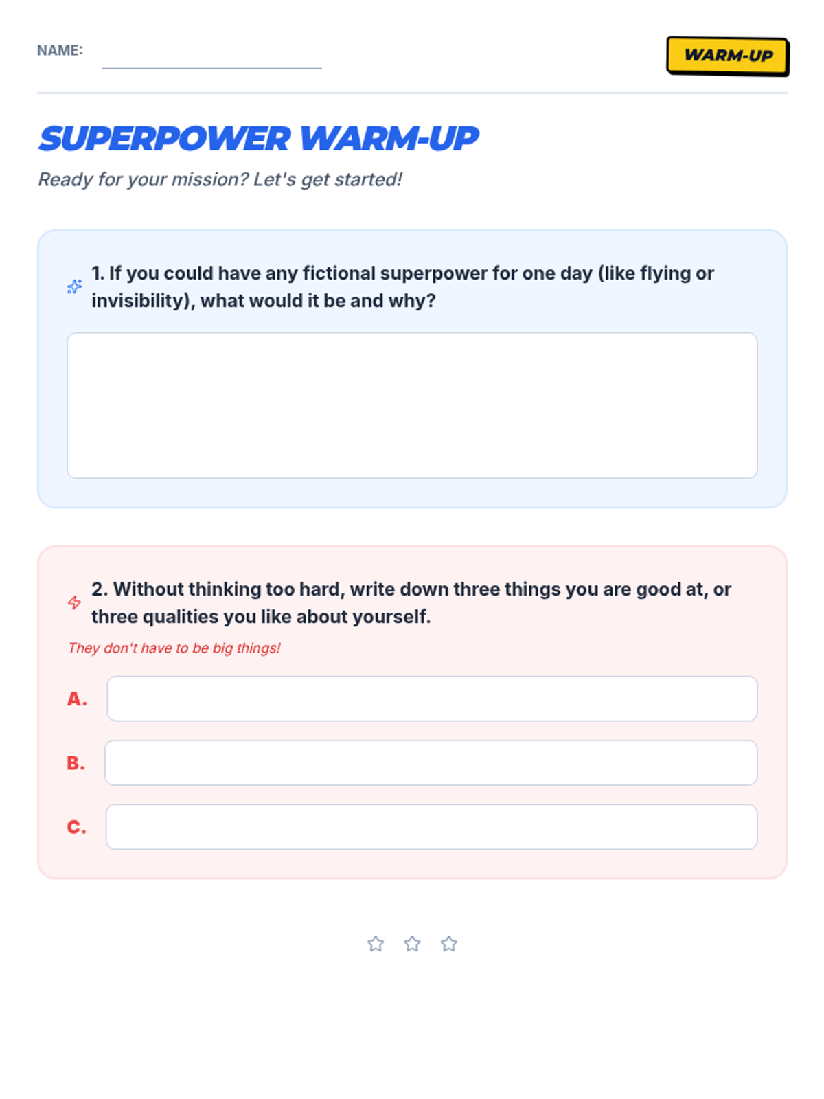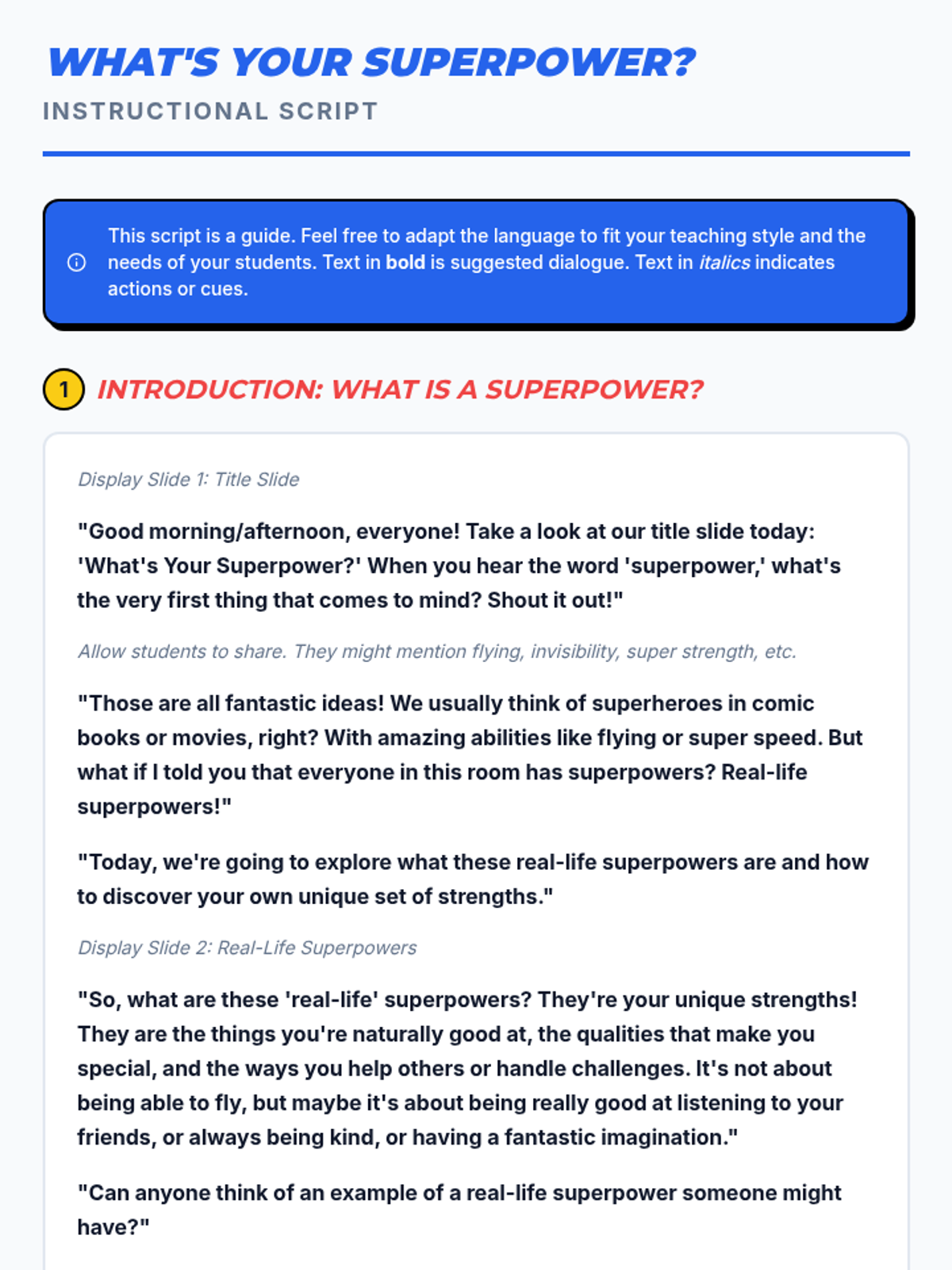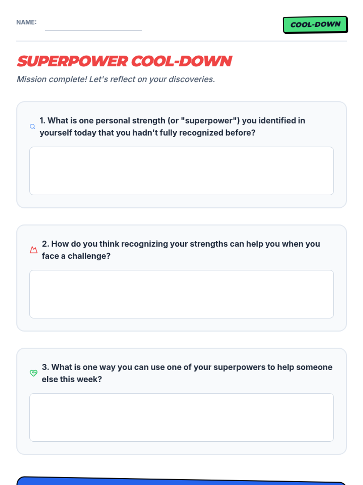 Students identify and appreciate their unique personal strengths and talents through the metaphor of superpowers, creating a visual representation of their 'superpower shield'.