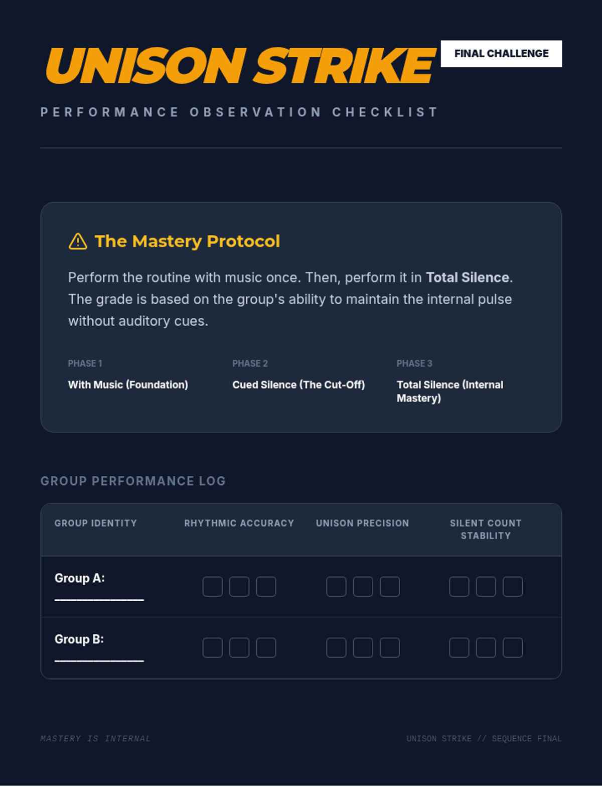 A final mastery challenge focused on absolute unison and rhythmic precision without musical accompaniment.
