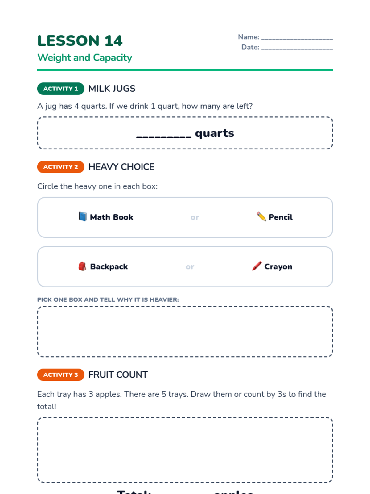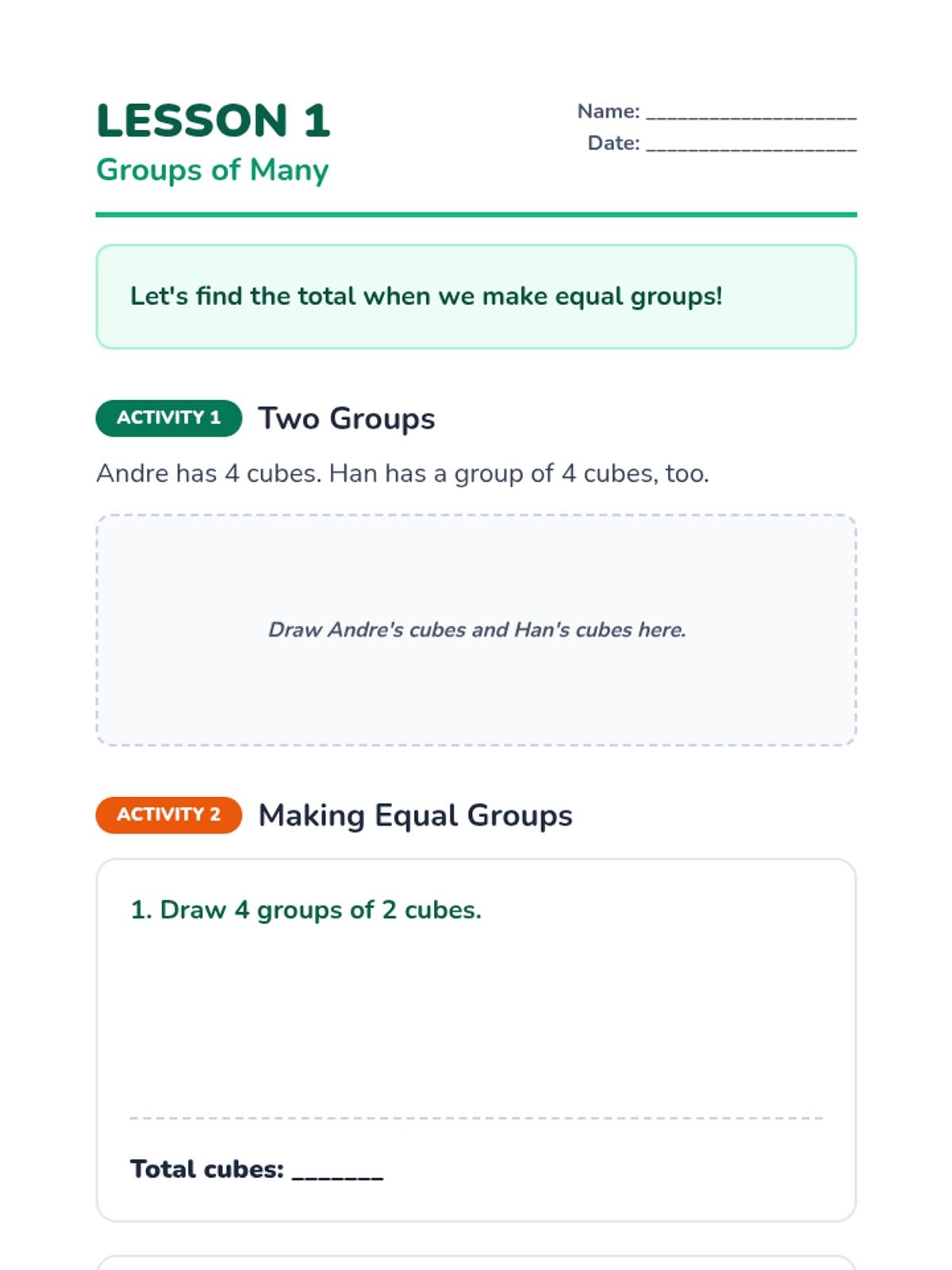 Activities focused on estimating group totals and comparing different sets of equal groups.