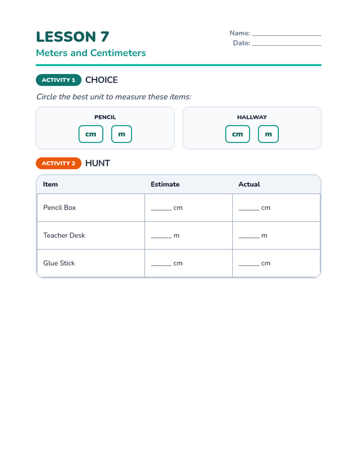 Activities focused on finding area by tiling and simple perimeter with small numbers.