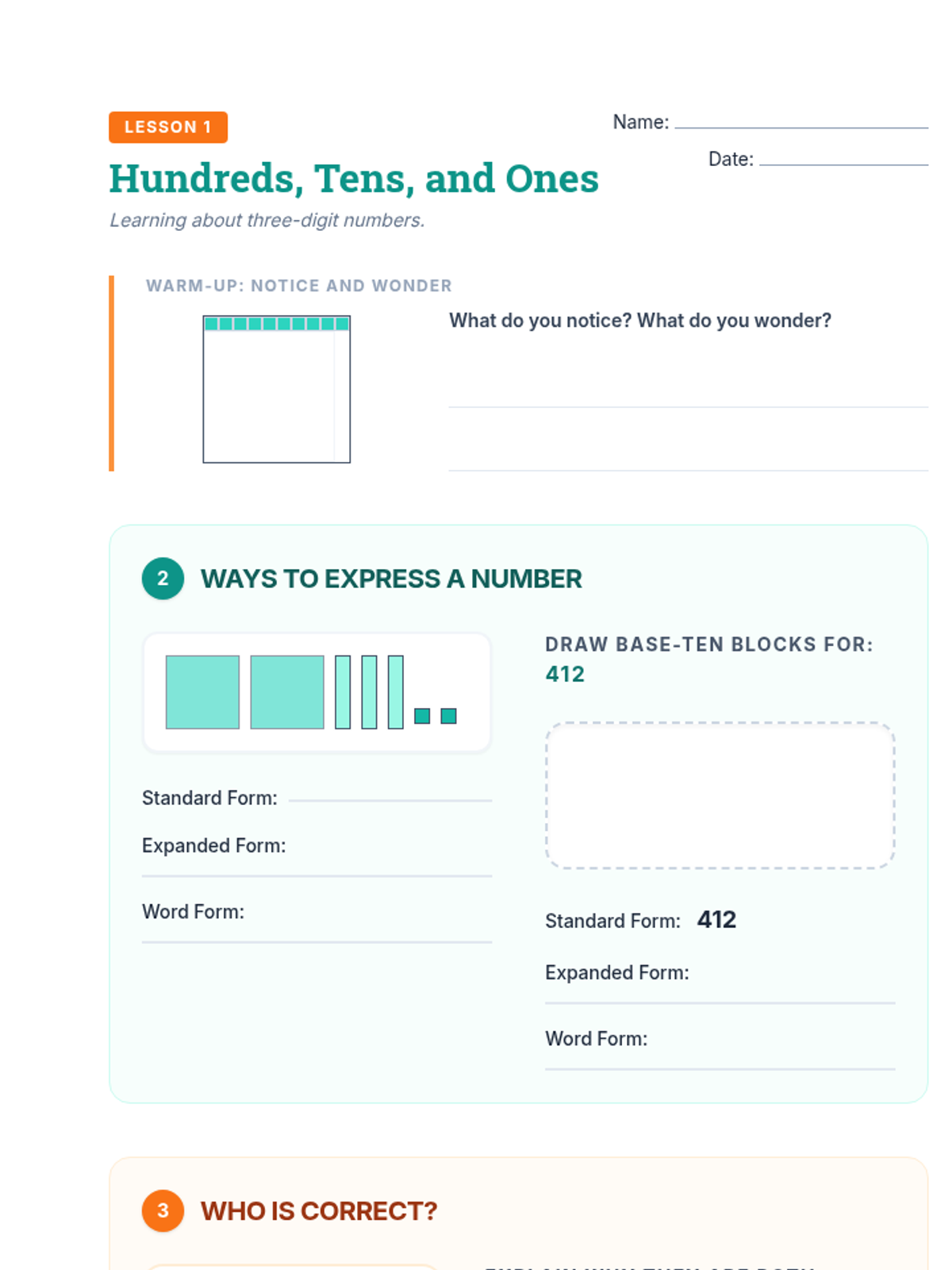 Students explore three-digit numbers using base-ten blocks, standard form, expanded form, and word form, and compare equivalent representations like 100 and 10 tens.