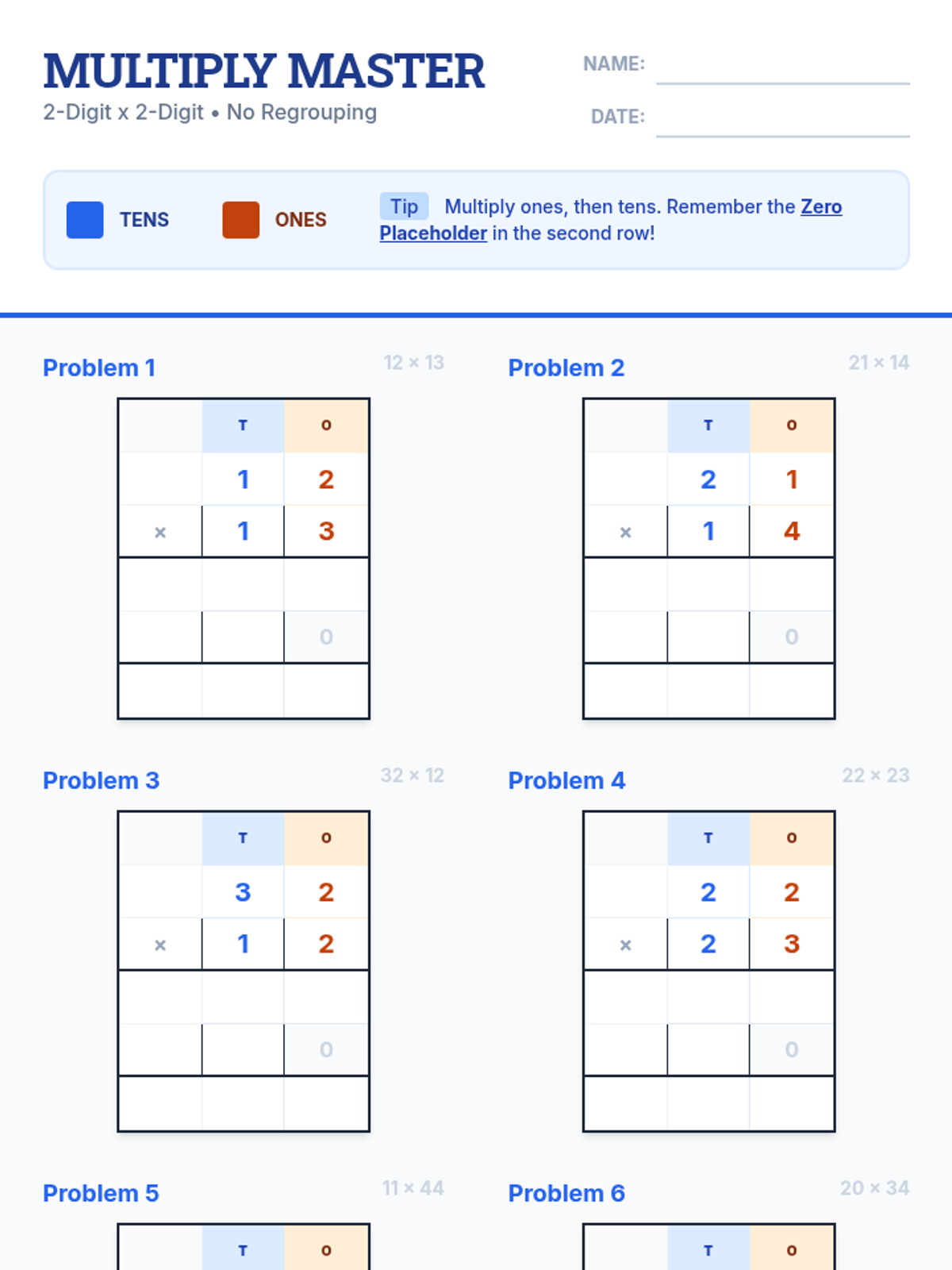 A lesson on 2-digit by 2-digit multiplication without regrouping, featuring color-coded place value support and grid organizers to help students maintain alignment.