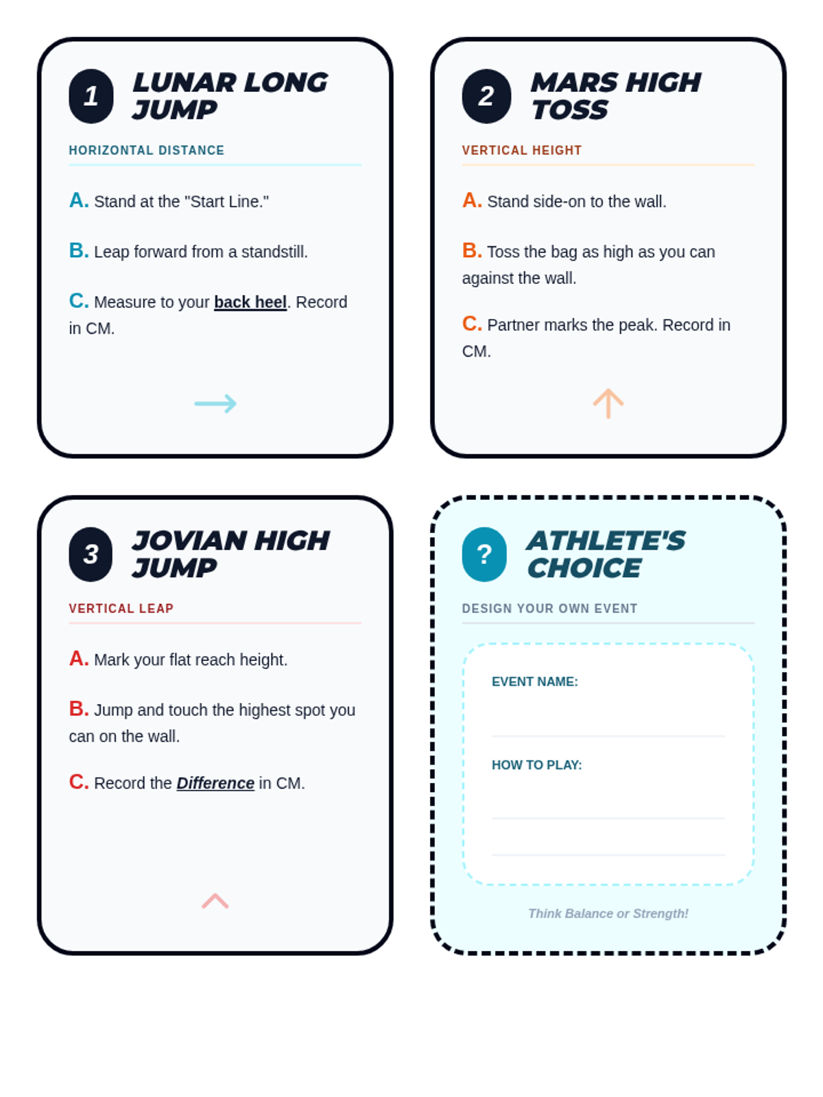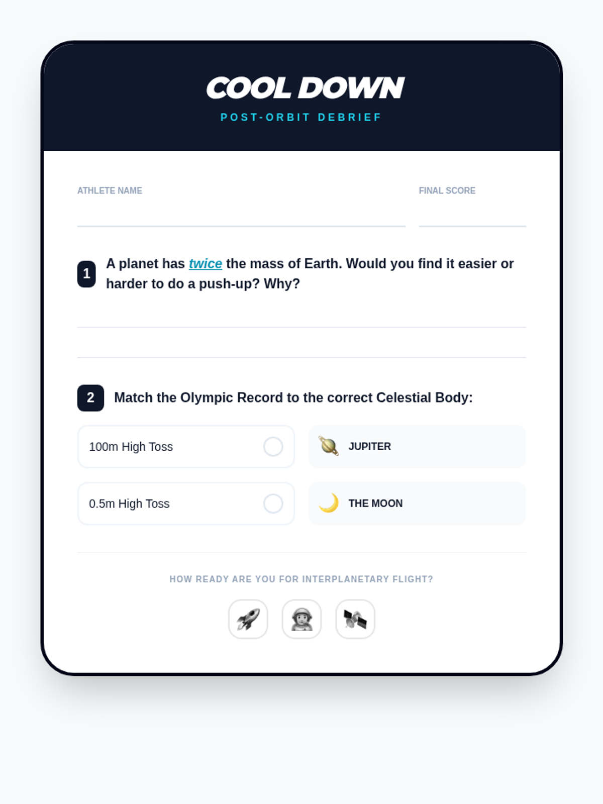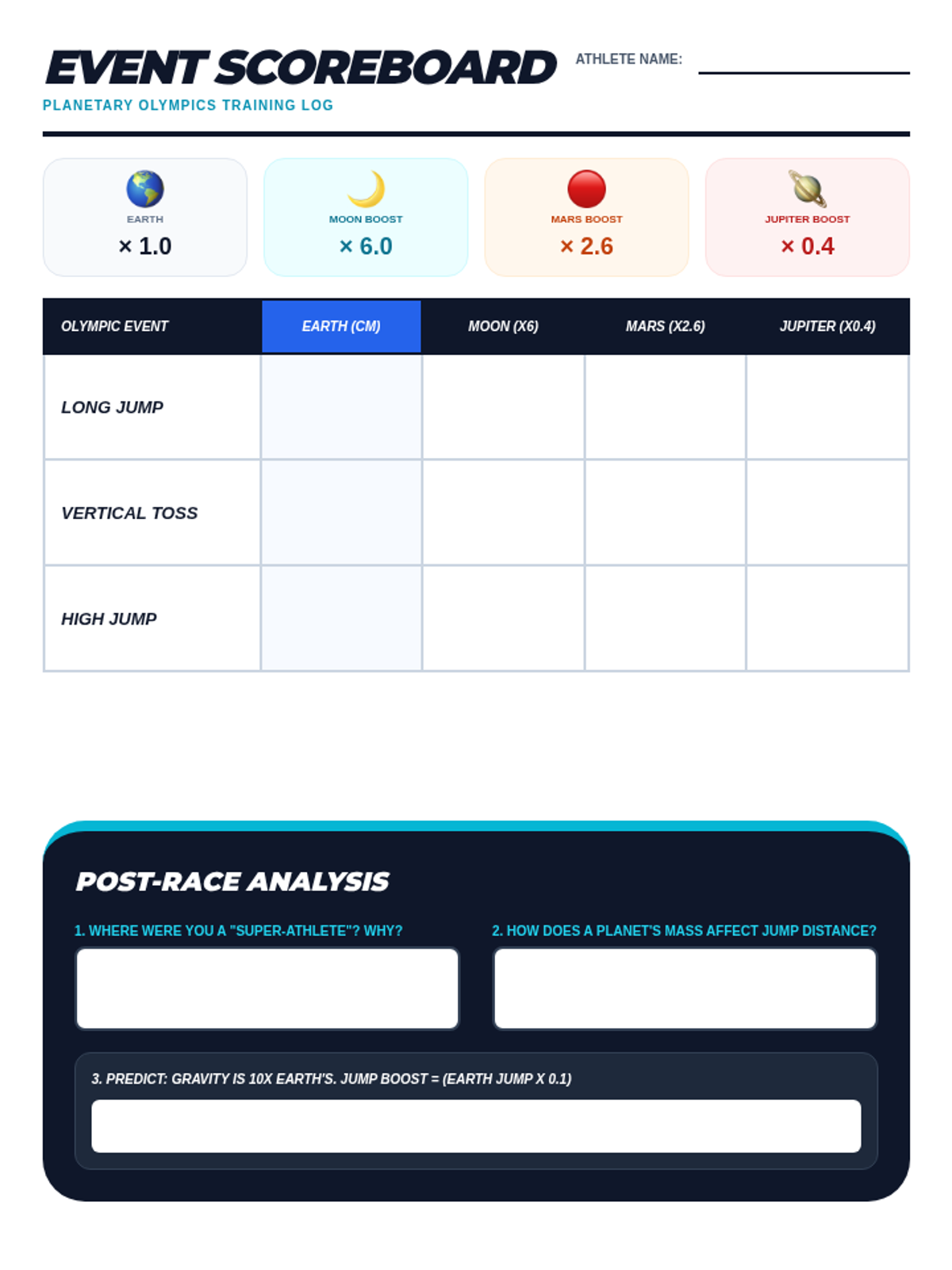 An interactive science lesson where 5th-grade students apply gravitational multipliers to athletic events, comparing their performance on Earth, the Moon, Mars, and Jupiter.