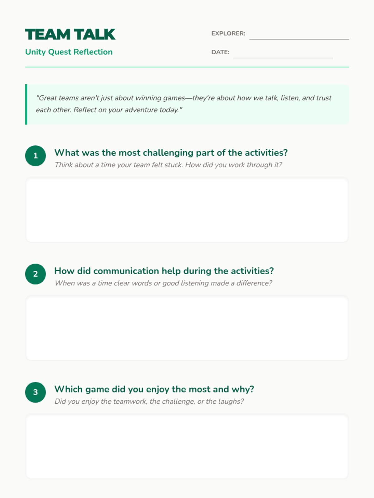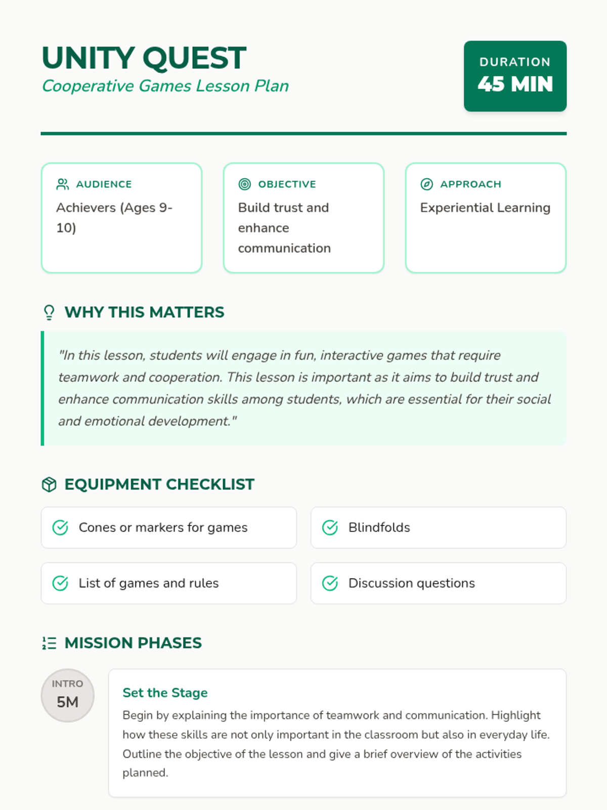 A high-energy lesson focused on building trust, communication, and collaboration through interactive group games like Human Knot and Blindfolded Obstacle Course.
