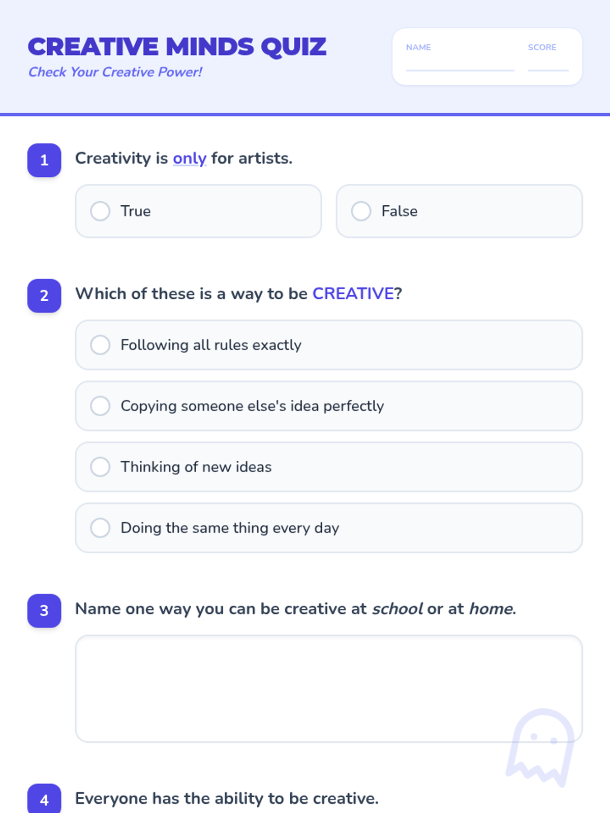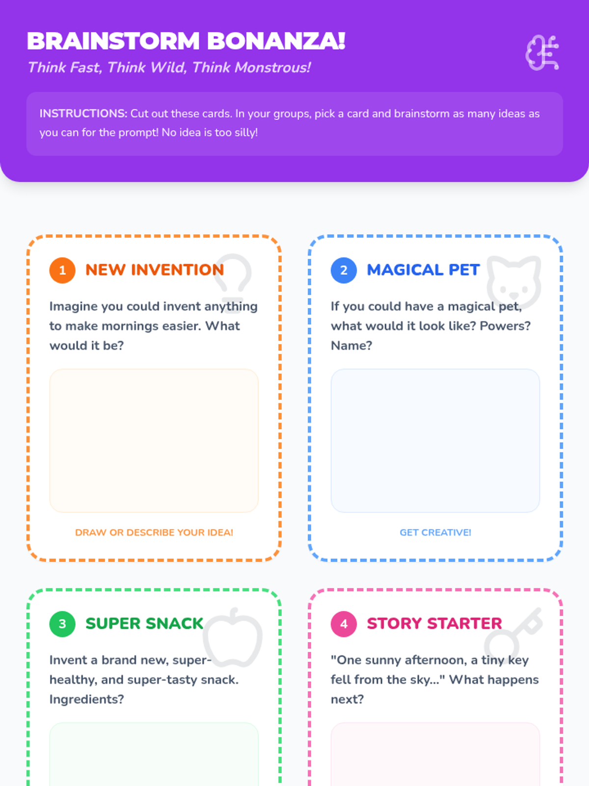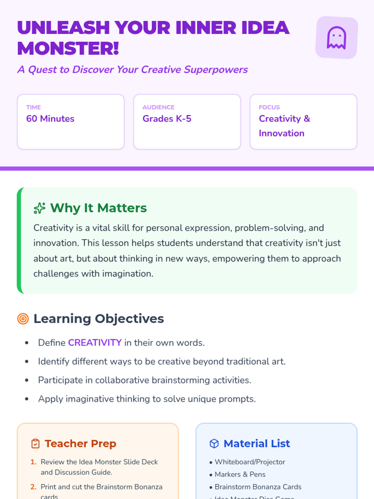A high-energy, 60-minute classroom lesson for K-5 students that explores creativity as a universal skill. Students engage in brainstorming, storytelling games, and individual reflection to discover their 'inner idea monster'.