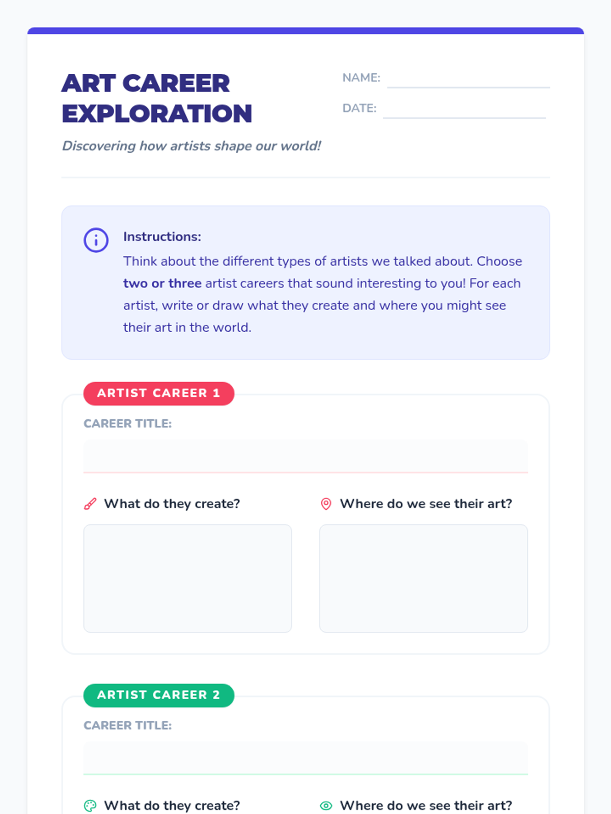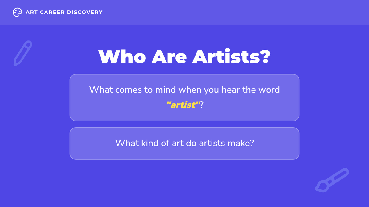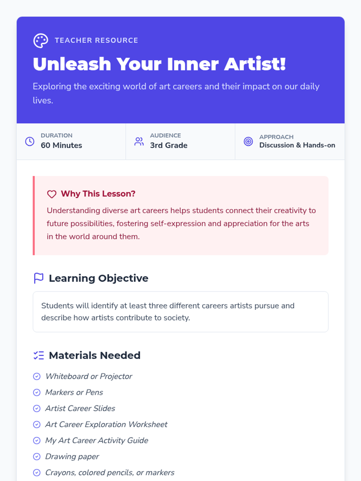 A 3rd-grade lesson exploring various art careers, helping students connect their creativity to real-world possibilities through discussion, visual examples, and hands-on activities.