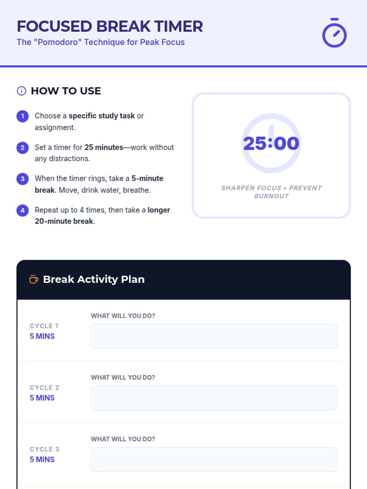 A 15-minute, one-on-one Tier 3 session for 8th graders to explore academic engagement strategies like goal setting, focused breaks, and active note-taking.