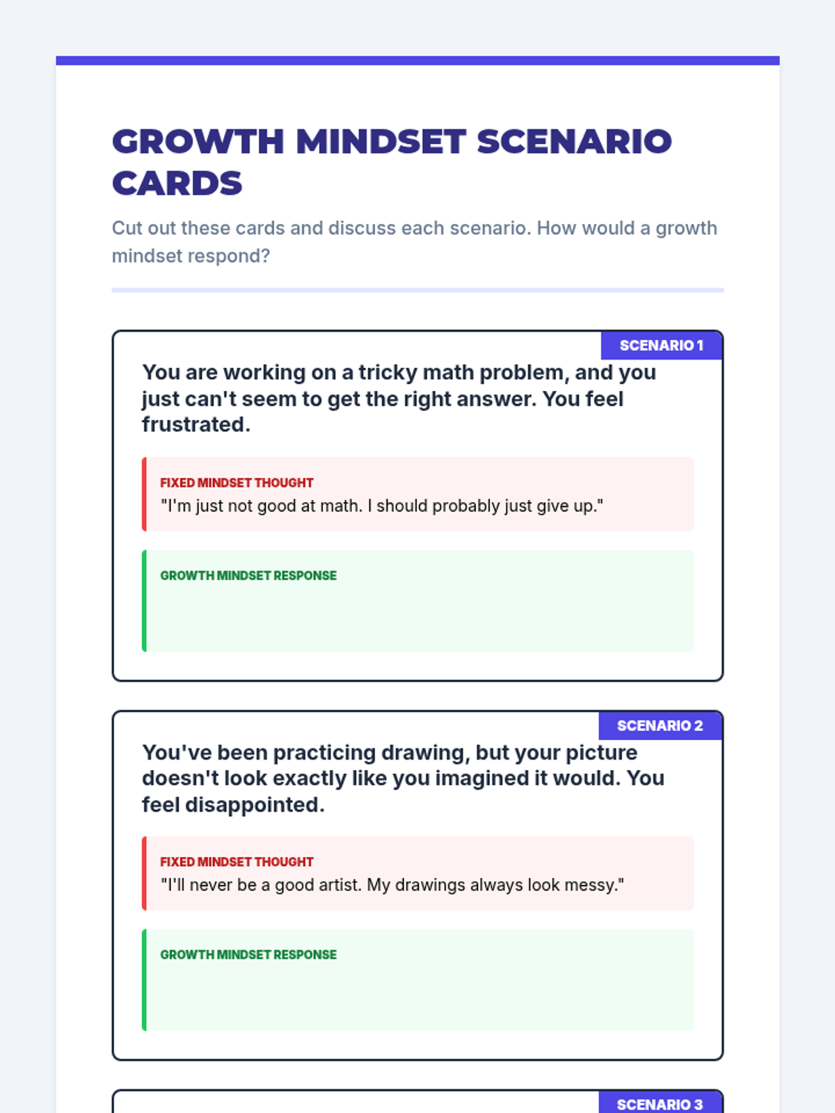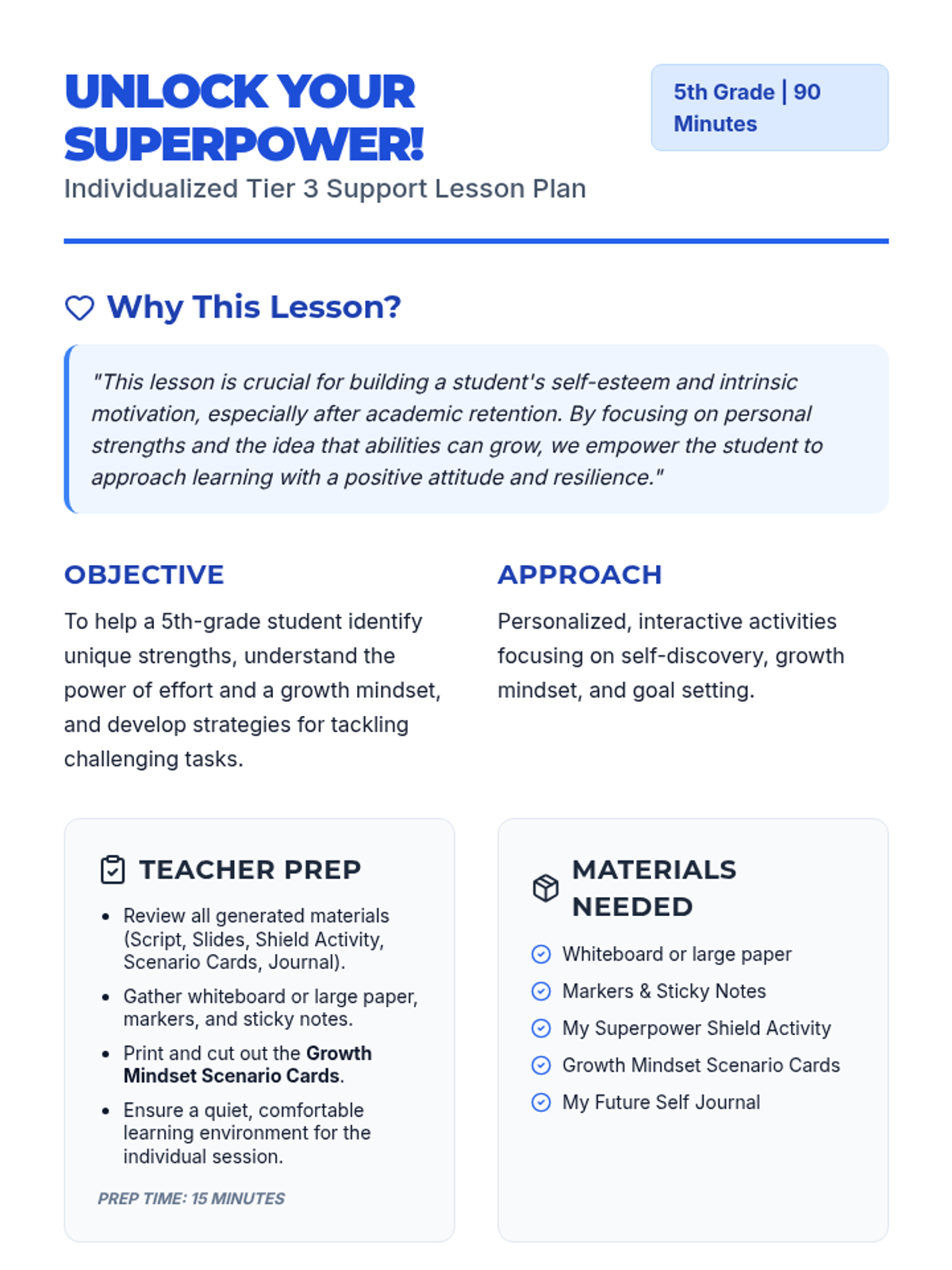 A 90-minute individualized Tier 3 lesson for 5th-grade students to build self-efficacy and a growth mindset through personalized activities and strength-finding.