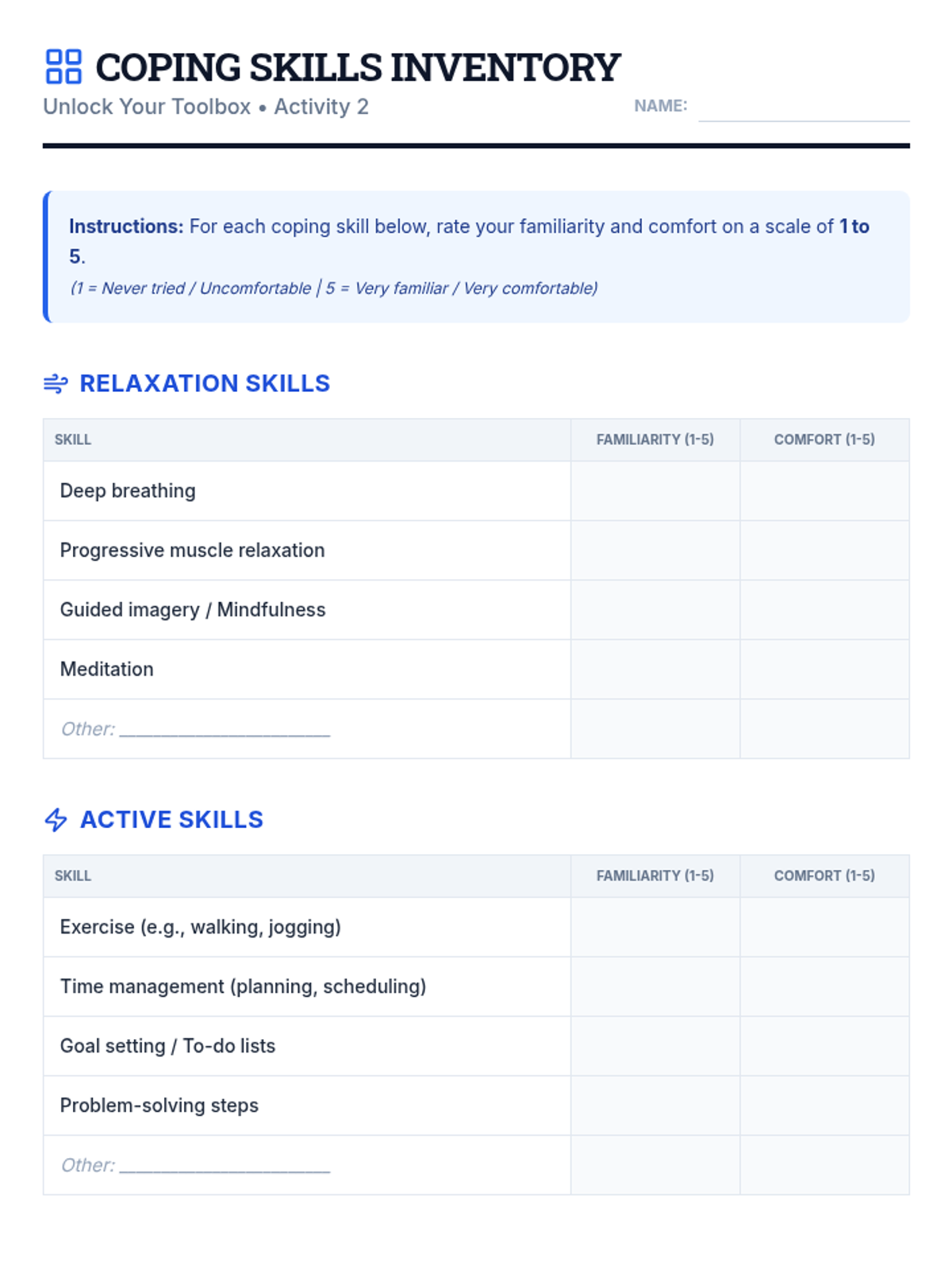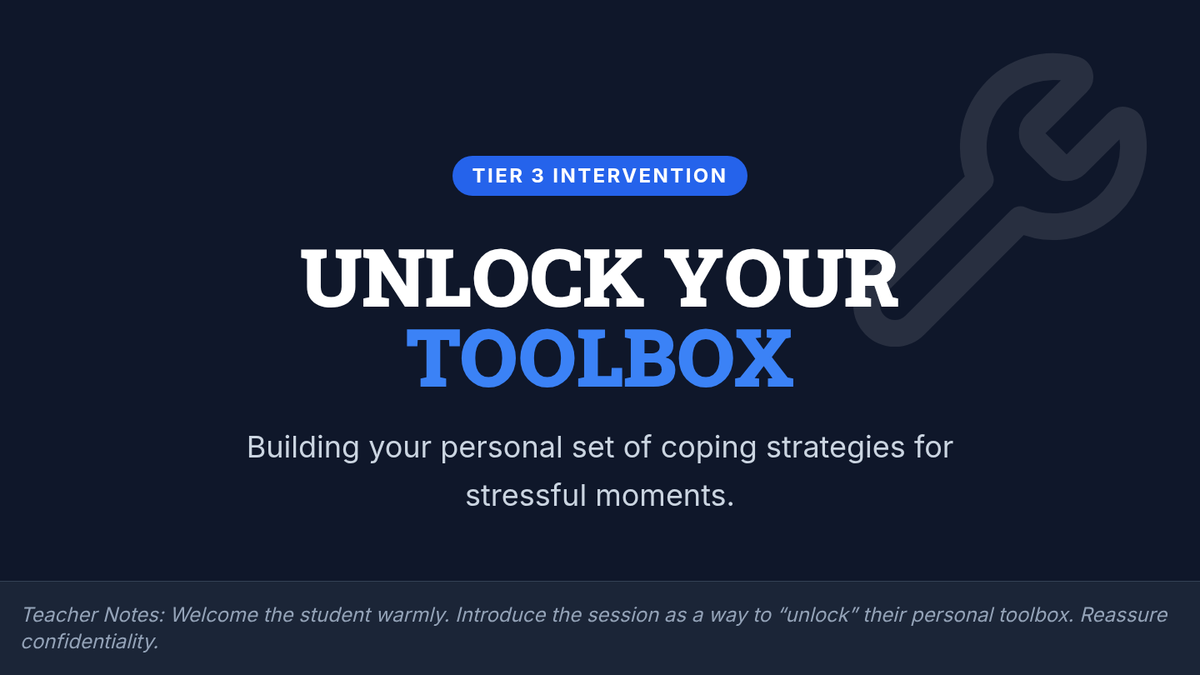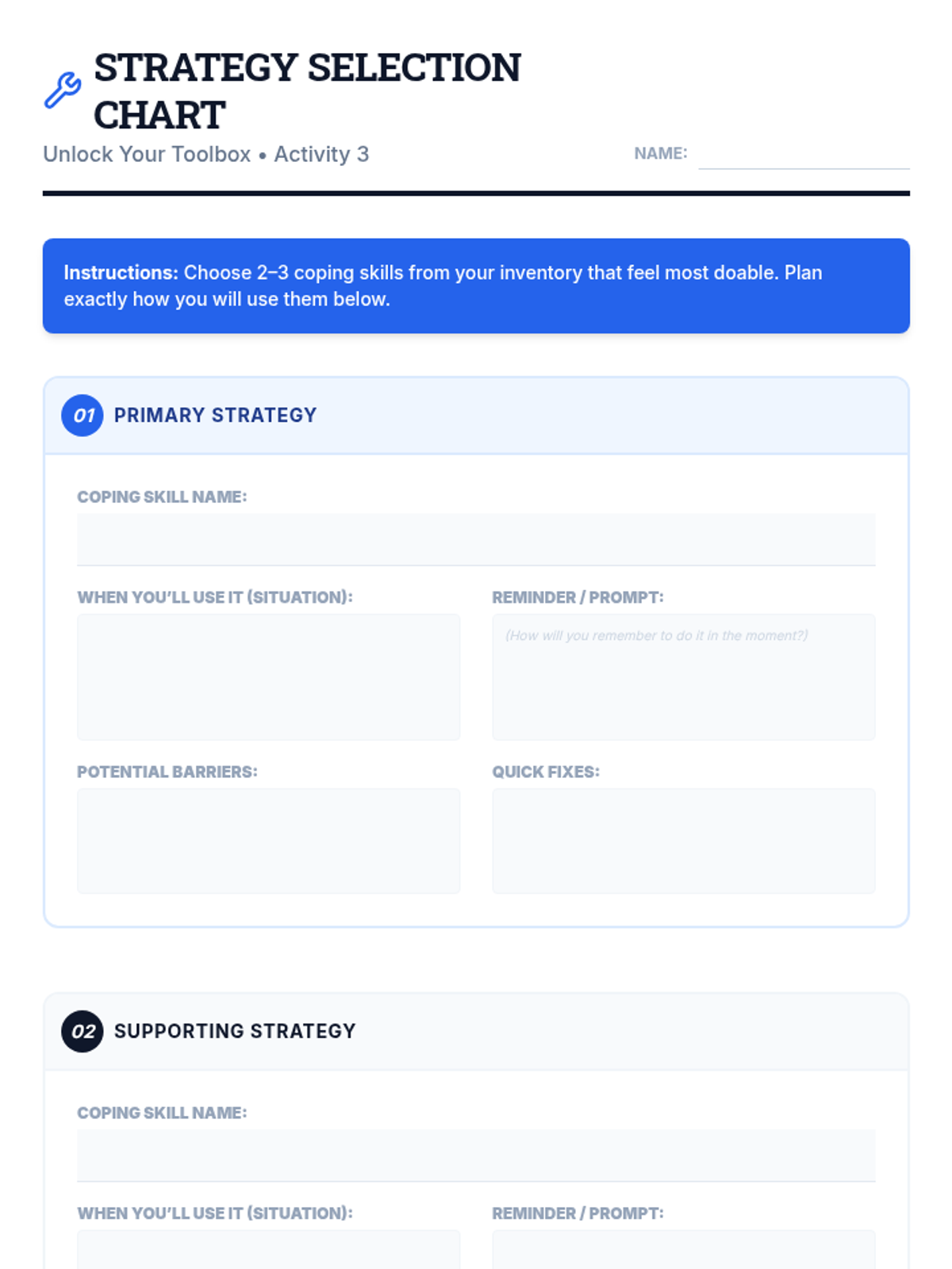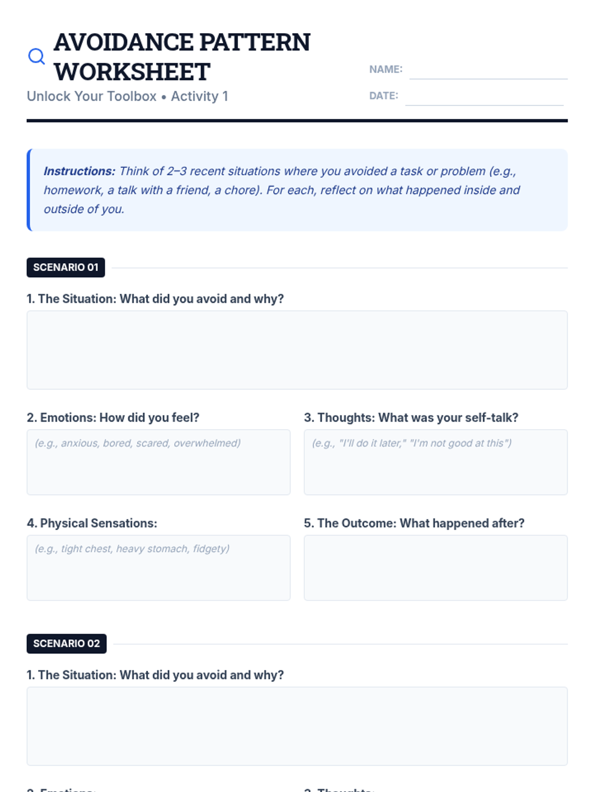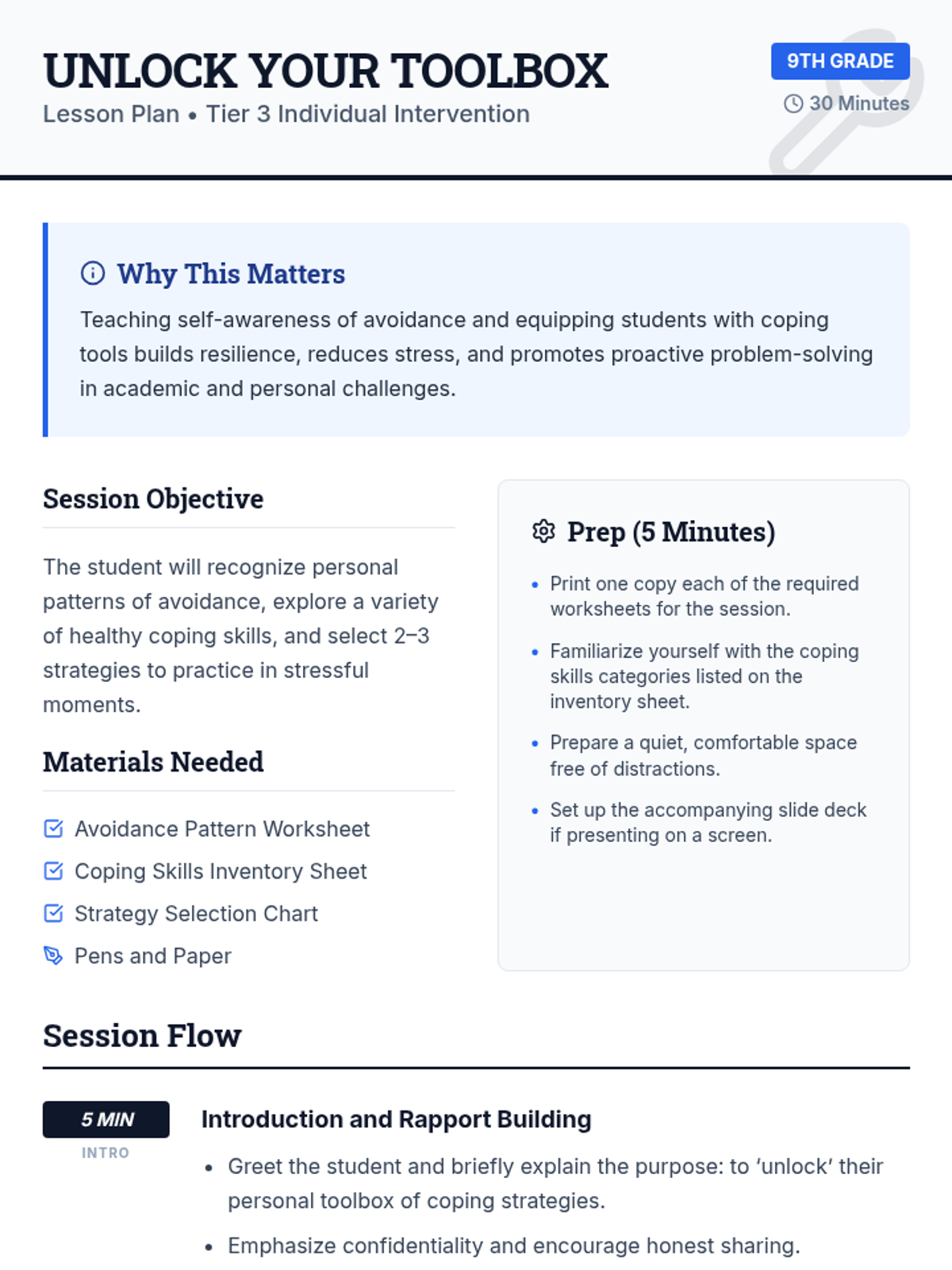 A one-on-one Tier 3 session for 9th graders to identify patterns of avoidance, explore healthy coping skills, and select personalized strategies for stressful moments.