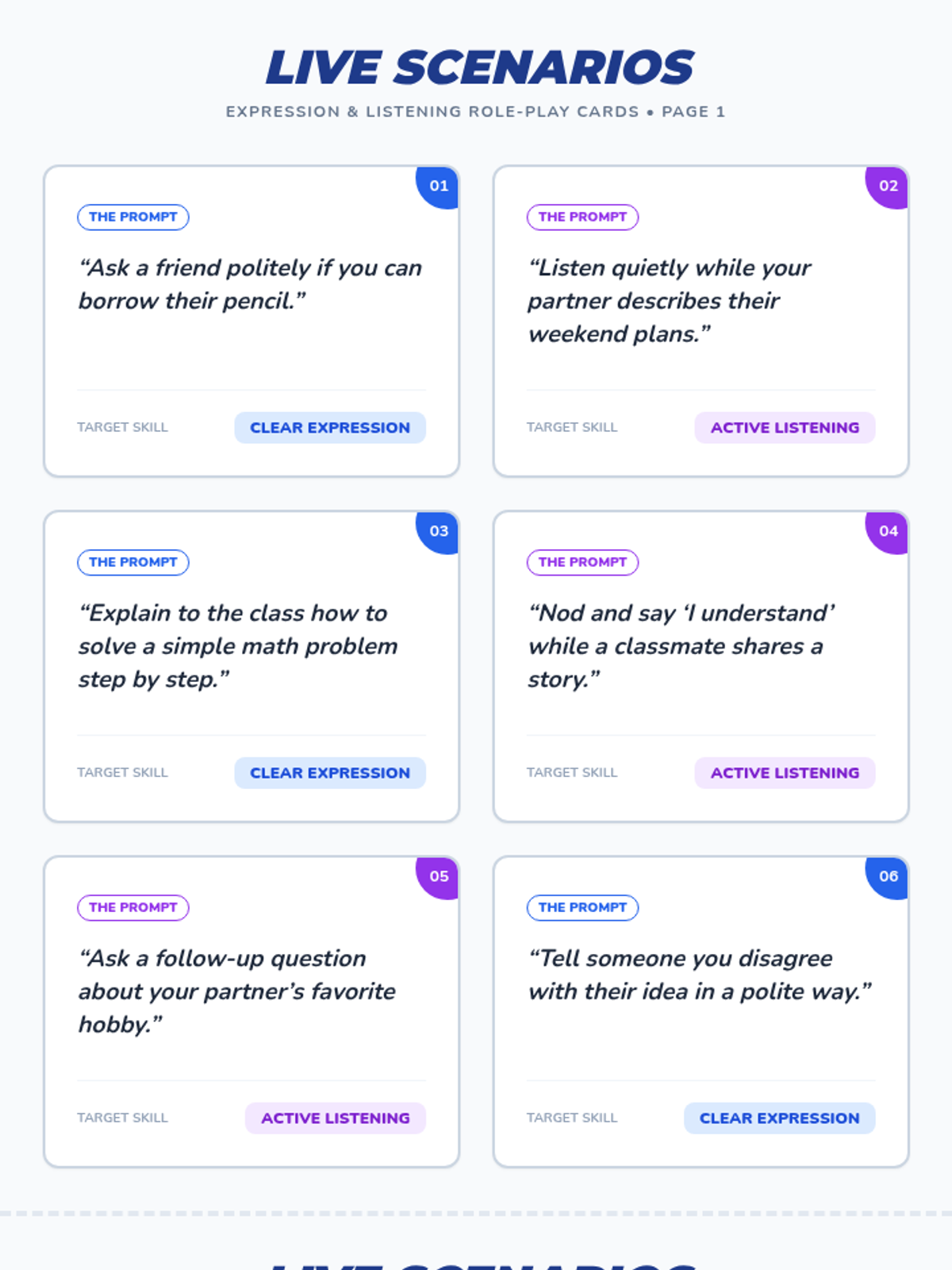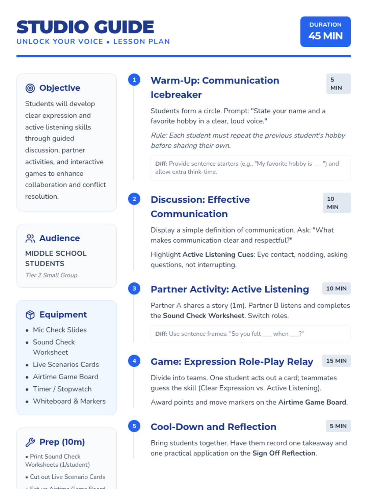 A 45-minute Tier 2 group lesson for middle schoolers to develop clear expression and active listening skills through interactive games and role-play.