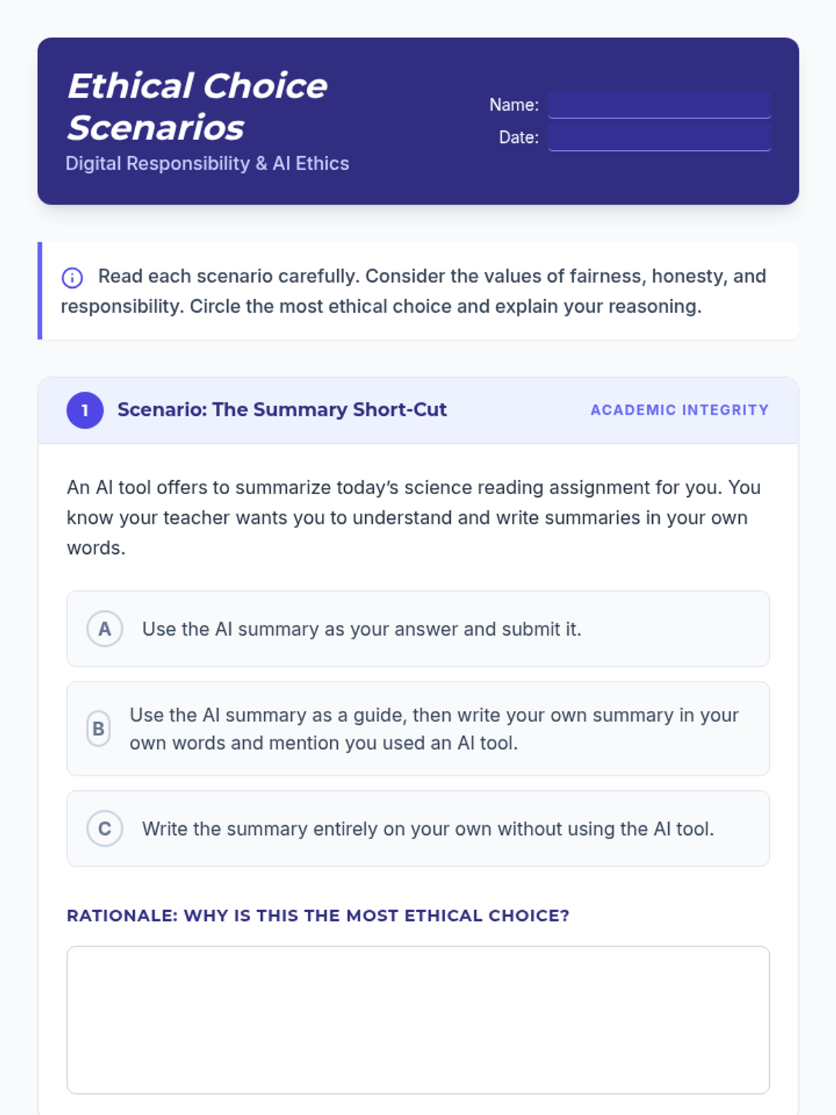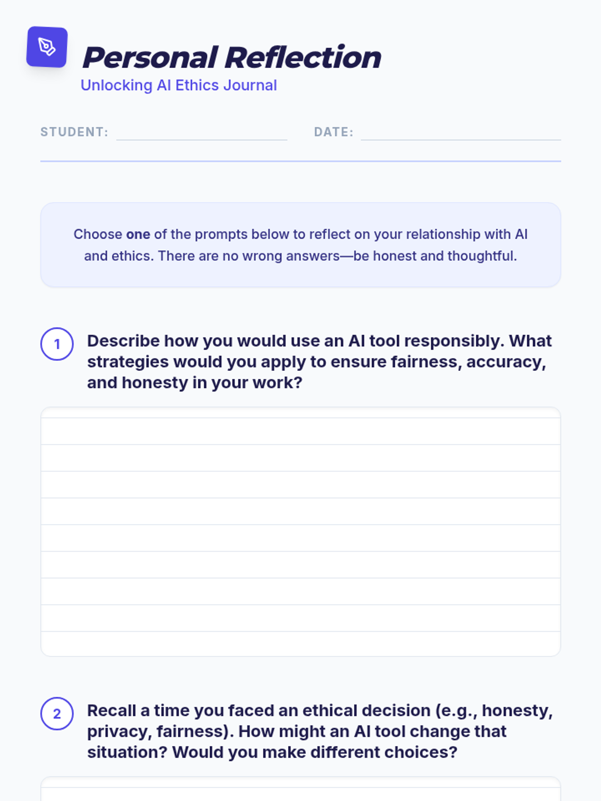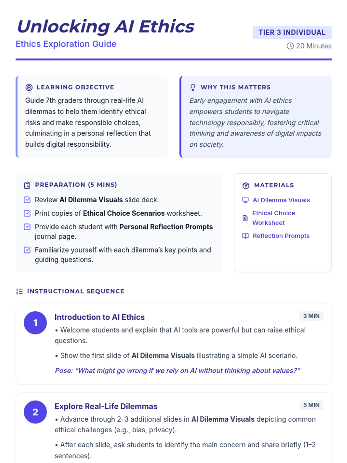 A 20-minute individual lesson for 7th graders to explore AI ethics through real-life dilemmas, guided visuals, and personal journaling.