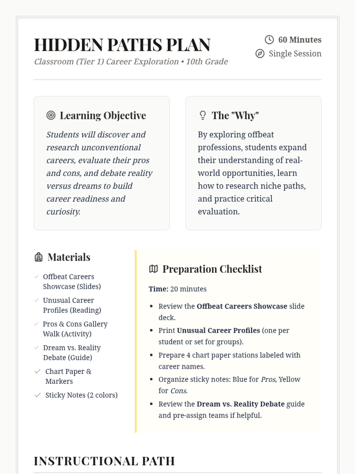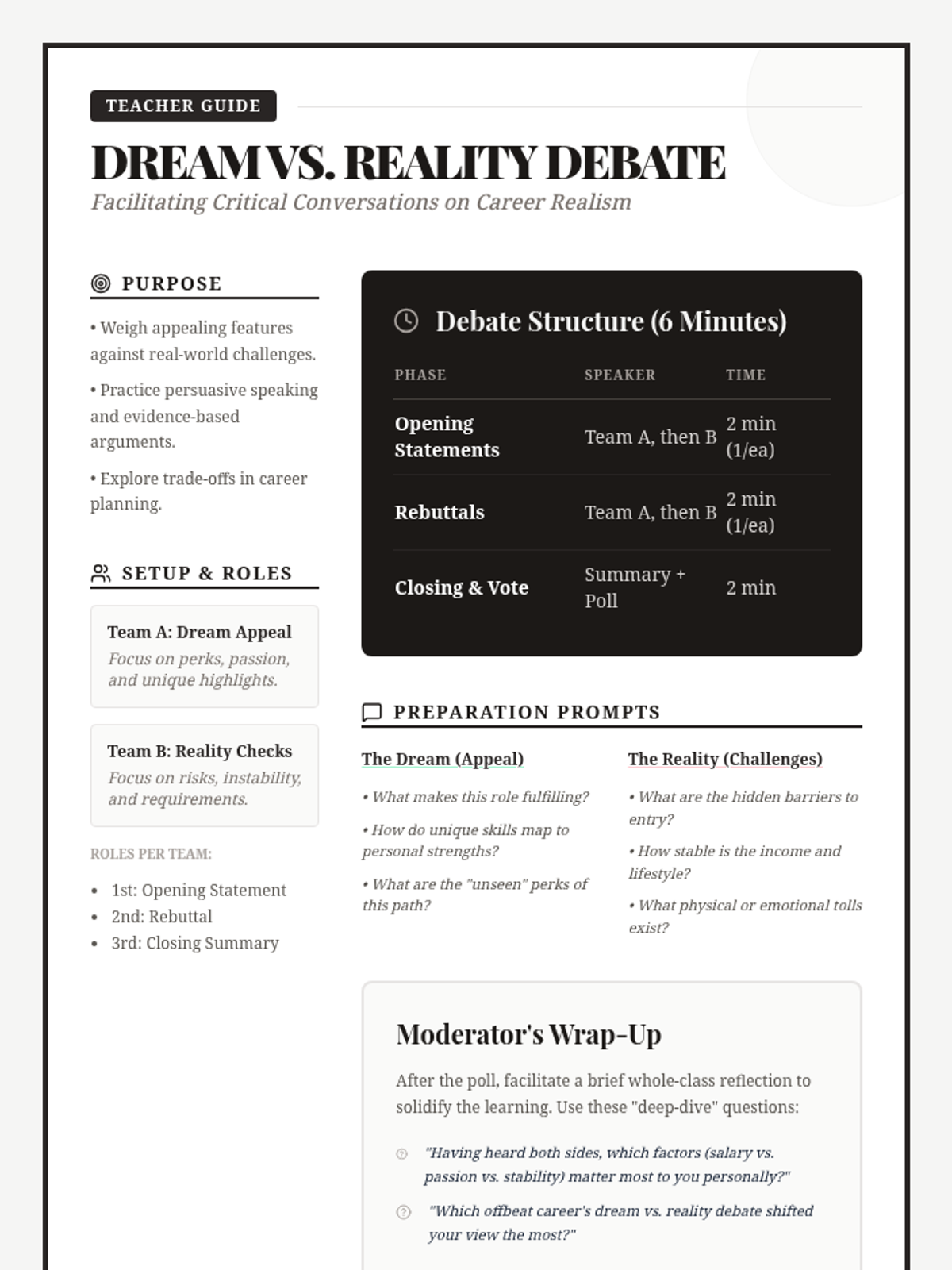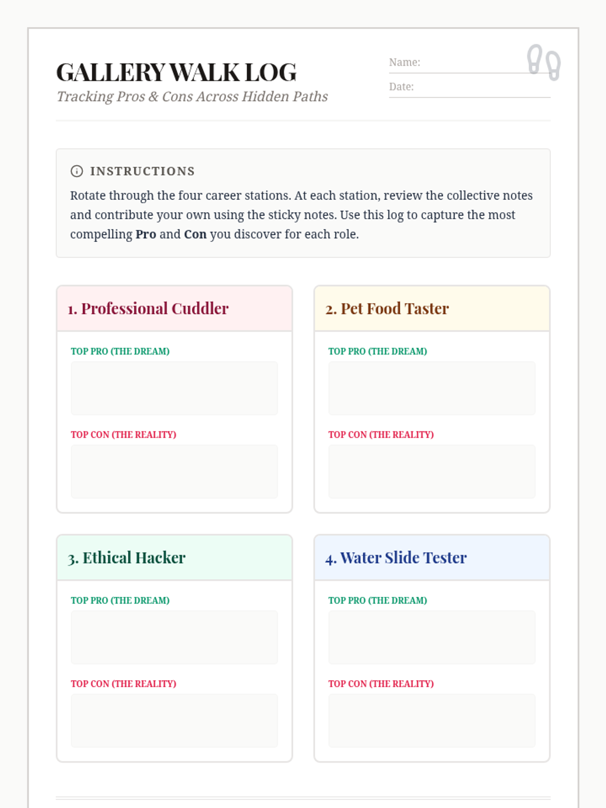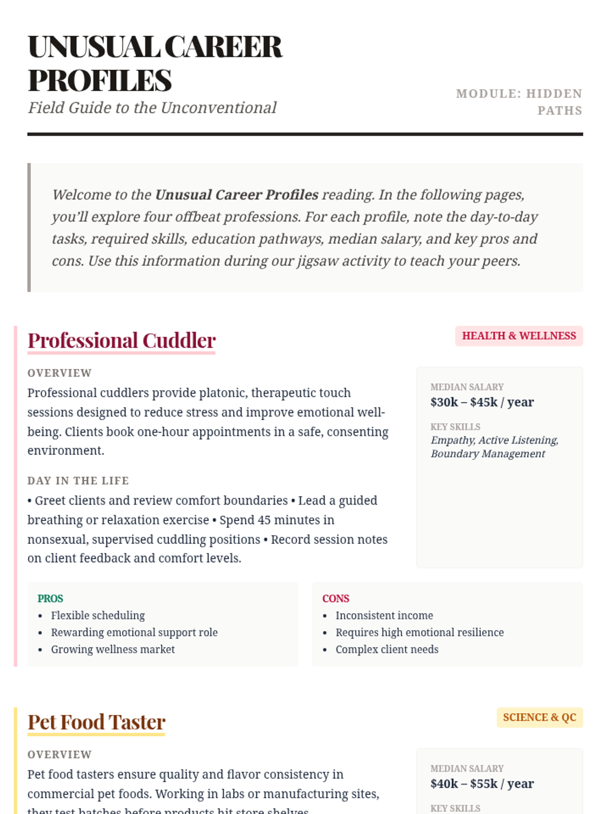 Students explore unconventional career paths like ethical hacking, professional cuddling, and pet food tasting to broaden their understanding of career possibilities and evaluate the balance between dream jobs and real-world challenges.