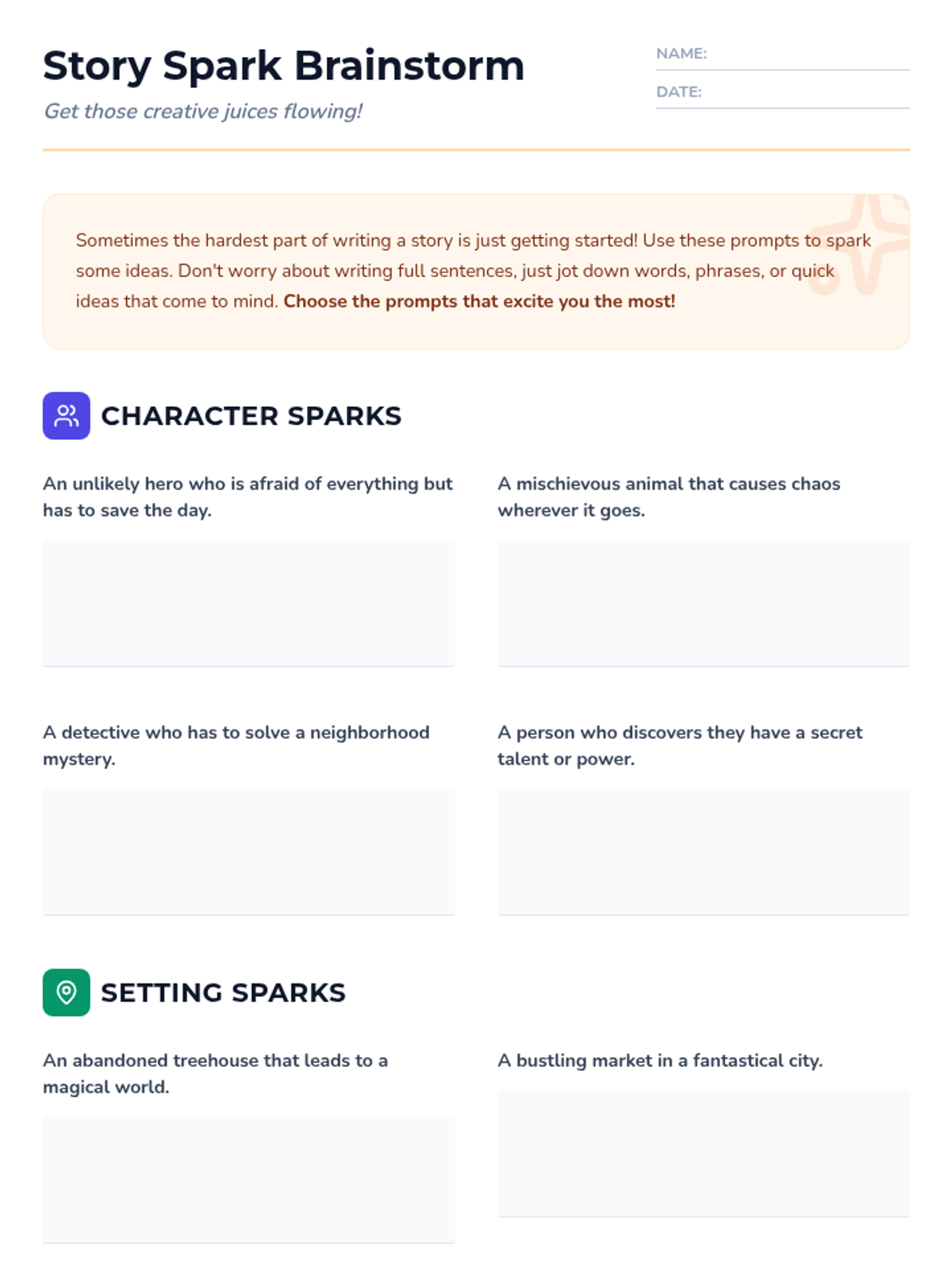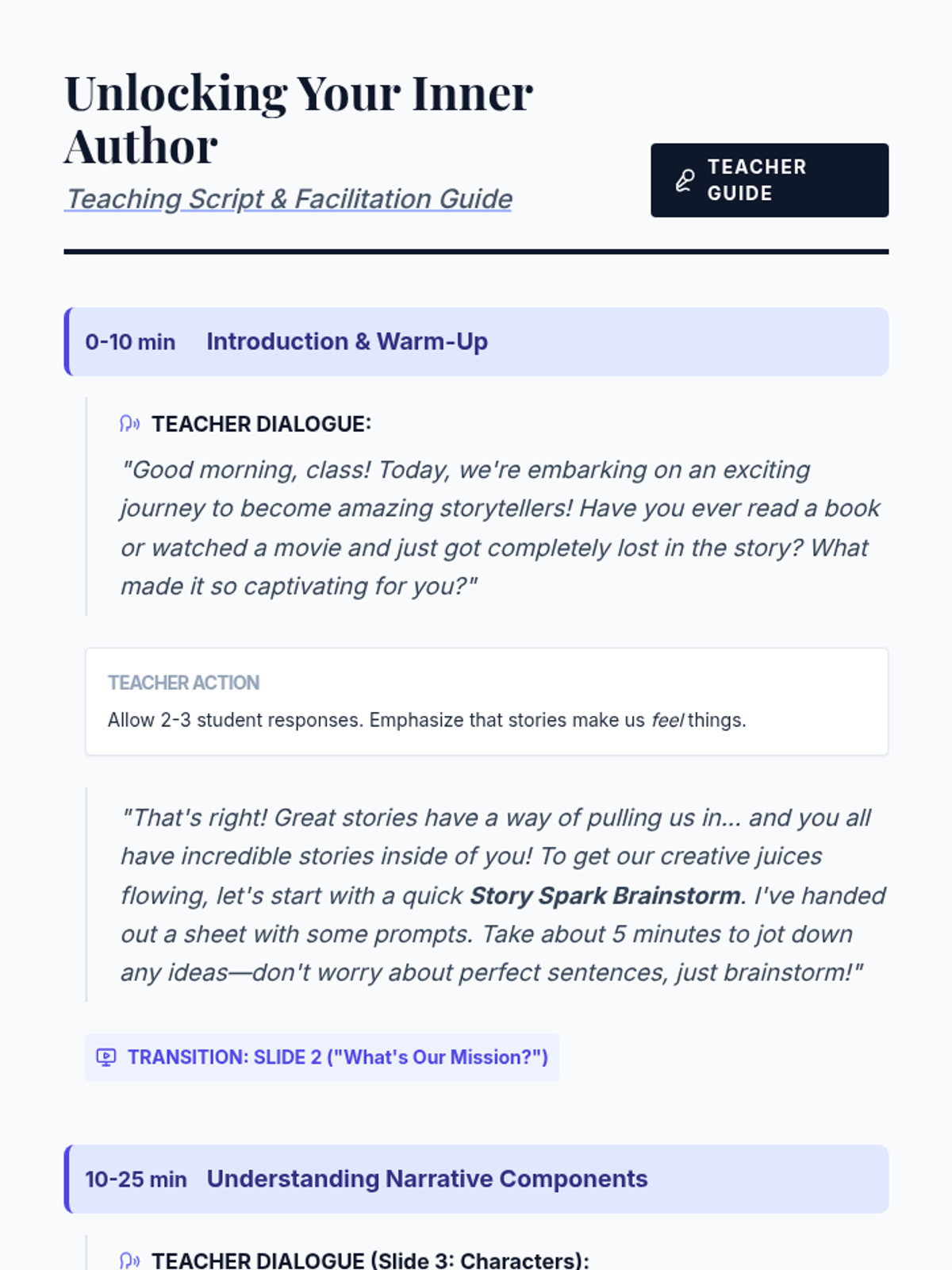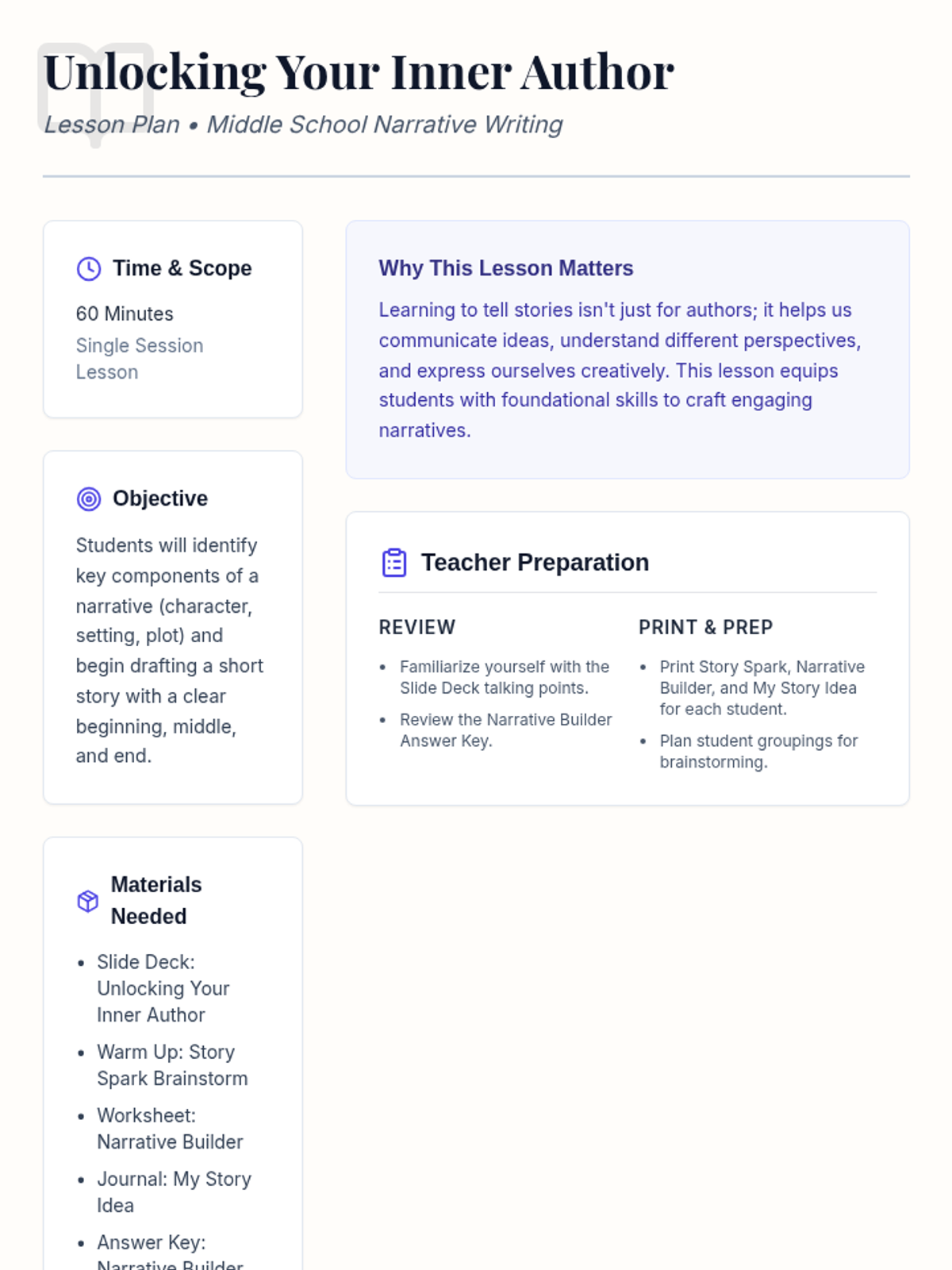 A middle school narrative writing lesson where students learn to craft compelling stories by focusing on character, setting, and plot structure through interactive brainstorming and guided drafting.