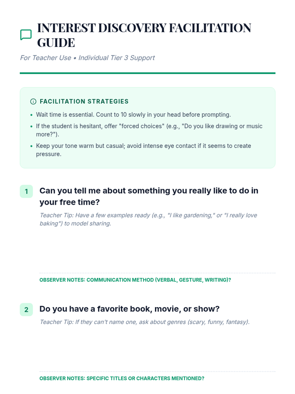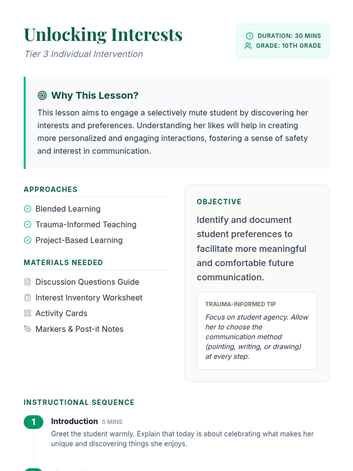 A Tier 3 intervention lesson designed to engage a 10th-grade selectively mute student by uncovering personal interests and preferences in a low-pressure, supportive environment.