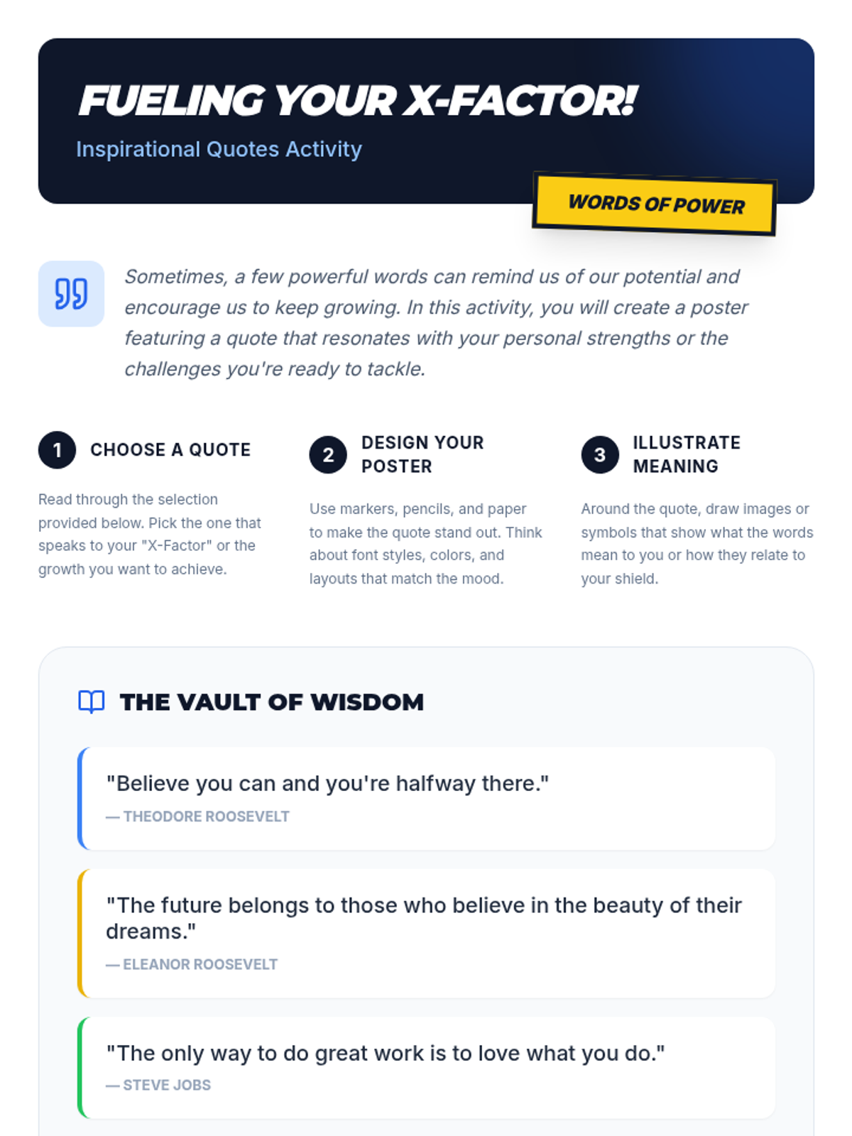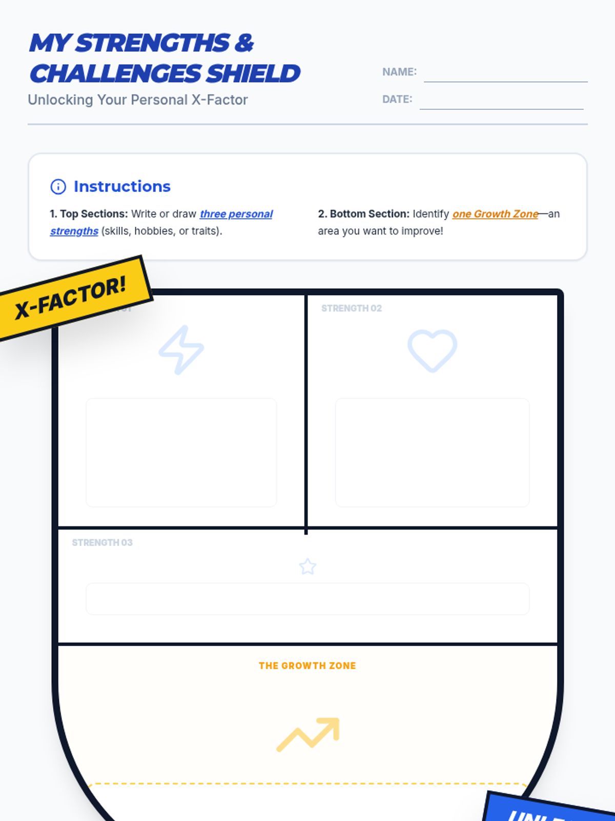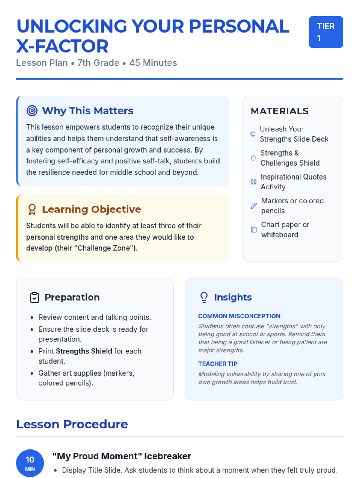 A 45-minute lesson for 7th-grade students to identify personal strengths and areas for growth, fostering self-efficacy and positive self-talk through reflection and a creative shield-building activity.