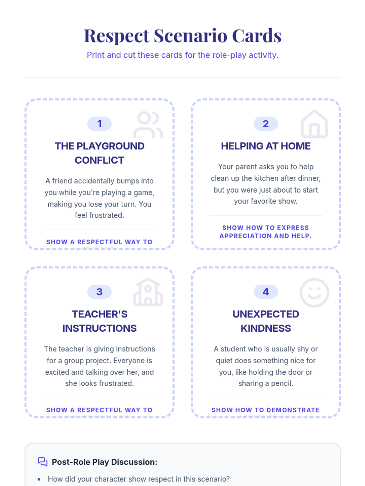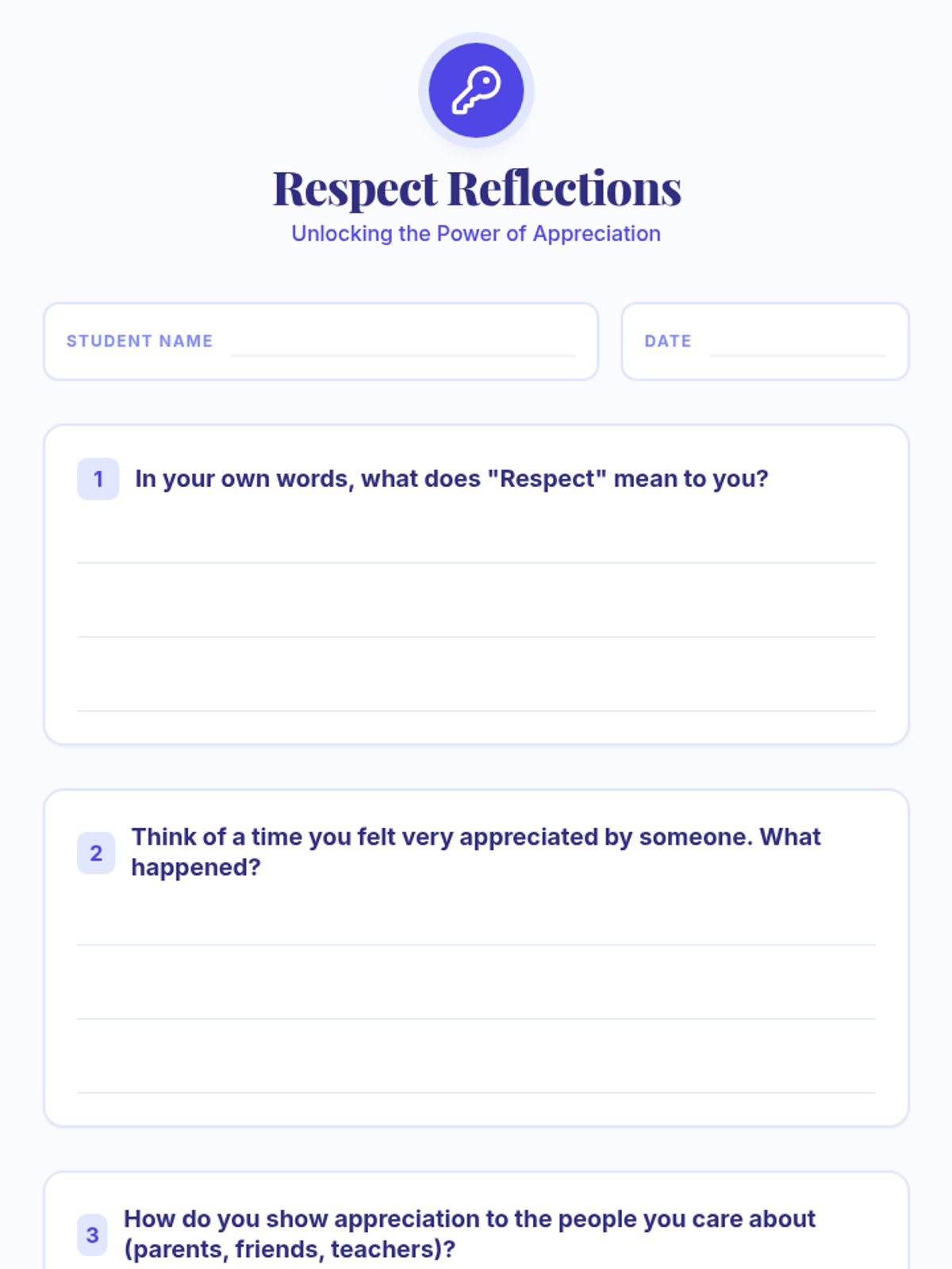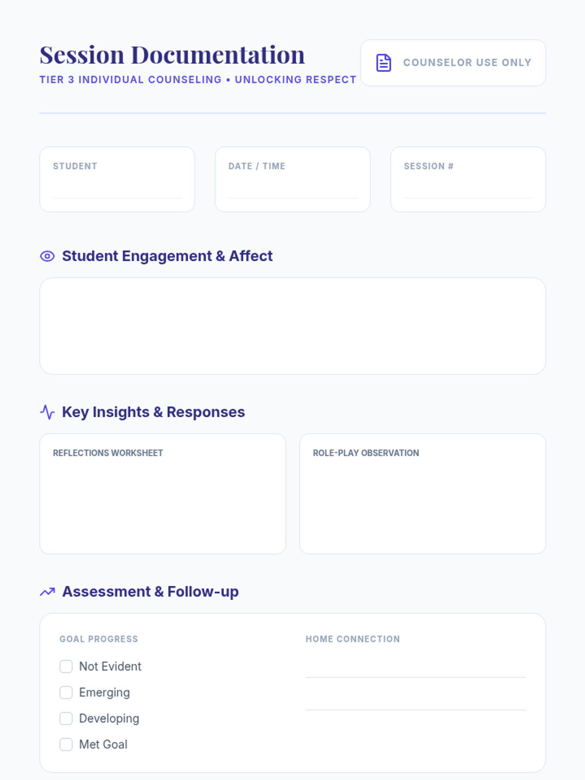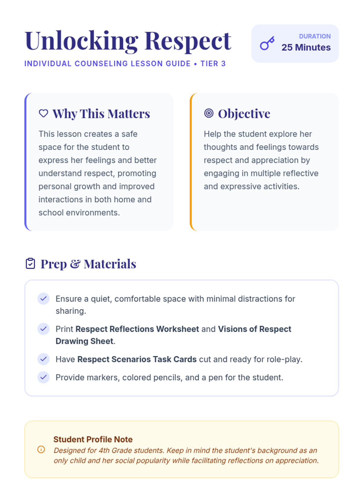 A Tier 3 individual counseling lesson for a 4th-grade student to explore themes of respect and appreciation through reflection, role-play, and creative expression.