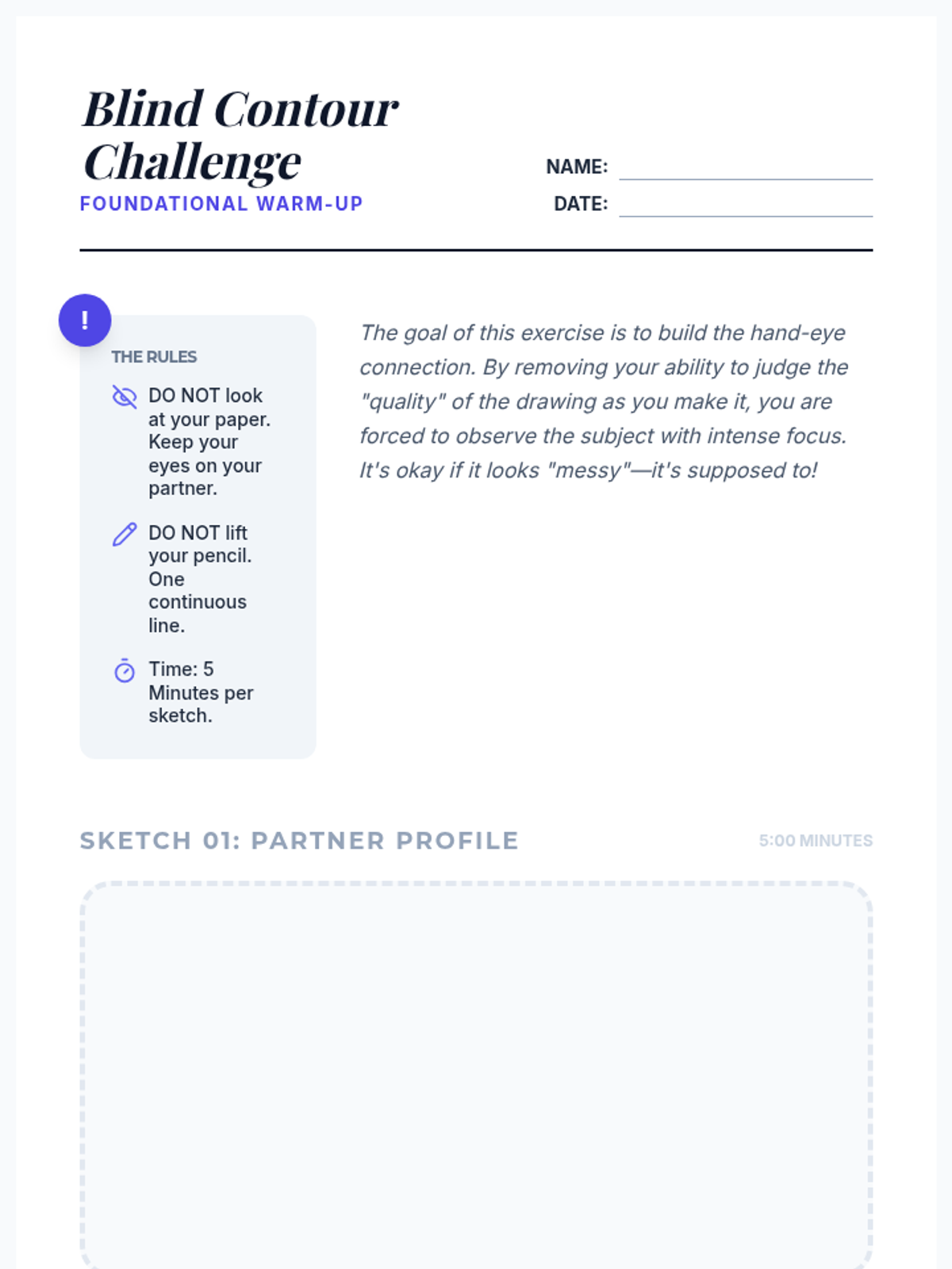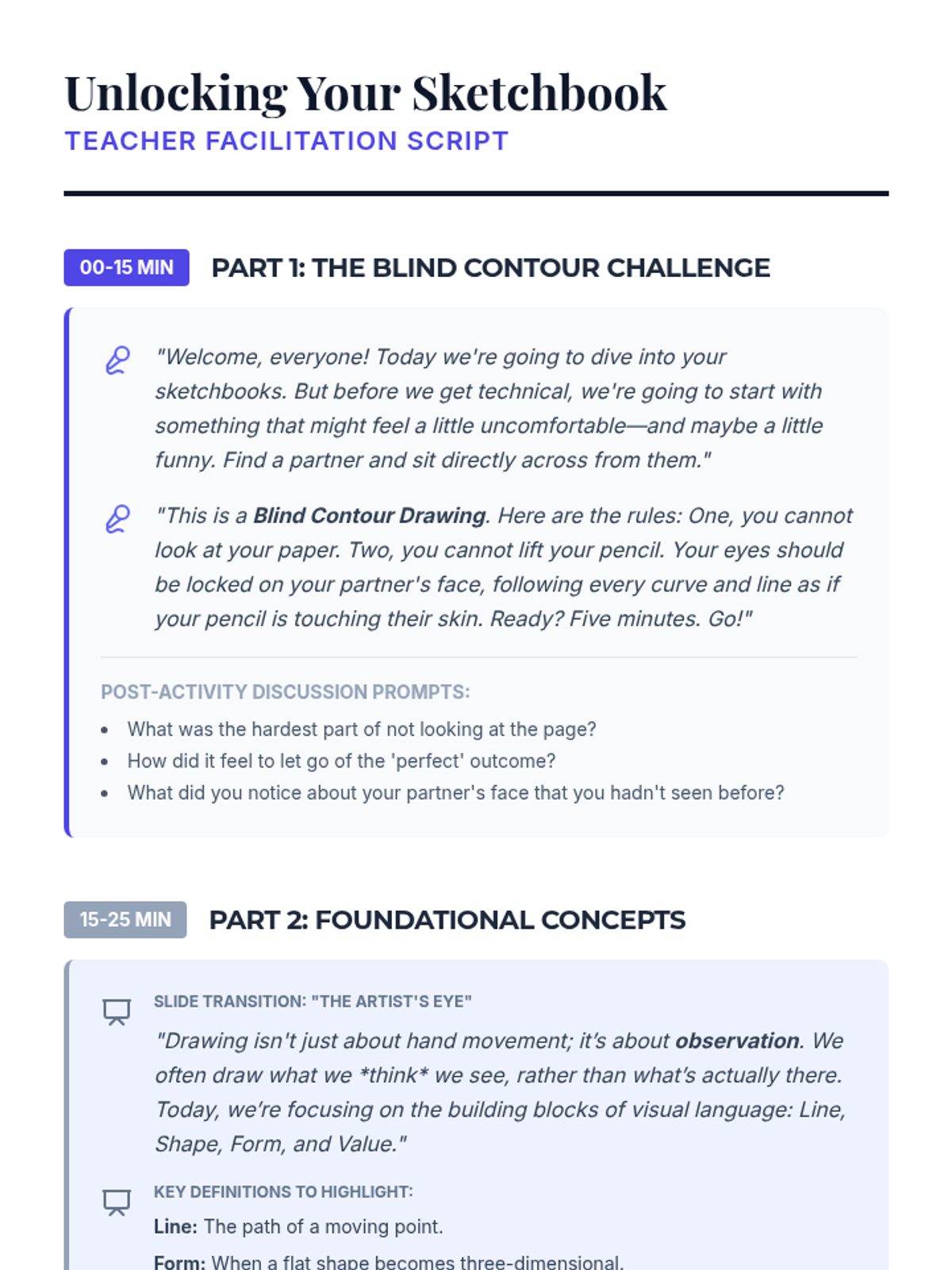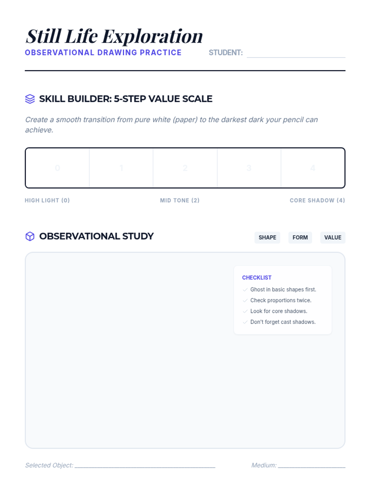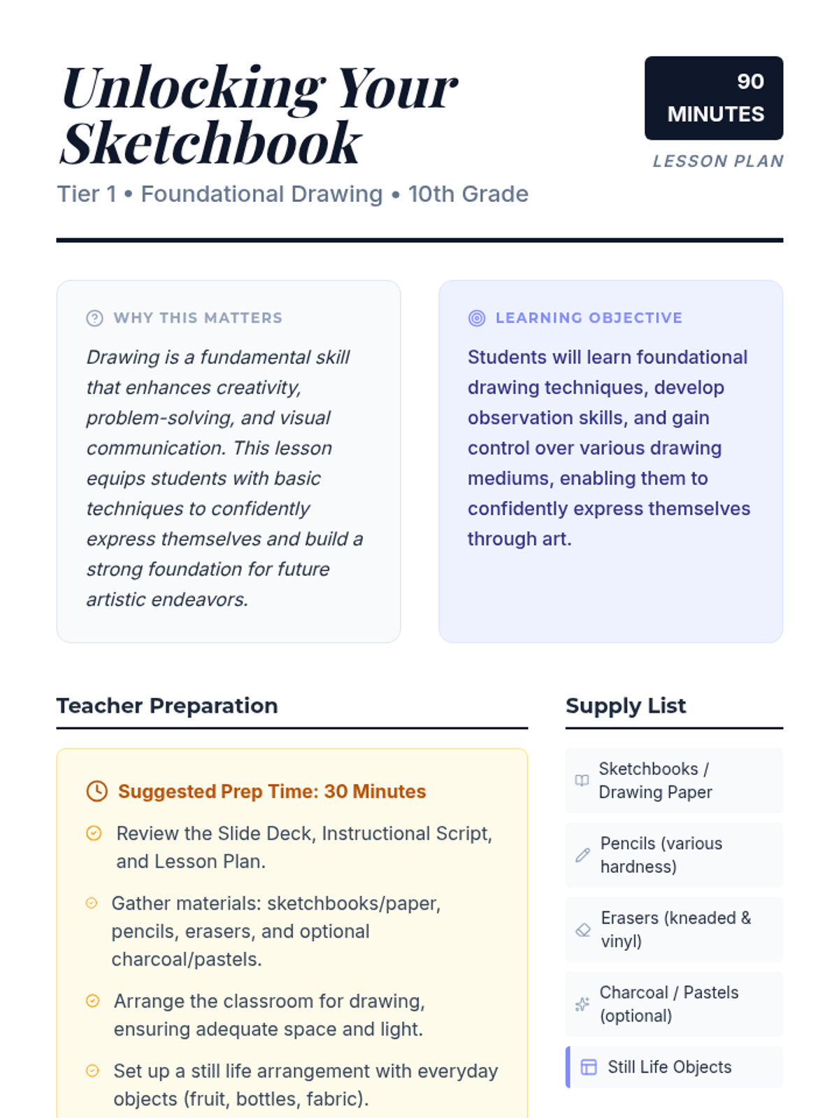 A foundational drawing lesson for 10th graders focusing on observation skills, medium control, and expressive sketching techniques through hands-on practice.