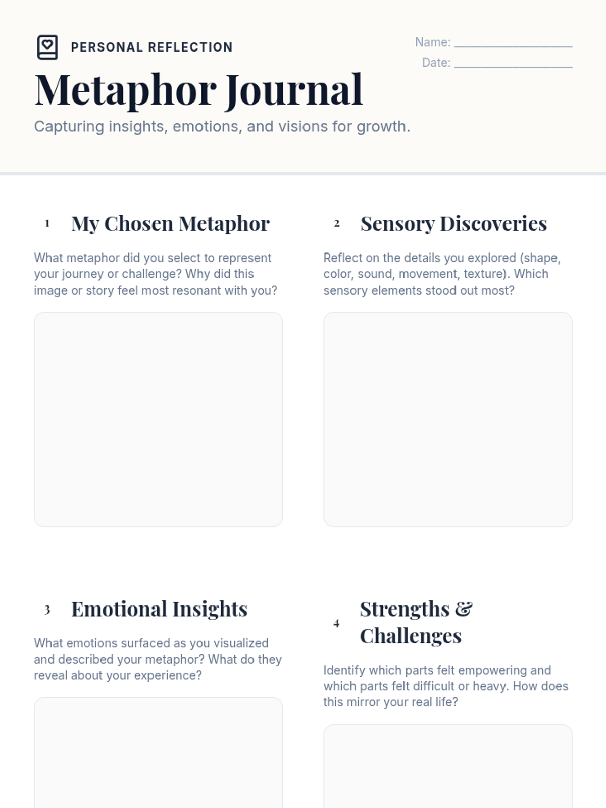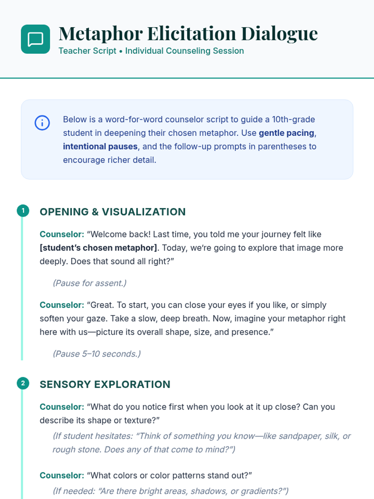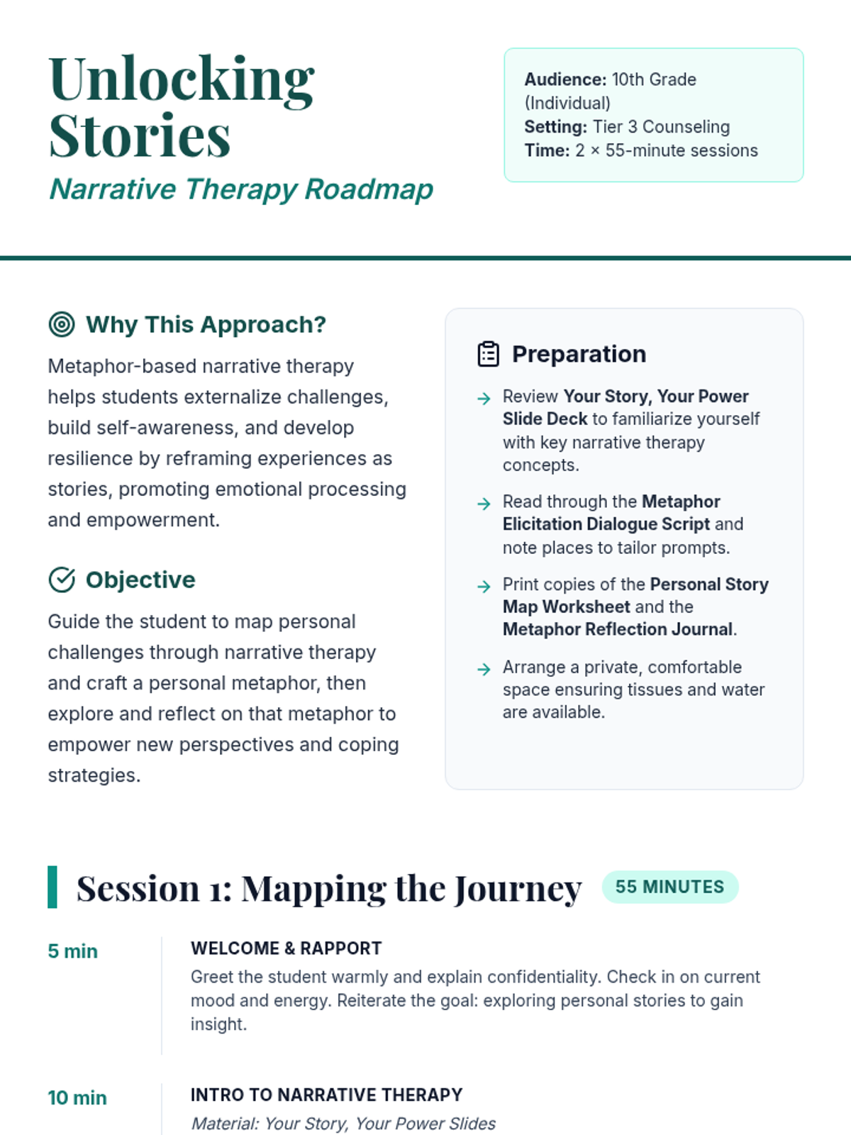 A Tier 3 narrative therapy sequence for 10th-grade students to externalize challenges and build empowerment through the creation and analysis of personal metaphors. Across two 55-minute sessions, students map their life stories and develop a resonant metaphor to reframe their experiences and build resilience.