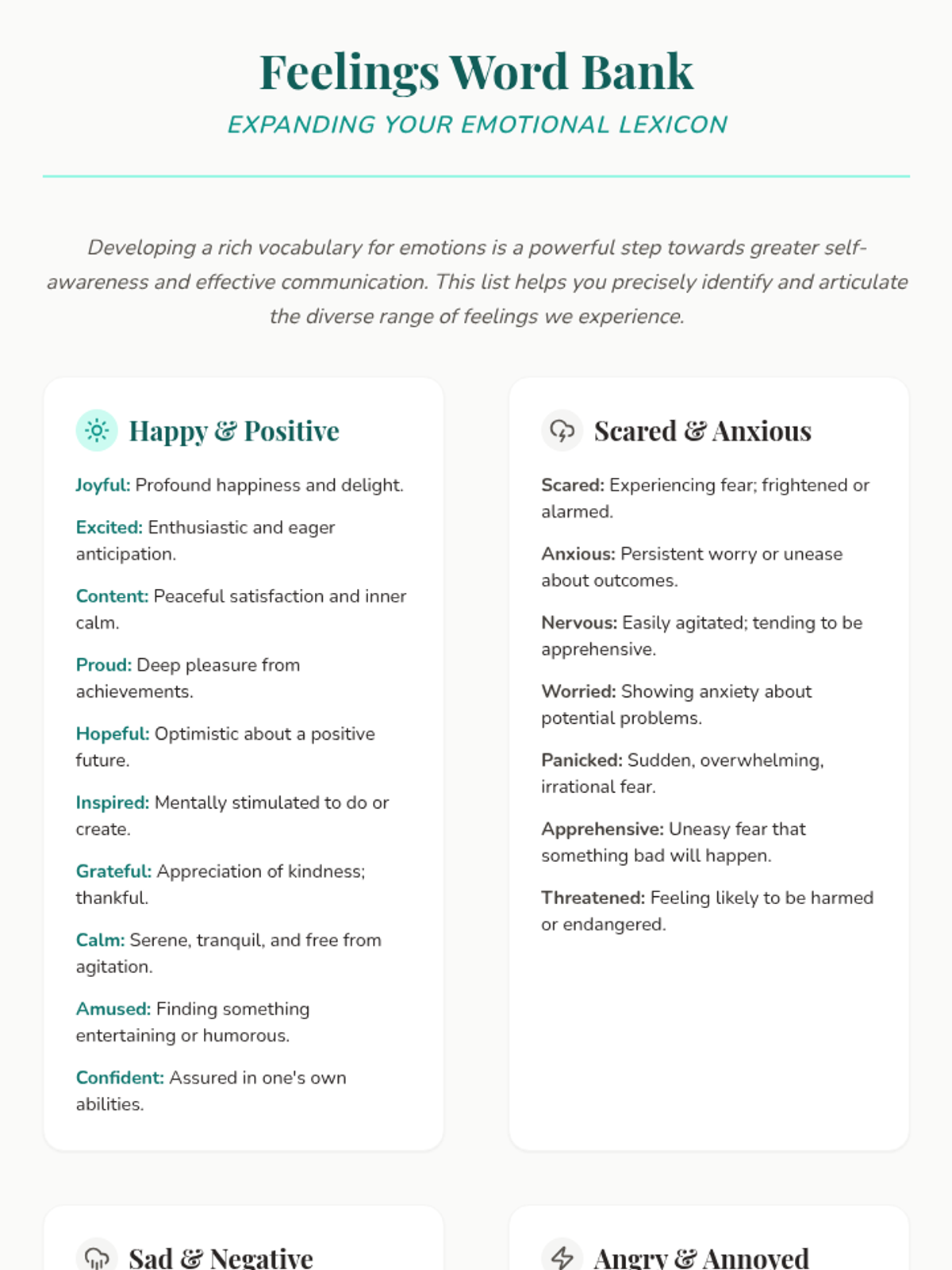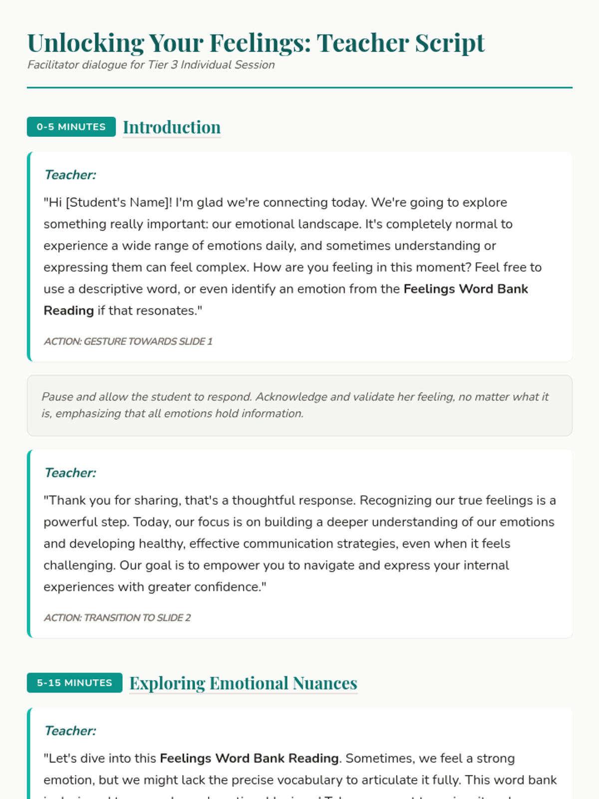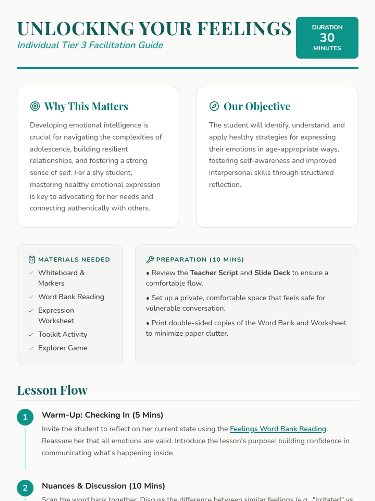 A specialized Tier 3 lesson for a 7th-grade student to build emotional literacy, vocabulary, and healthy expression strategies through personalized activities and guided reflection.