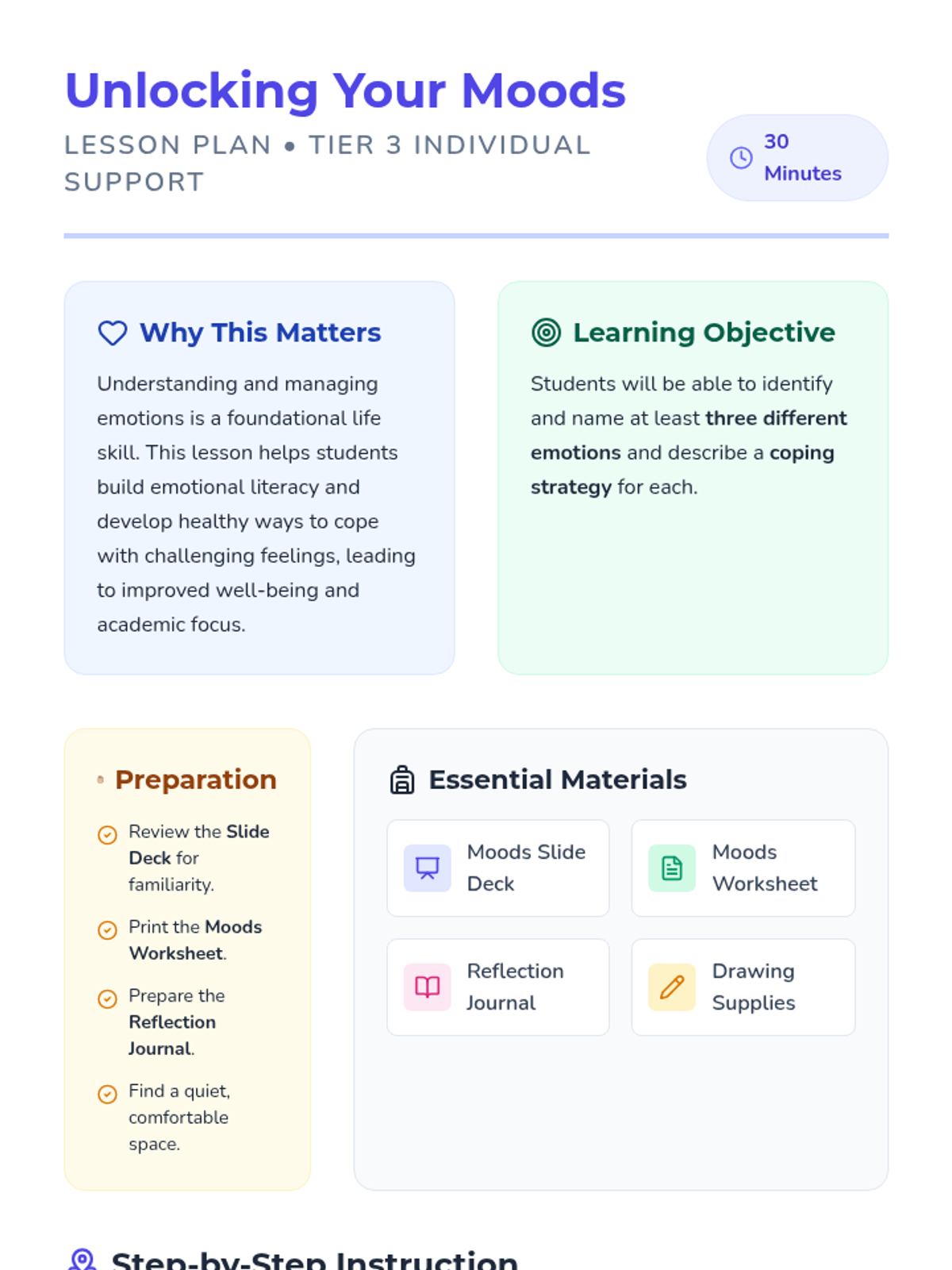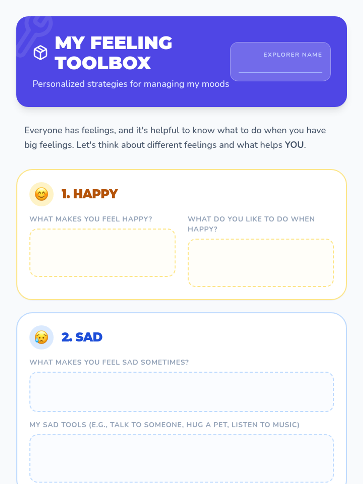 An individual Tier 3 lesson for 3rd-grade students to identify emotions and build a personal 'toolbox' of coping strategies for self-regulation.
