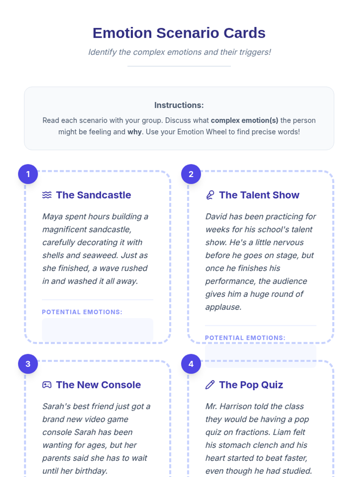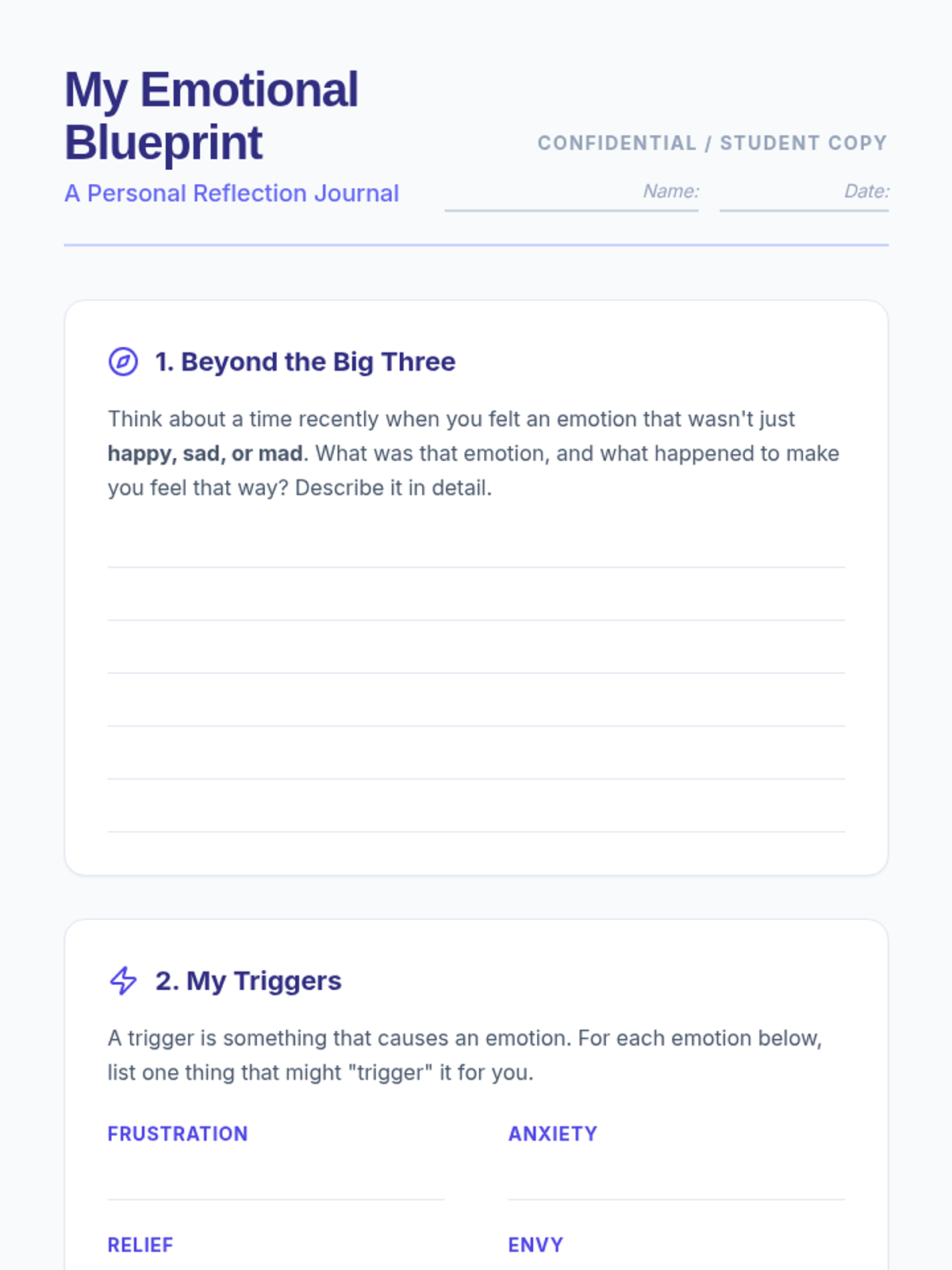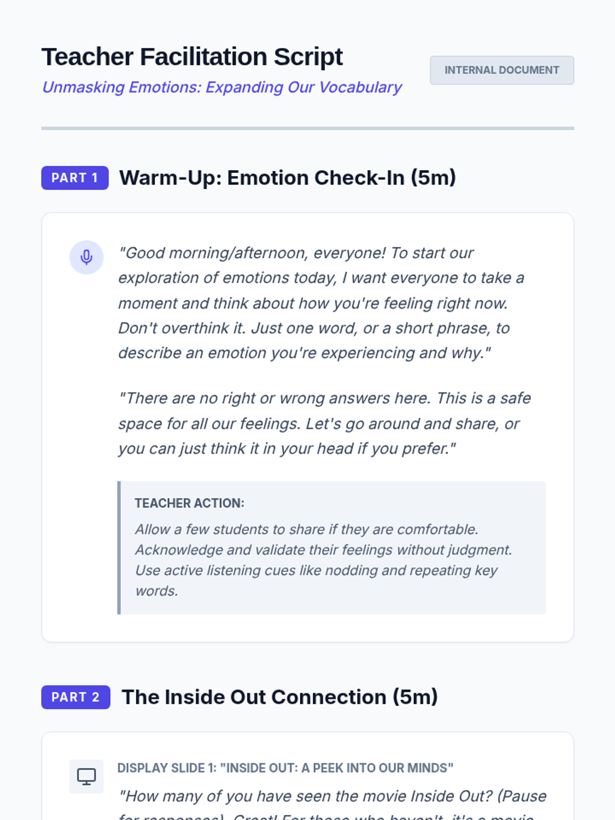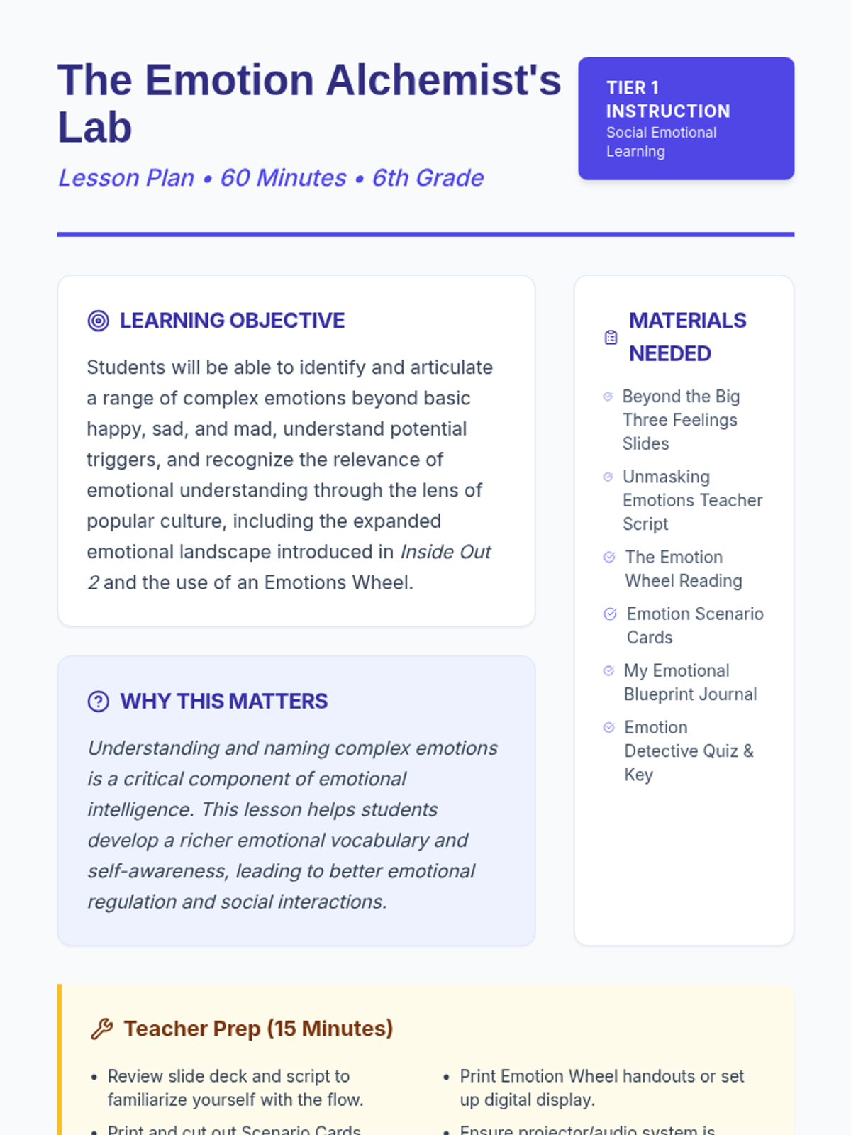 An engaging 60-minute lesson for 6th graders to expand their emotional vocabulary beyond happy, sad, and mad, using metaphors from Inside Out and the Emotions Wheel.