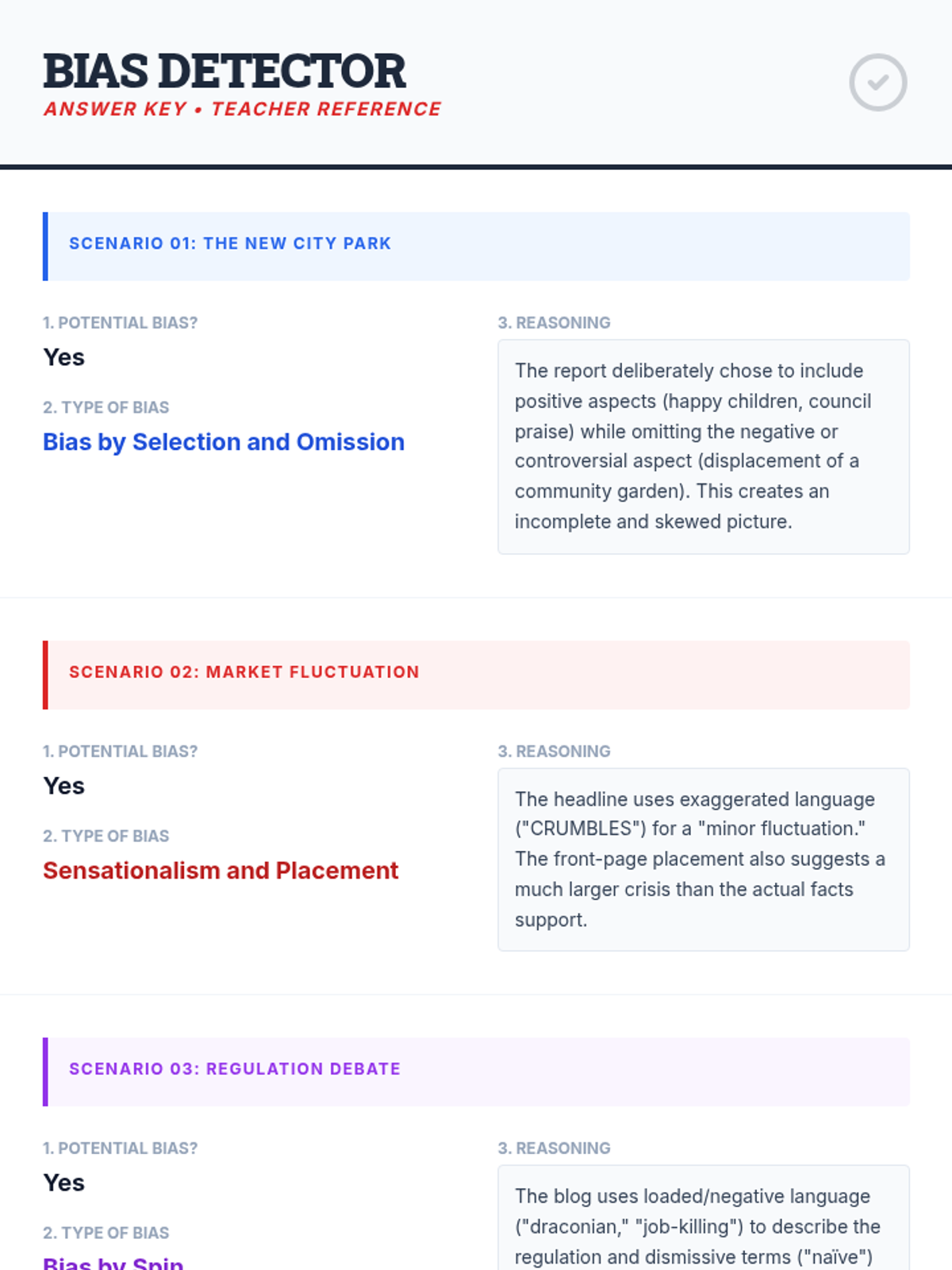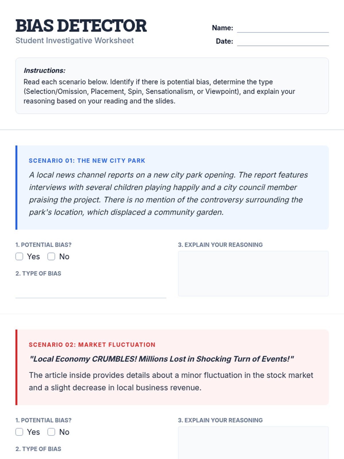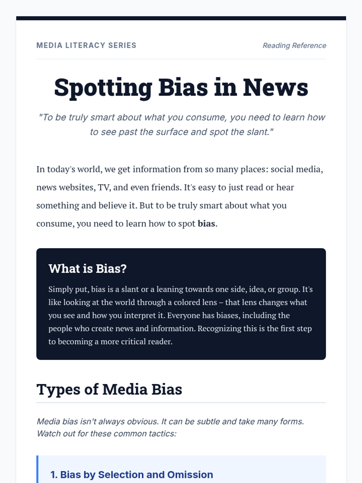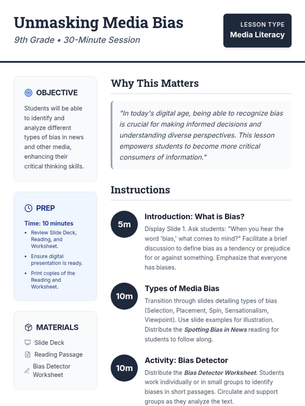 A 30-minute lesson for 9th-grade students to identify and analyze various types of media bias, including selection, placement, spin, sensationalism, and viewpoint. Students engage in guided discussion and practical analysis of news scenarios.