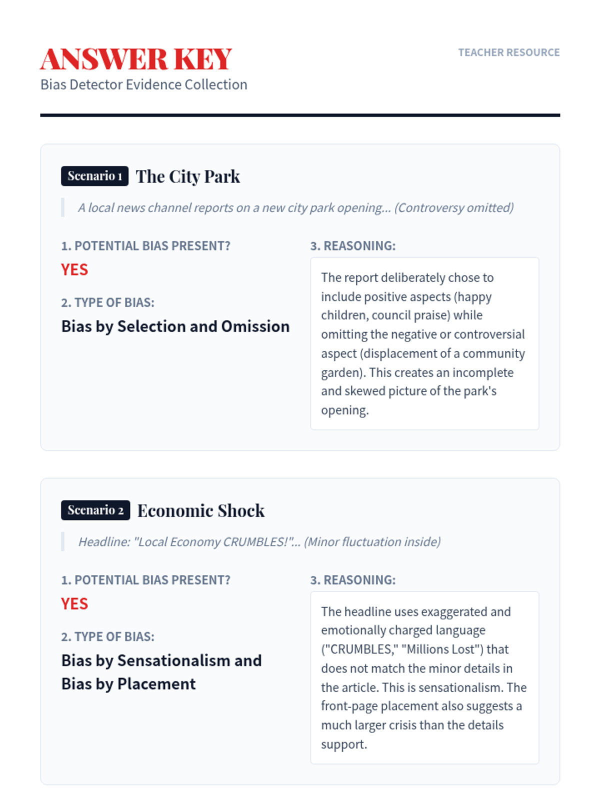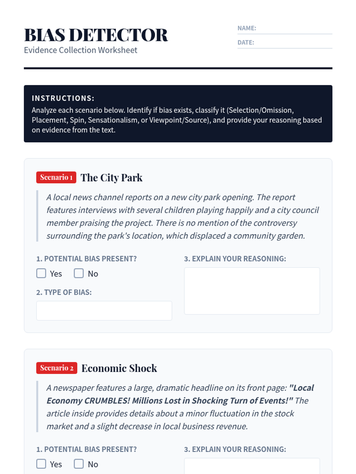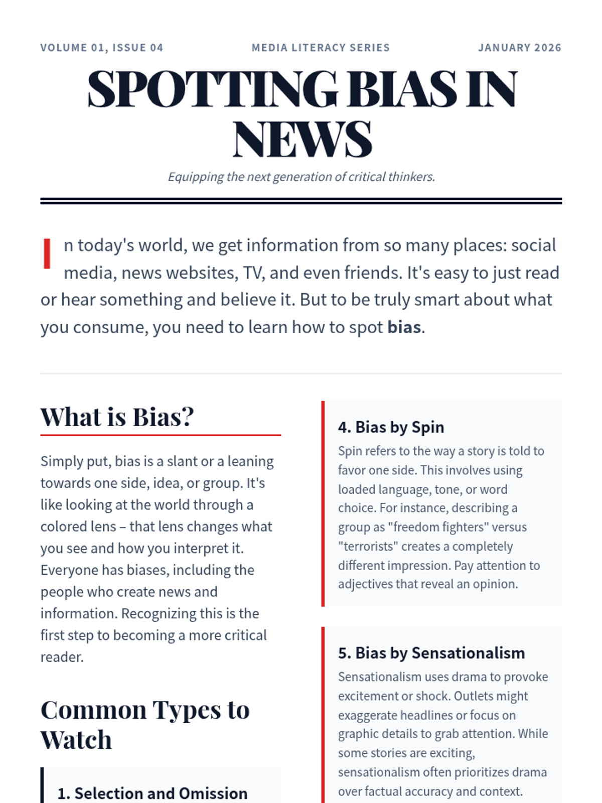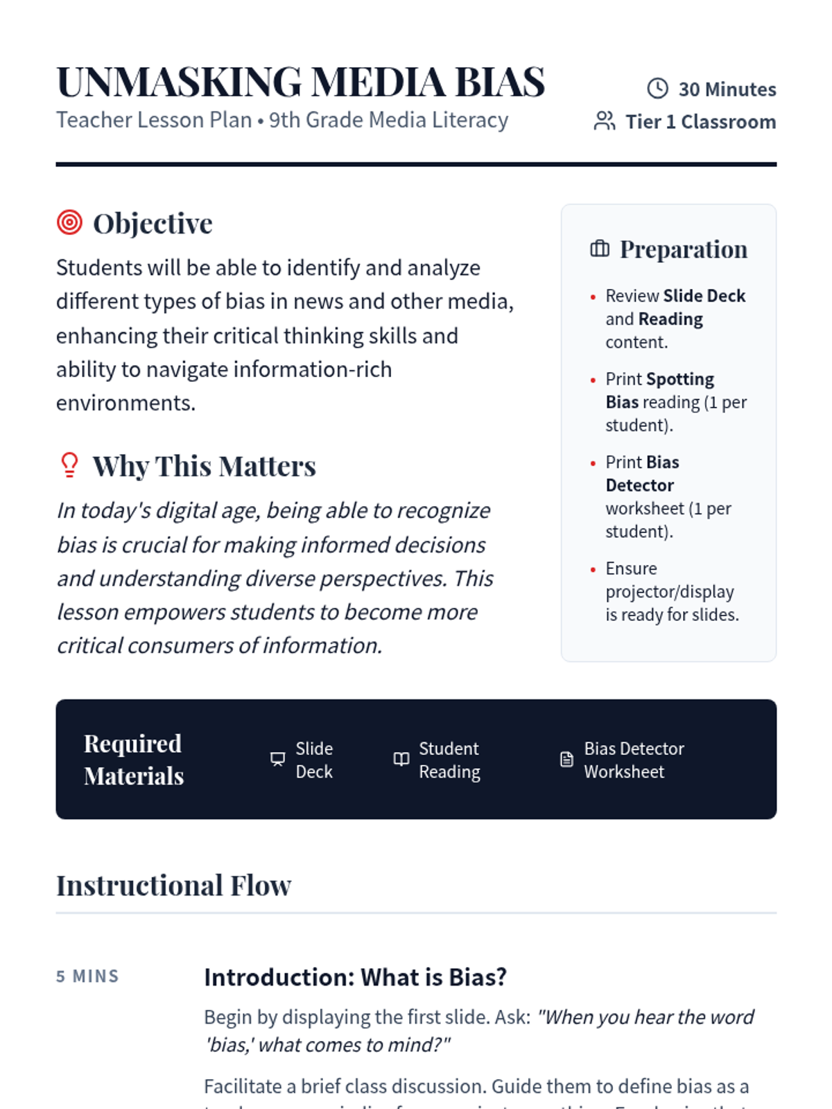 A 30-minute lesson for 9th graders to identify and analyze different types of media bias, including selection, placement, spin, and sensationalism. Students engage with a presentation, a reading passage, and a practical detection worksheet.