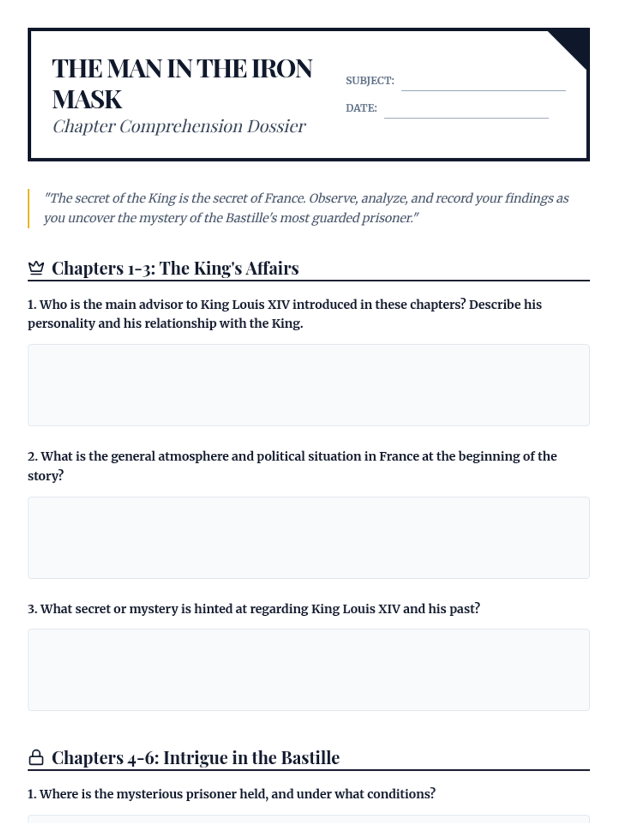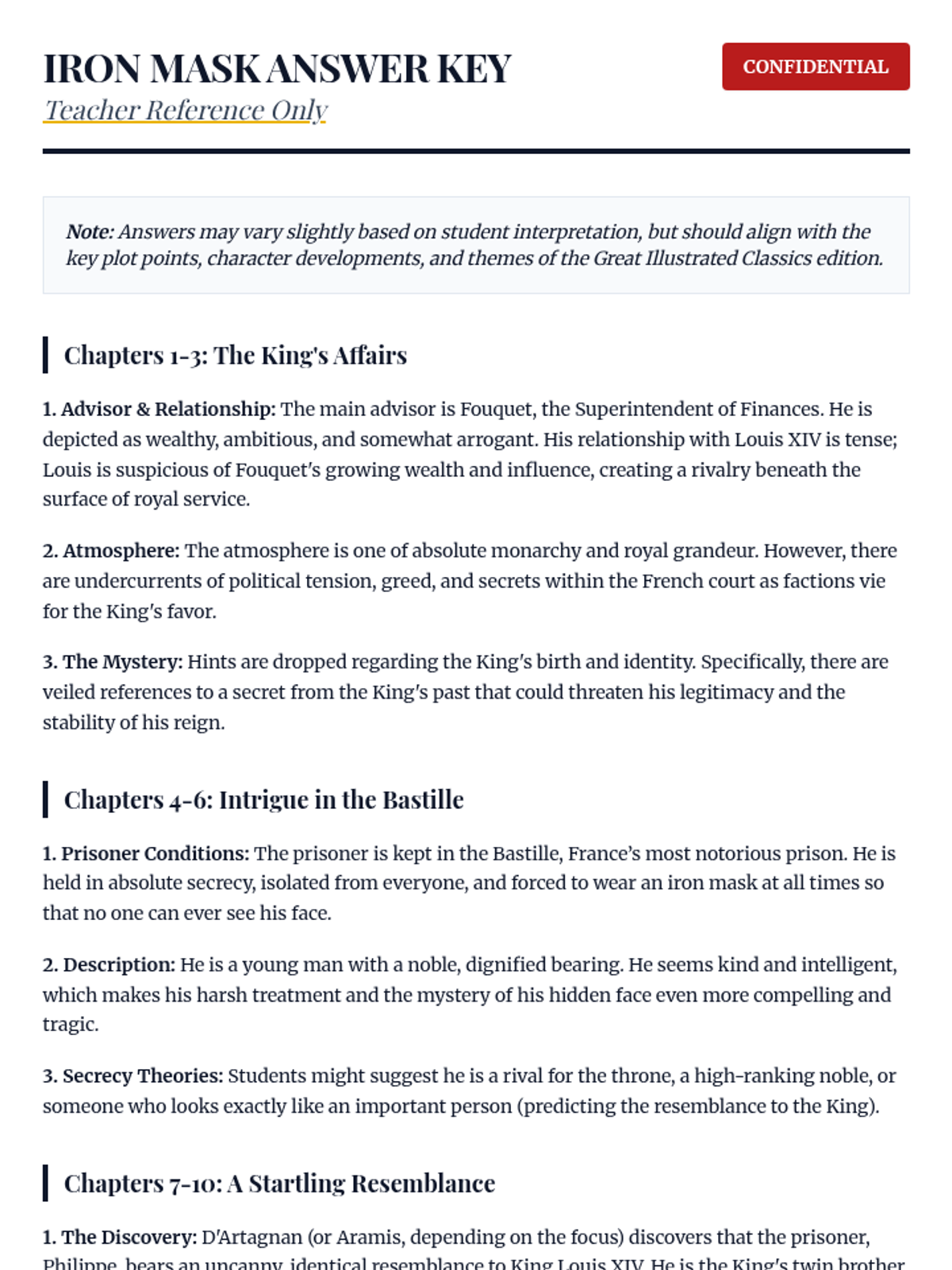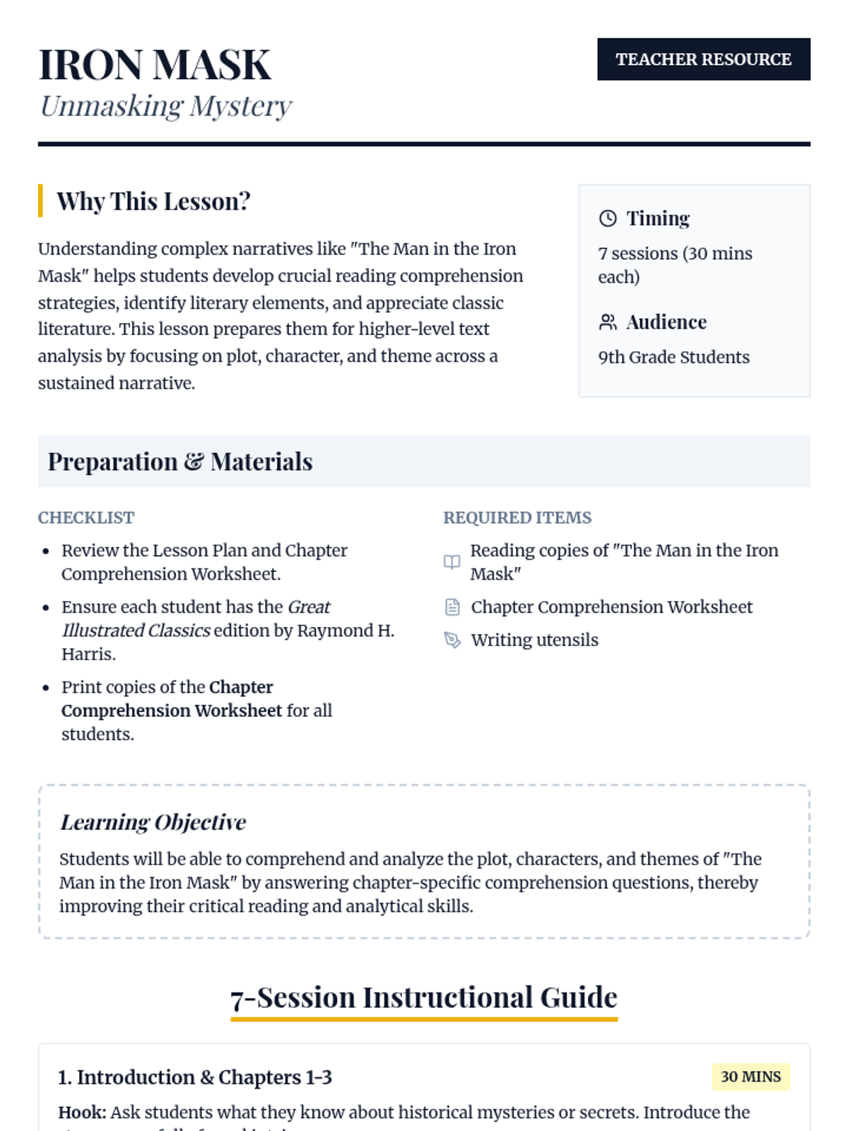 A 7-session unit for 9th-grade students exploring Alexandre Dumas' classic tale of mystery and royal intrigue. Students analyze character development, plot twists, and the historical context of 17th-century France.