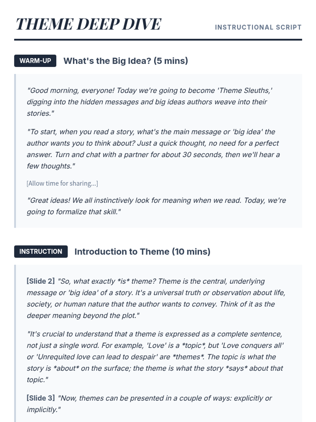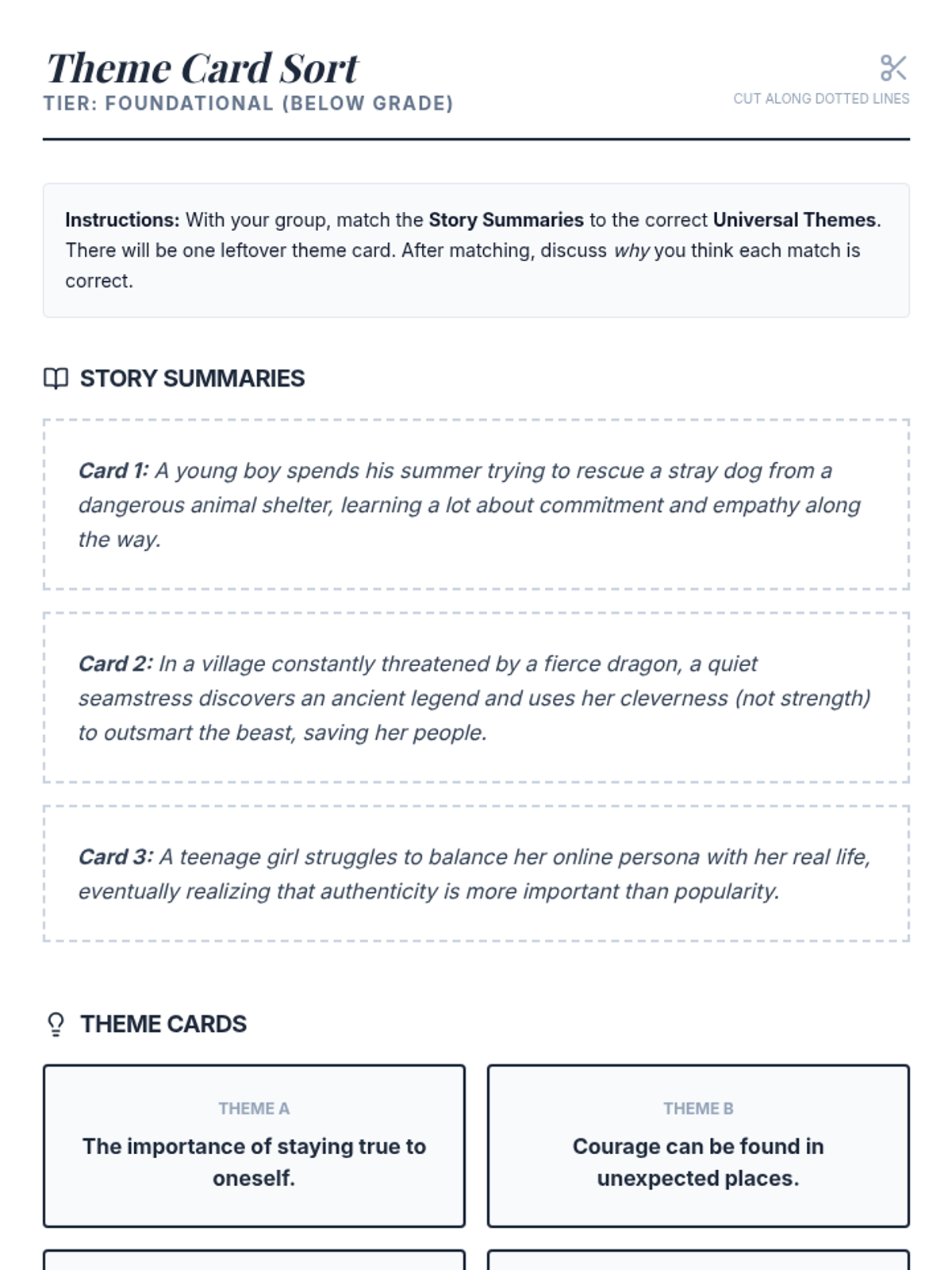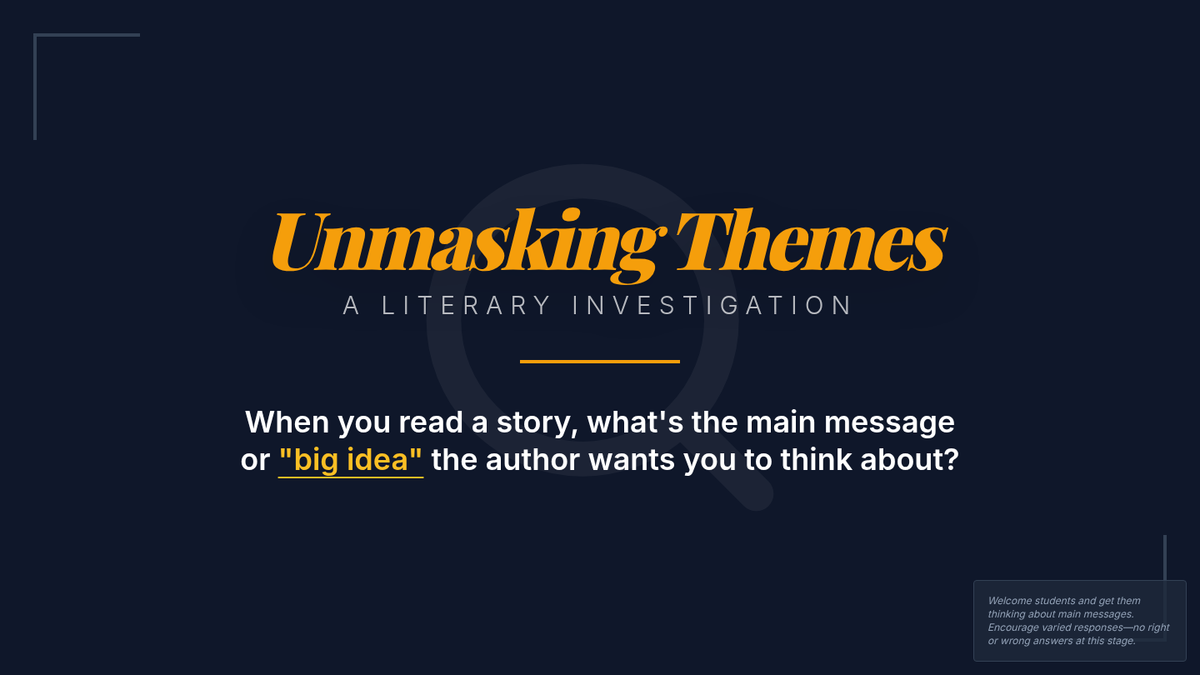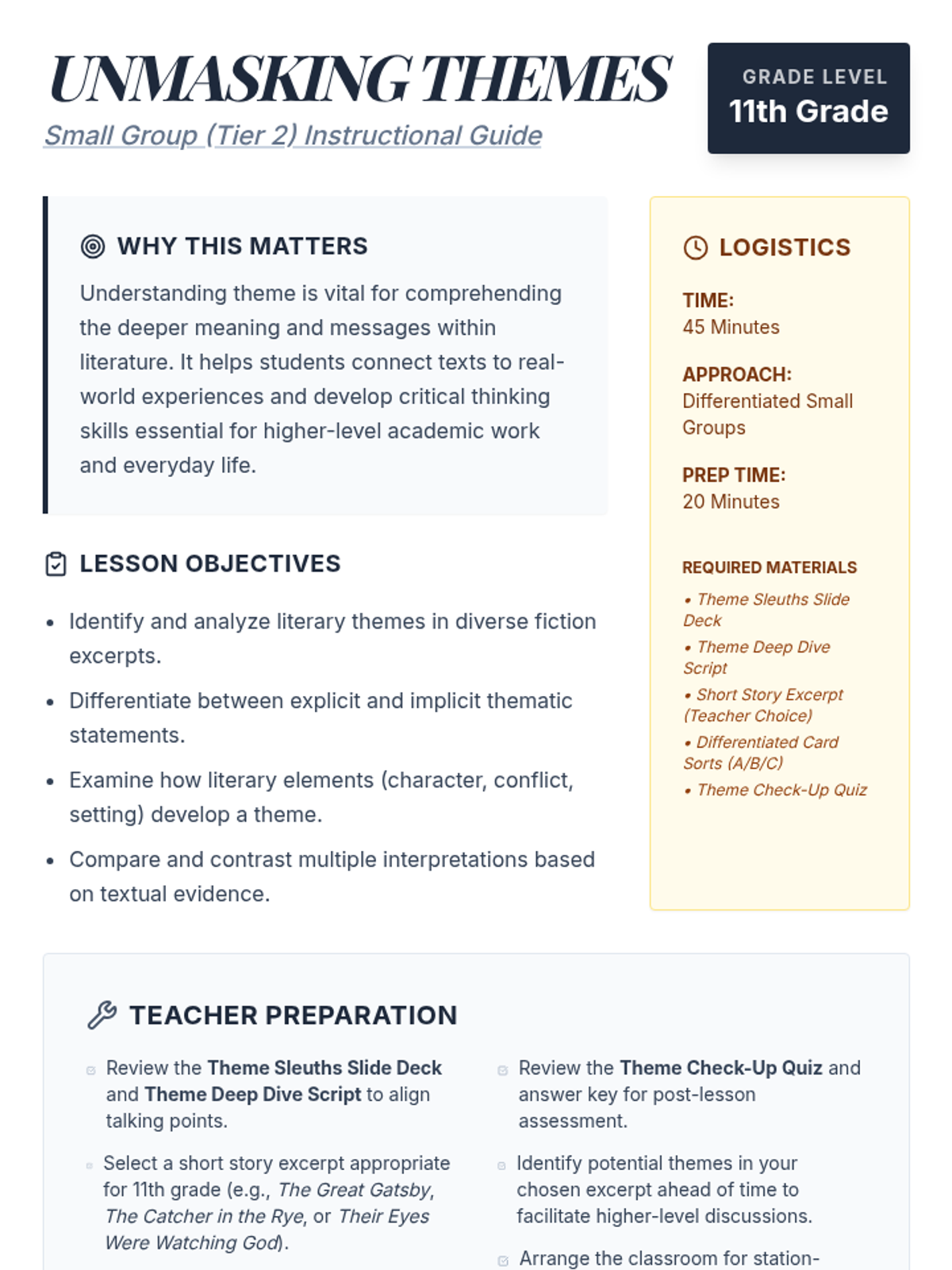 A small-group Tier 2 lesson for 11th-grade students focused on identifying, differentiating, and analyzing literary themes using a detective/sleuth metaphor. Students work through differentiated card sort activities to uncover universal truths in fiction.