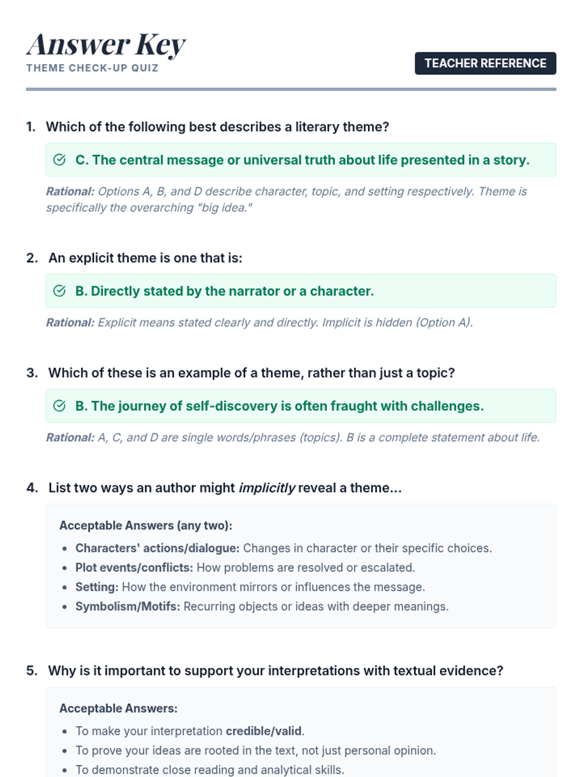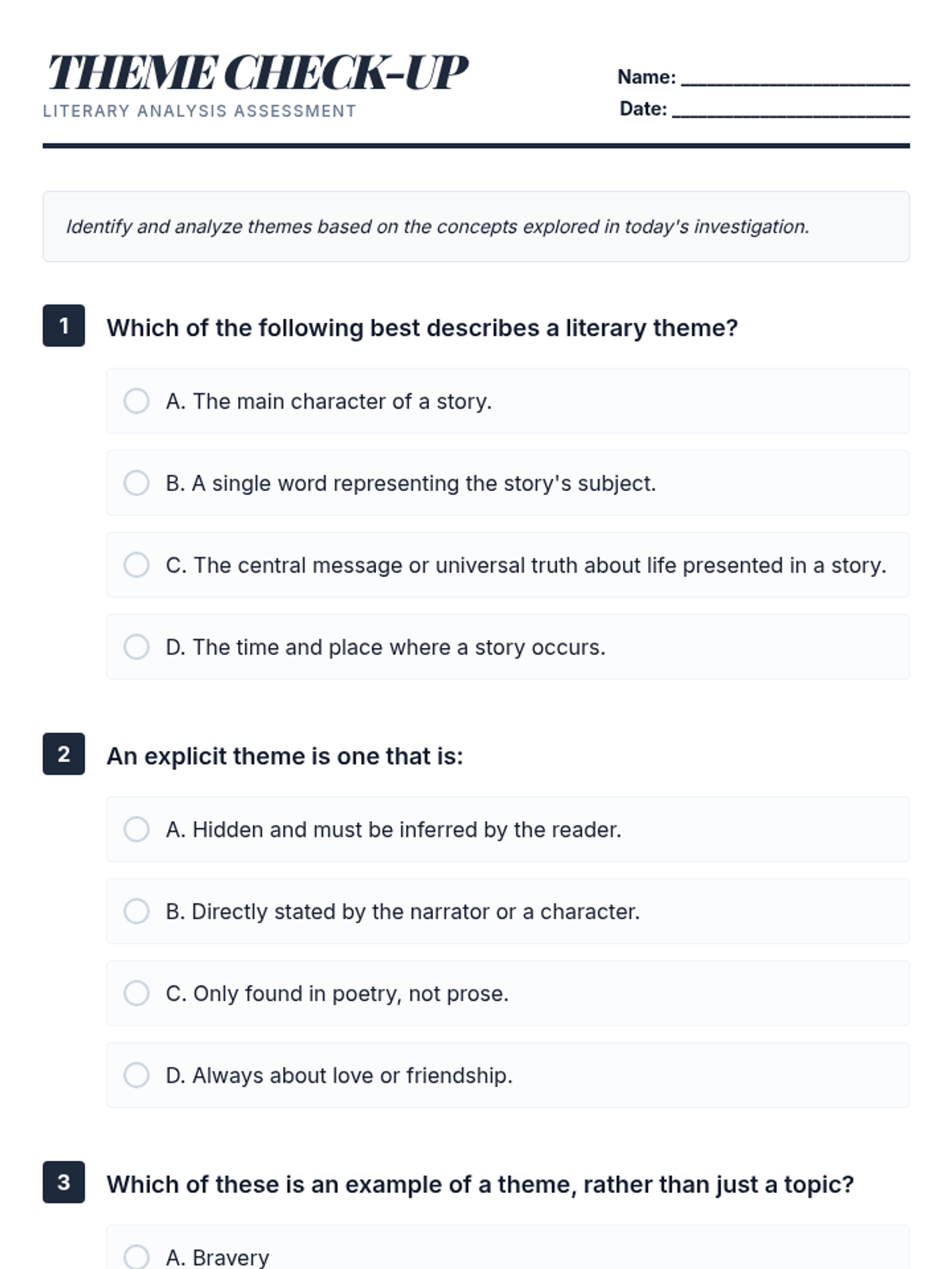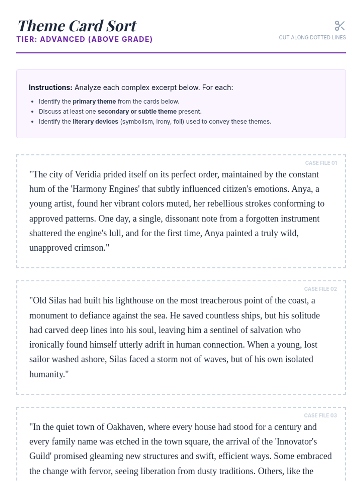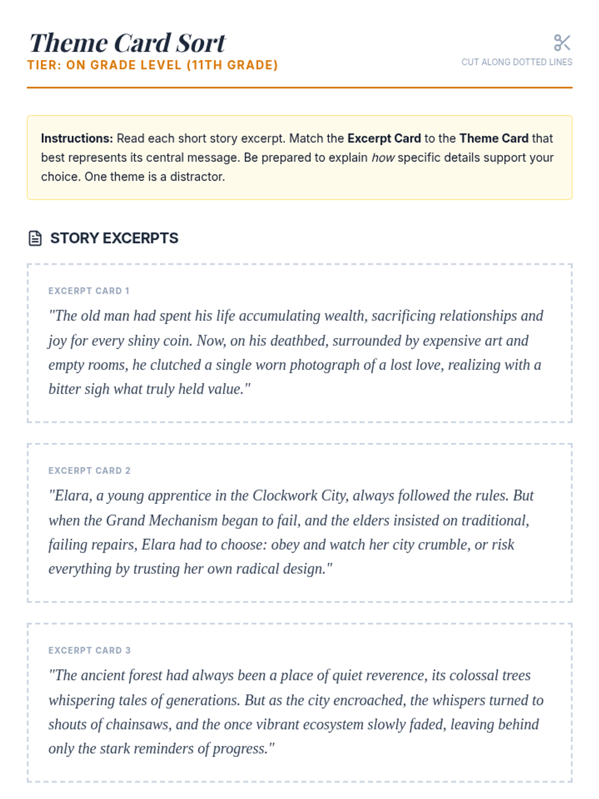 A small-group Tier 2 lesson for 11th-grade students focused on identifying, differentiating, and analyzing literary themes using a detective/sleuth metaphor. Students work through differentiated card sort activities to uncover universal truths in fiction.